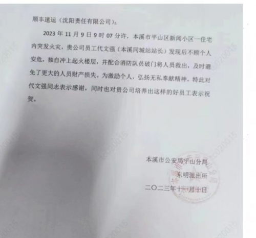 2023年11月9日,辽宁本溪顺丰同城站长代文强像往常一样去拜访客户。当他抵达客户所在的区域时,代文强突然发现附近小区正冒着滚滚浓烟。看到窗口不断飘出黑烟,代文强猜想6楼应该是着火了,于是让客户立马报警。
