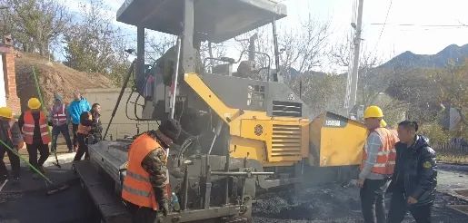 在北庄村大南沟段,道路改造工程施工现场,摊铺机、压路机分工合作、高速运转,工人们加紧清理、平整路面。