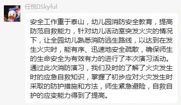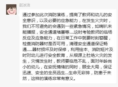 老师们通过这次演习都很有感悟,感觉到此次活动不仅增强了灭火防火意识,同时有利于促进我园教师安全责任意识,健全安全保障体系。在今后我们会更加重视安全工作,将安全教育渗透到一日生活的方方面面,作为首要工作常抓不懈,为孩子健康快乐地成长创造更好的环境。