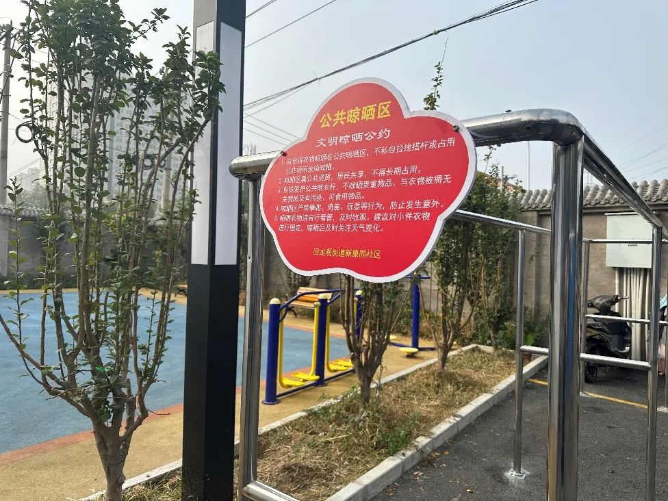 居民晾晒是刚需,宜居环境也是居民对美好生活的向往。为此,新康园社区在劝导整治不文明晾晒行为的同时,坚持“民生工程民意立项”,以居民需求为导向,聚焦解决问题。前期,社区工作人员发动党员及志愿者开展晾晒区点位走访及调研工作,通过线上调查问卷及入户调研的形式征集居民意见,形成晾晒需求“台账”,确定安装了两处公共晾晒区。