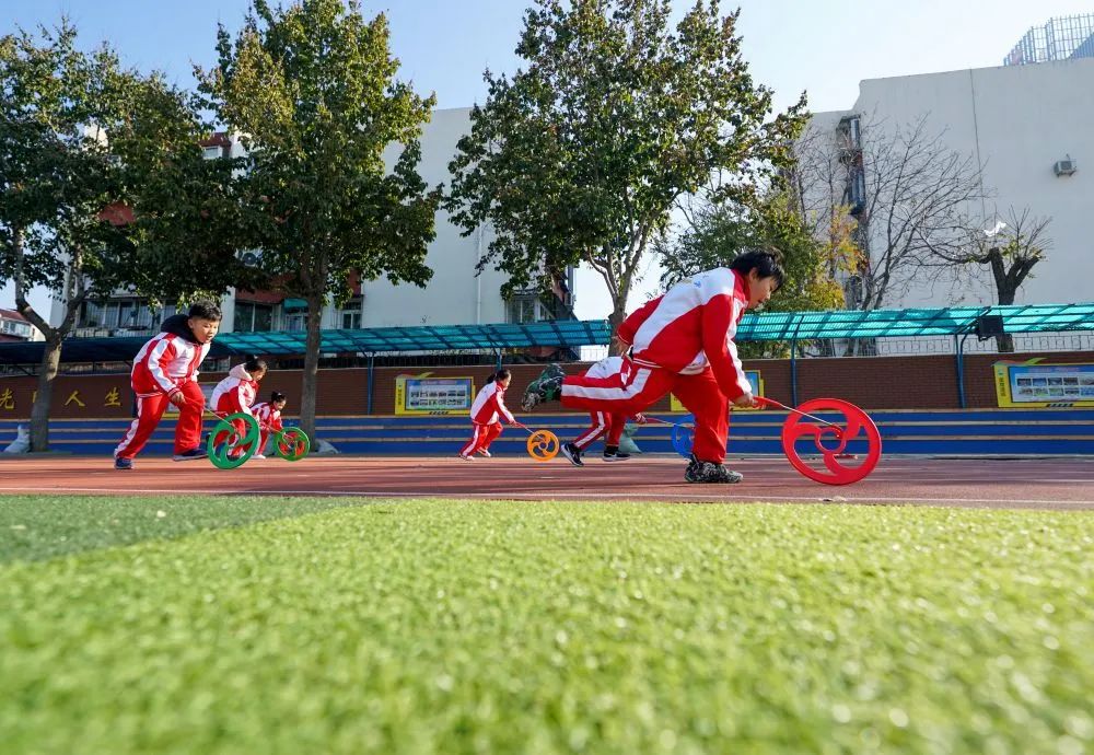 ↑11月17日,河北省唐山市路北区光明实验小学的学生利用课间时间玩滚铁环。新华社记者 牟宇 摄