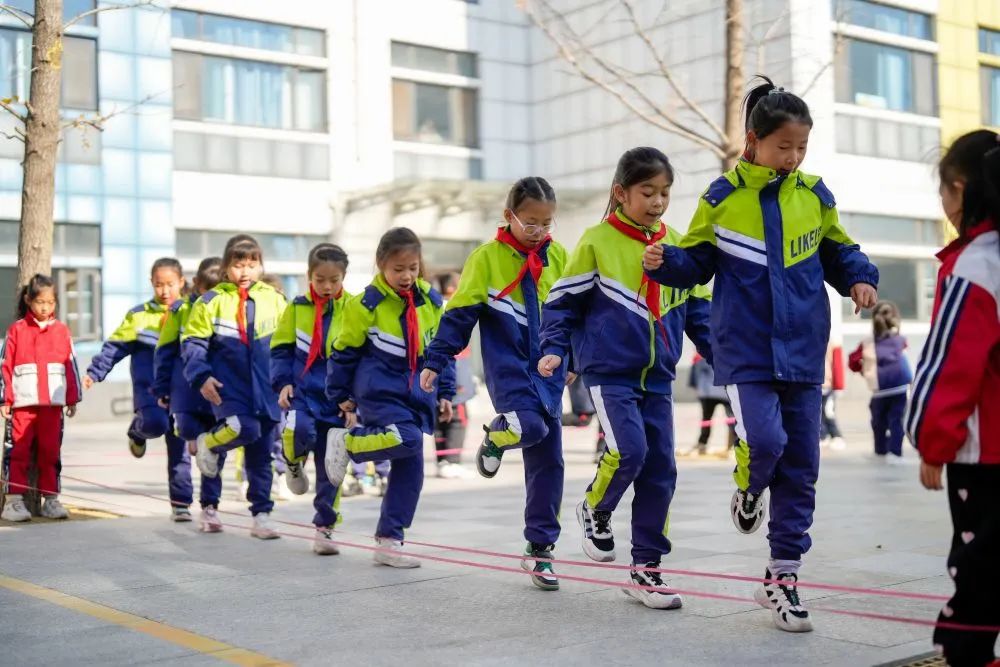 ↑11月17日,河北省唐山市路北区橡树湾小学学生利用课间时间跳皮筋。新华社记者 牟宇 摄
