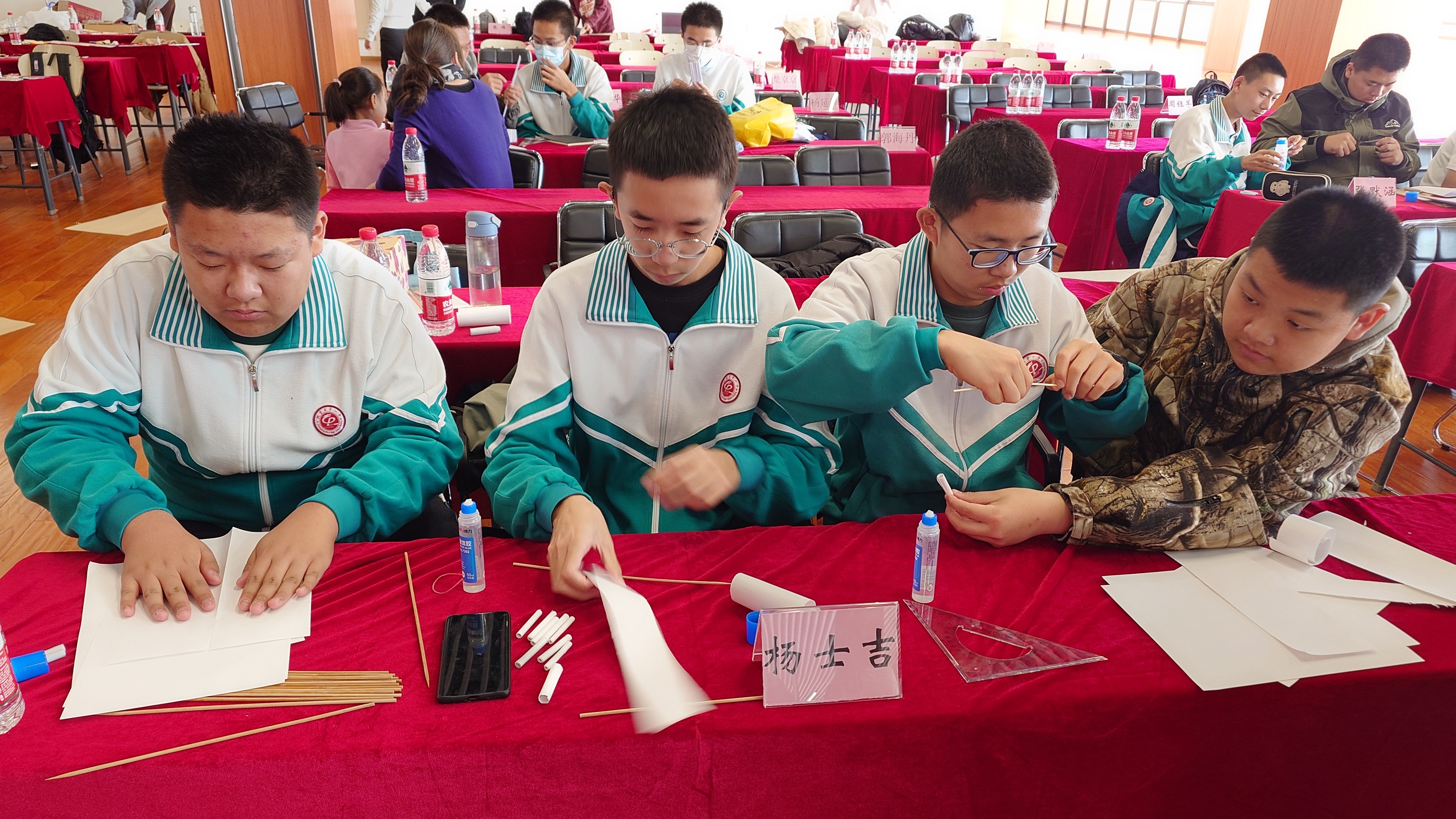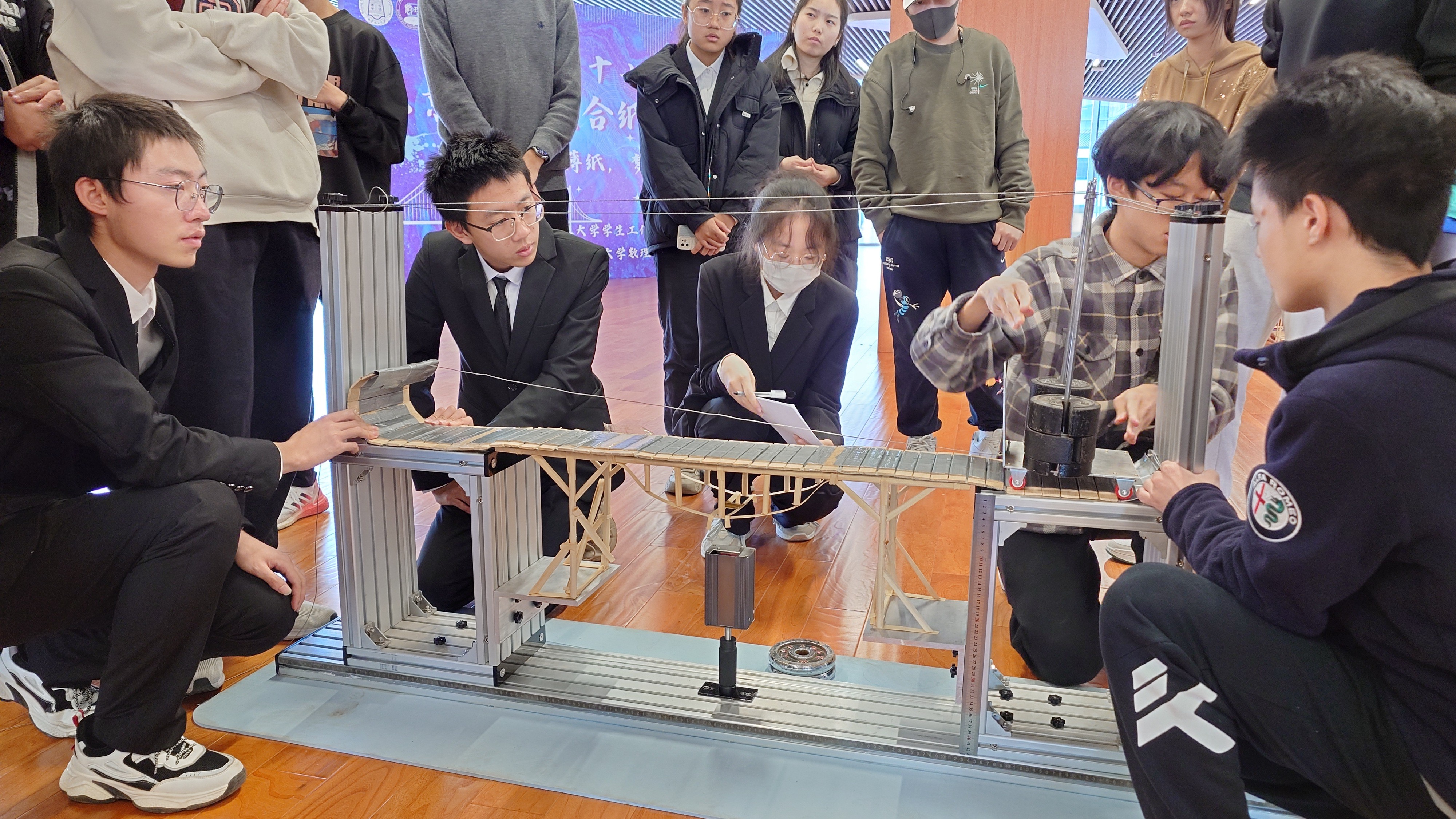 比赛现场,桥梁结构设计组的选手们在经过精细测算后现场制作竹皮质桥,通过动态承重、静态承重和桥梁挠度三个维度的比拼,高校组创意设计组选手则要进行承重较量。此外,本届大赛还新增了中小学生创意设计组的比赛,来自昌平属地学校的参赛选手带着作品来到比赛现场,体验科学魅力。