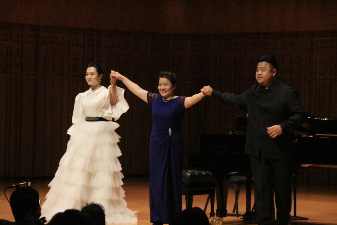 音乐会开始,陶敏霞一席红裙走上舞台。她一如往日,头发向后盘成一个发髻,利落、精神之余,也能感受到她平日的和蔼、亲切。上半场的曲目都是观众比较耳熟能详的作品。她首先为观众带来两首由古曲改编的钢琴作品《平湖秋月》《夕阳箫鼓》,在古韵中开启了这场音乐会。陶敏霞不仅是钢琴演奏方向的硕士研究生导师,同时也是艺术指导方向的硕士研究生导师。音乐会的艺术歌曲环节中,陶敏霞演奏,她的儿媳、女高音程文慧演唱了古诗词艺术歌曲《幽兰操》,她的儿子、男高音歌唱家扣京带来《关雎》,其后三个人共同合作了一曲《在水一方》。之后,陶敏霞演奏了舞剧《红色娘子军》选段“快乐的女战士”“常青就义”。
