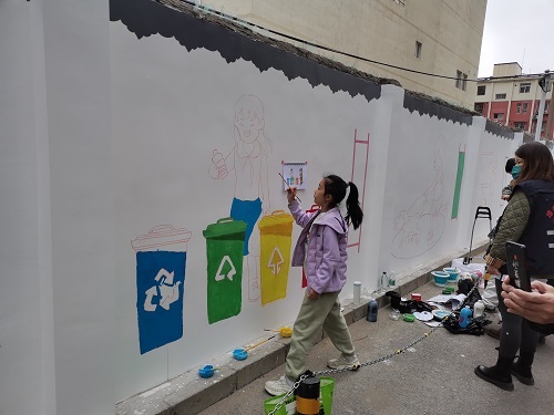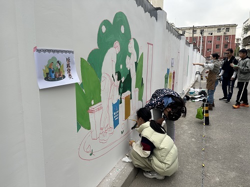 活动当天,小区文化能人、睦邻层长、志愿者以及青少年绘画爱好者共同参与。艺术美院的老师认真细致地讲解涂鸦的构图、配色、上色等技巧及需要注意的问题。随后,大家纷纷拿起手中的画笔、水桶、颜料、刷子等工具认真地在墙上涂鸦起来。大家将“人文关怀、垃圾分类、尊老敬老、健康生活、安全环境”融入笔触之中,缤纷的元素在墙面上游走,每一抹色彩都洋溢着快乐,交织成一幅美丽的画作。