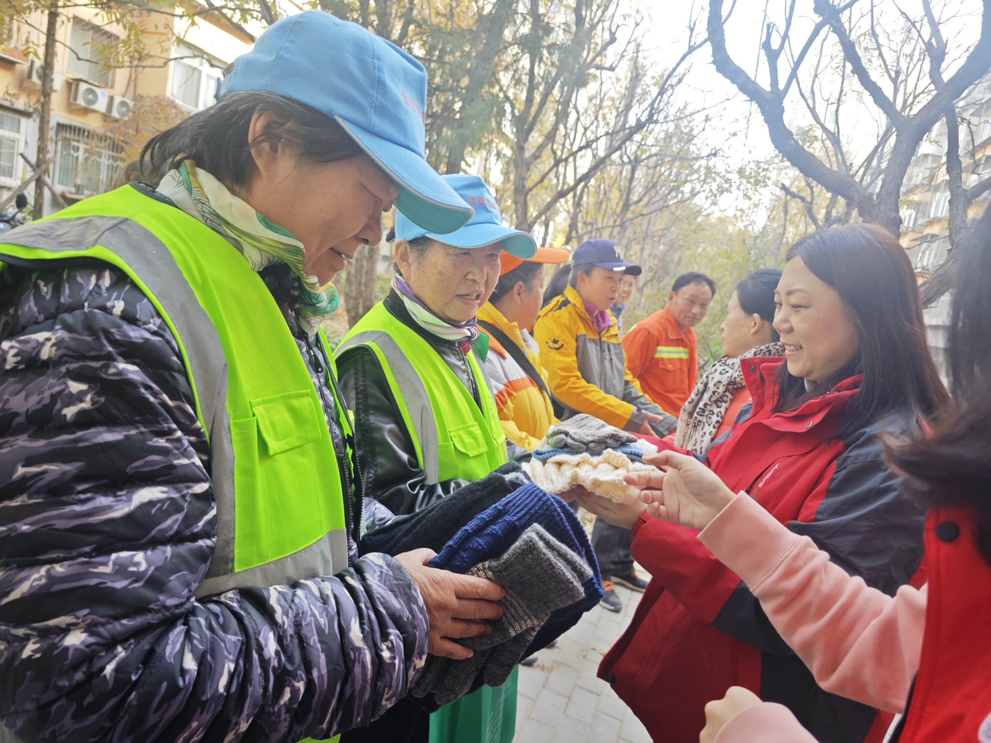经过一个多小时的编织,100余件精心编织的帽子、手套和围巾完成。这些御寒物品不仅外观精致,而且十分保暖,非常适合在寒冷的冬天使用。随后,社区工作者和老街坊们将他们精心编织的毛衣制品送给了户外工作者们。