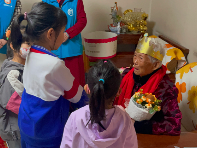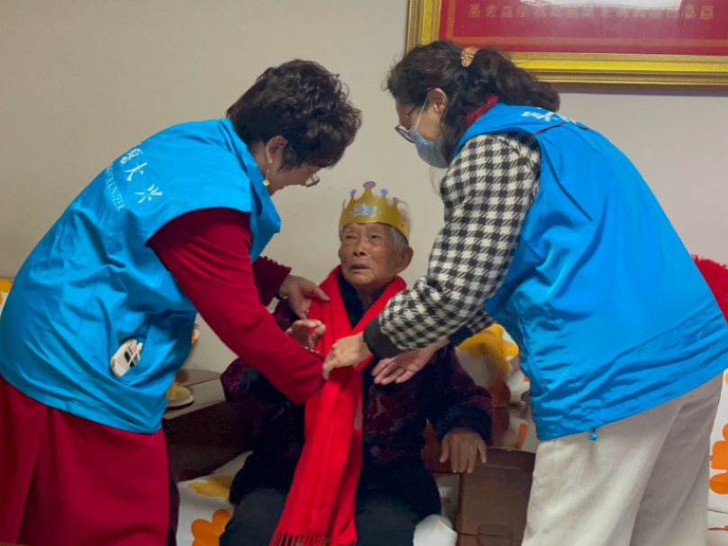 “奶奶,我来帮您戴生日帽,祝您生日快乐!”庆生活动中,“小郁米”志愿者代表给康奶奶戴上生日帽,“优郁米”志愿者代表为老人送上象征“长寿”的红围巾,大家围坐在老人身边,唱生日歌、切生日蛋糕,现场气氛充满温馨与欢乐,老人脸上洋溢着幸福的笑容。“谢谢‘小朋友’们!这是我过的最特别的生日!”在大家的陪伴和祝福中,康奶奶度过了自己愉快的“百岁”生日。