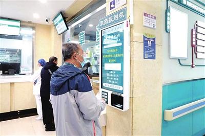 在甘家口社区卫生服务中心一层大厅的药房外,患者在取药报到机等待取药