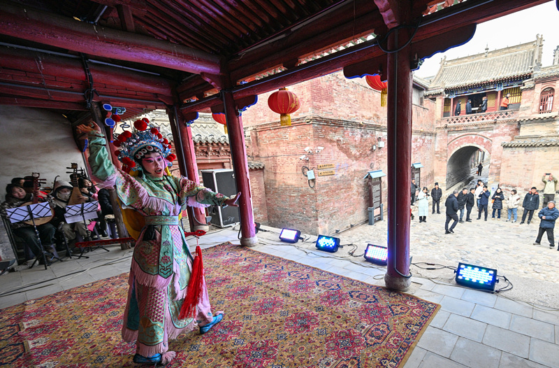 蔚县秧歌演艺有限责任公司演员顾欣蕊在蔚县暖泉镇西古堡村的双耳戏楼表演蔚县秧歌《扈家庄》选段(11月26日摄)。蔚县秧歌是河北省蔚县传统戏剧,国家级非物质文化遗产。