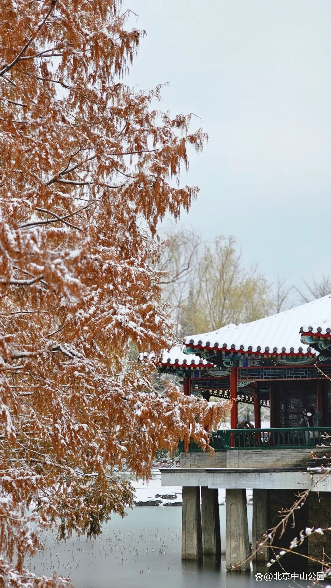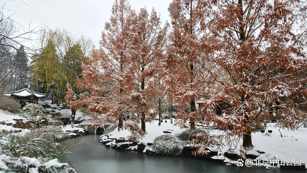 水榭雪纷飞,冰面仙灵动。岸边留有秋韵的水杉,将雪色点缀得不再单调。