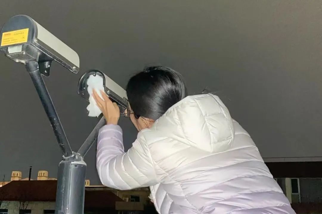 区气象局工作人员维护天气现象观测仪。