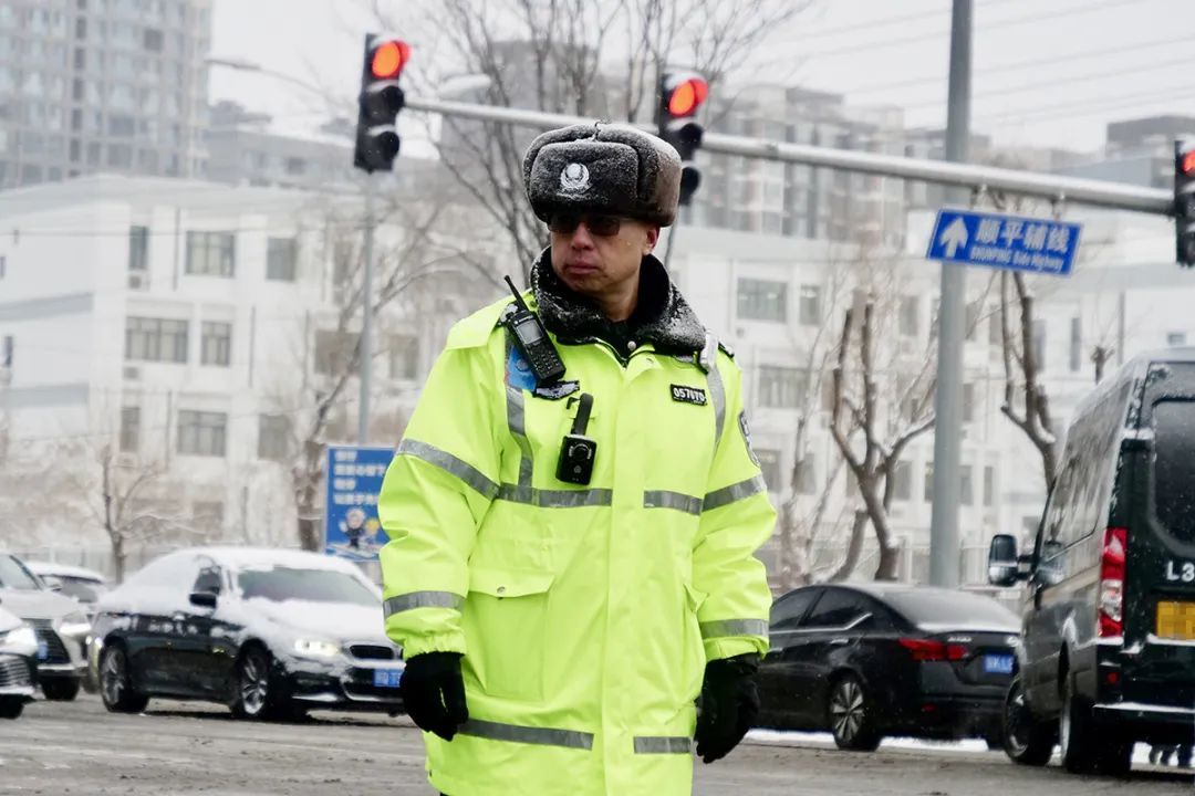 顺平辅线与拥军路交叉口,交警雪中执勤。