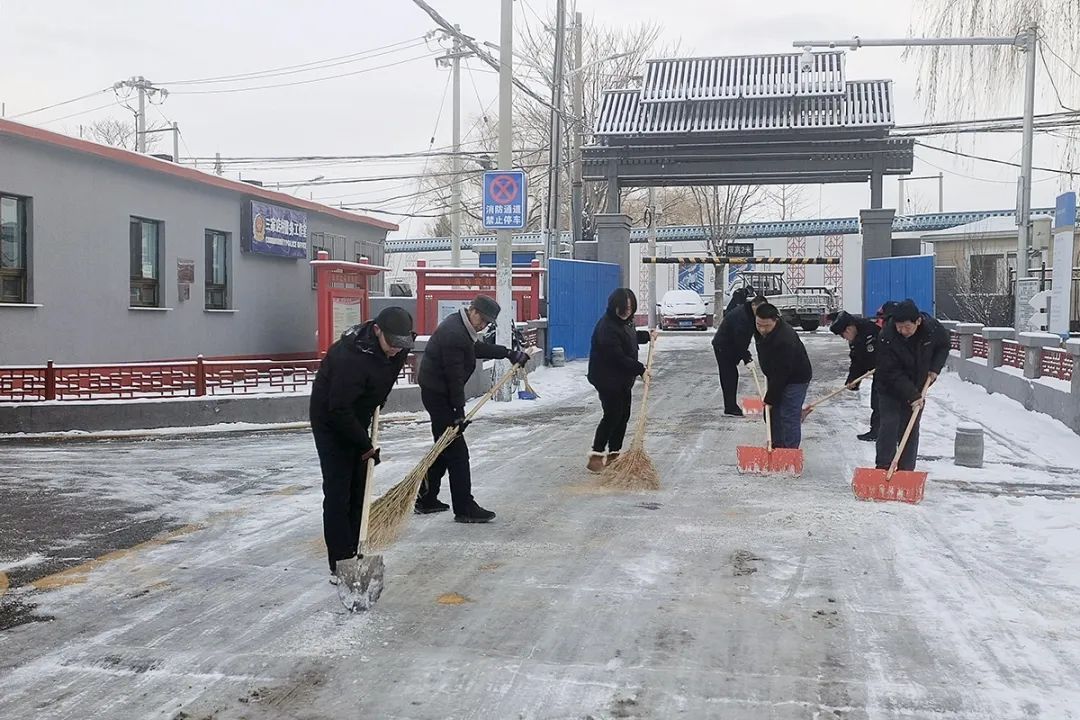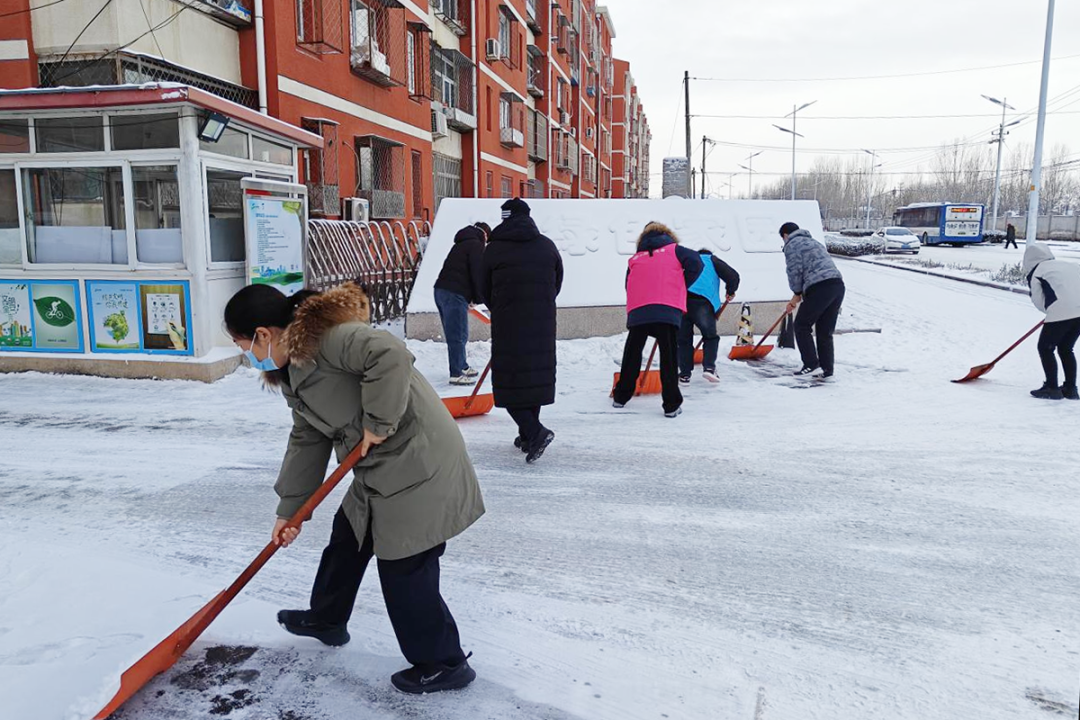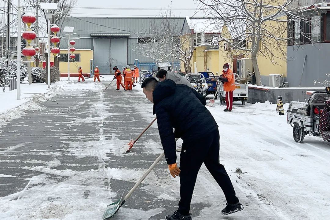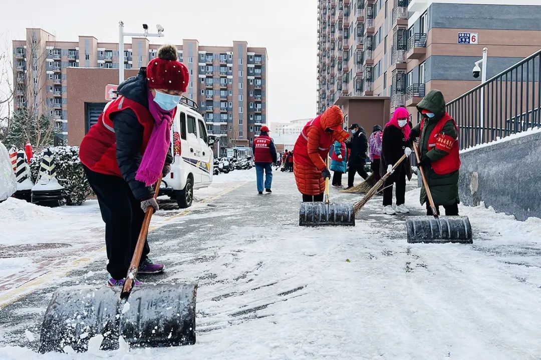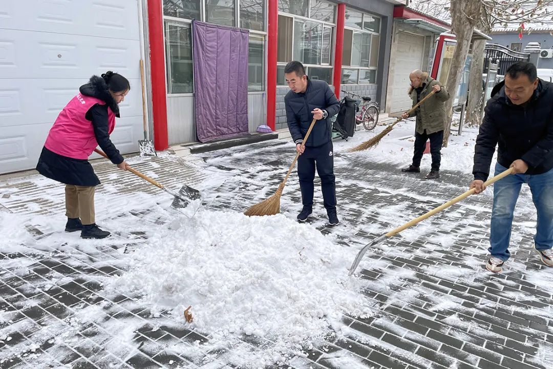 北小营镇永利社区工作人员、志愿者做好扫雪铲冰工作。