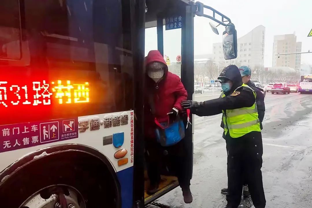 区交通局工作人员帮助乘客有序下车。