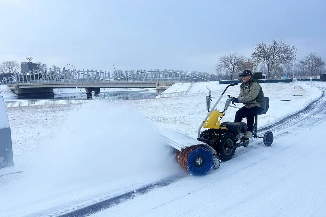 顺义奥林匹克水上公园工作人员使用扫雪机除雪。