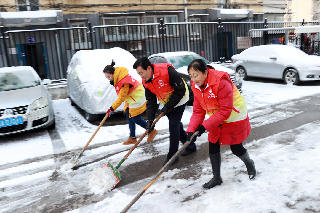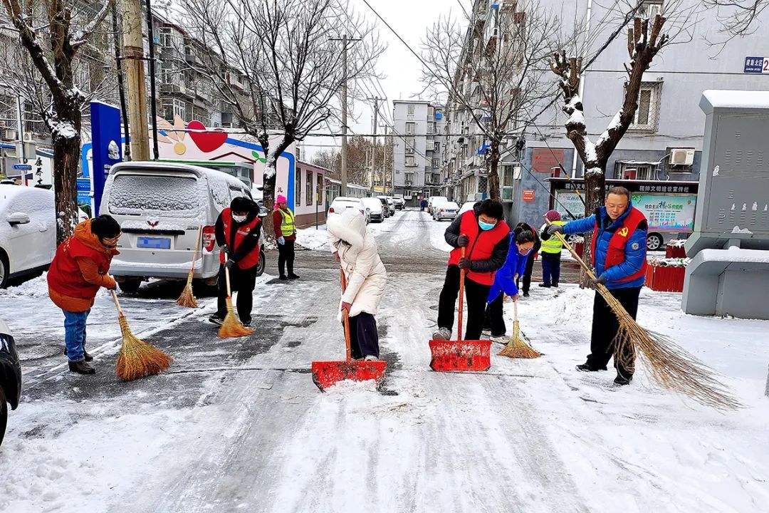 胜利街道党员、志愿者清理道路积雪。