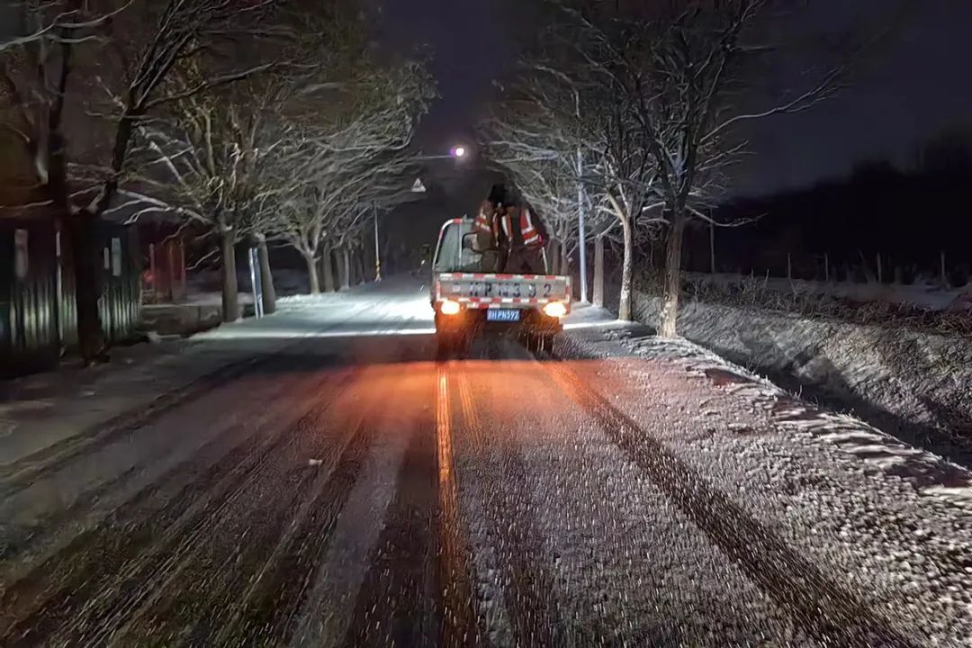 龙湾屯镇工作人员第一时间撒布融雪剂。