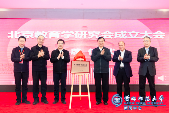 牛青山对研究会的成立表示热烈祝贺,强调研究会应通过强化党建引领,营造良好学术生态,不断扩大学术影响力,团结服务好广大会员,推动各项工作全面起步、全面开局。缪劲翔向与会领导和嘉宾表示热烈欢迎,指出研究会的成立是学校教育学科建设的重要里程碑,学校将全力为研究会的发展保驾护航。杨银付向研究会表示诚挚祝贺,提出中国教育学会愿与研究会、首都师范大学一道携手努力,深度合作,共同为繁荣发展教育科学、加强建设高质量教育体系、加快建设教育强国贡献学术组织的力量。李奕对研究会的成立表示衷心祝贺,提出研究会作为推动教育理论创新和实践变革,加快推进首都基础教育高质量发展的重要力量,可在构建教育实践生态、加强跨学科研究合作、强化对新技术的应用研究等方向重点着力并贡献研究力量。随后,牛青山、李奕、杨银付、孟繁华、缪劲翔、荣大力共同为研究会揭牌。