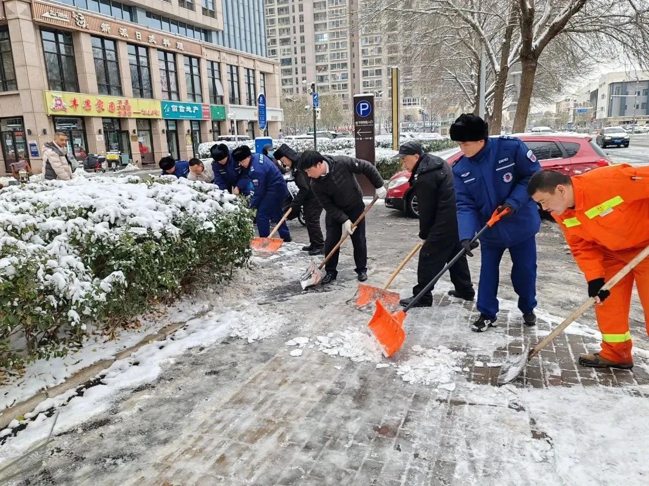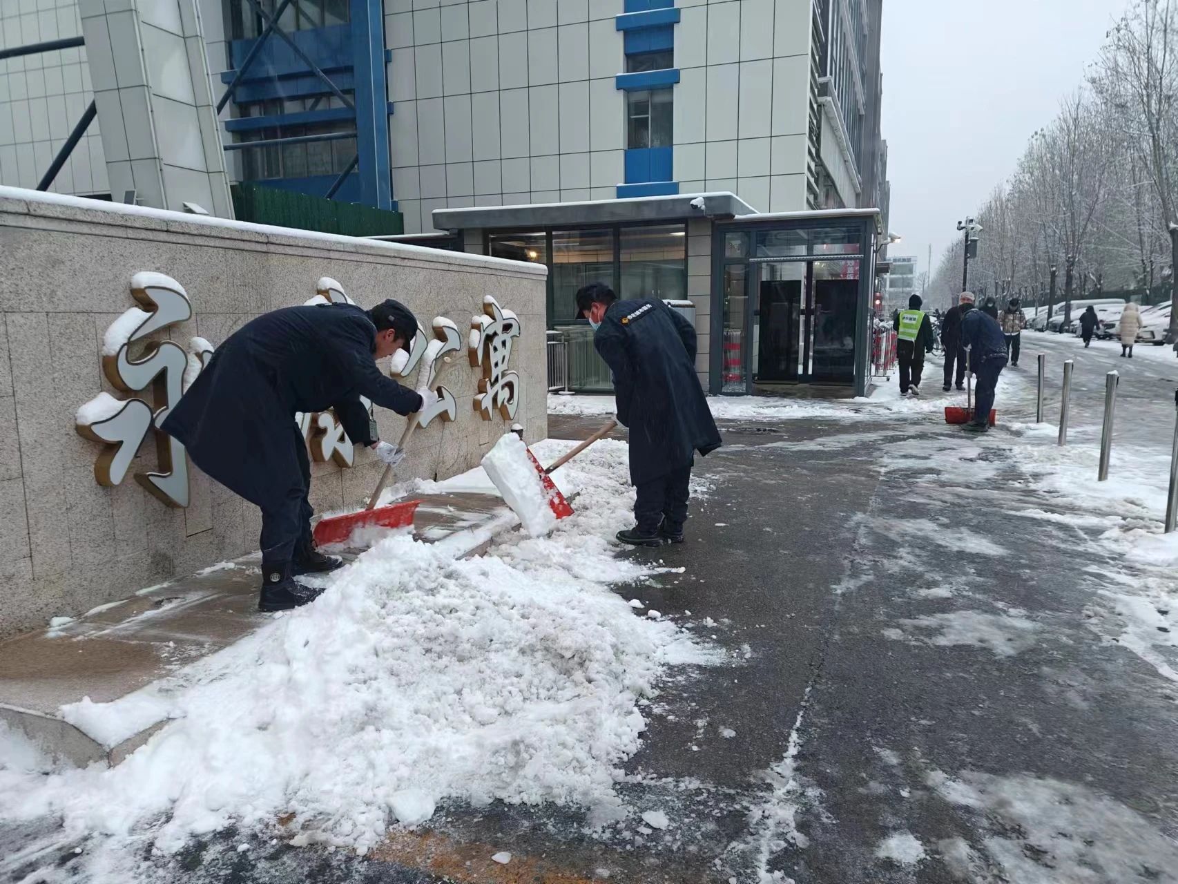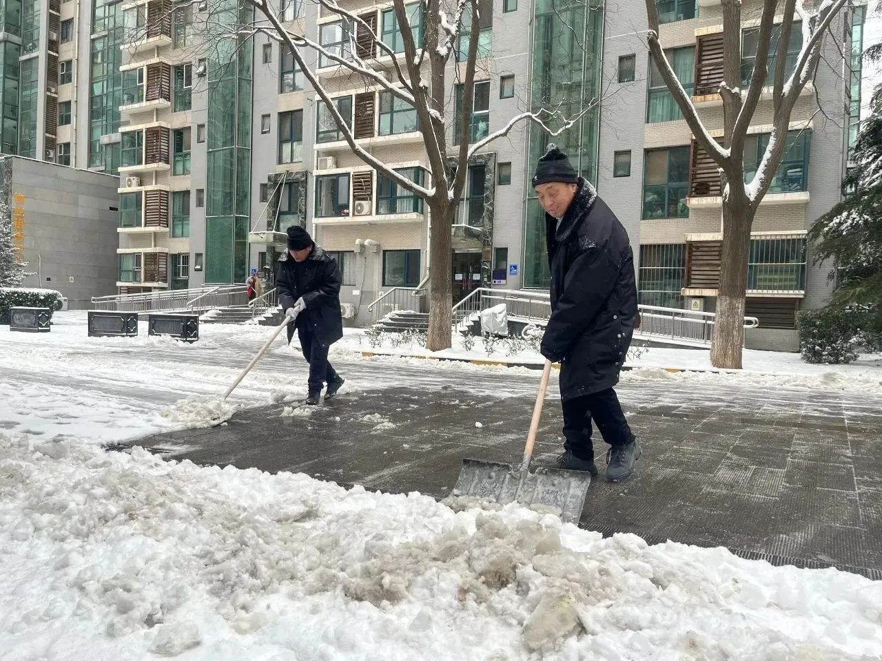 相同的场景也出现在永康公寓大门口,10多位工作人员身着棉服,用雪铲为职工们出行的必经之路扫除障碍,清除安全隐患。