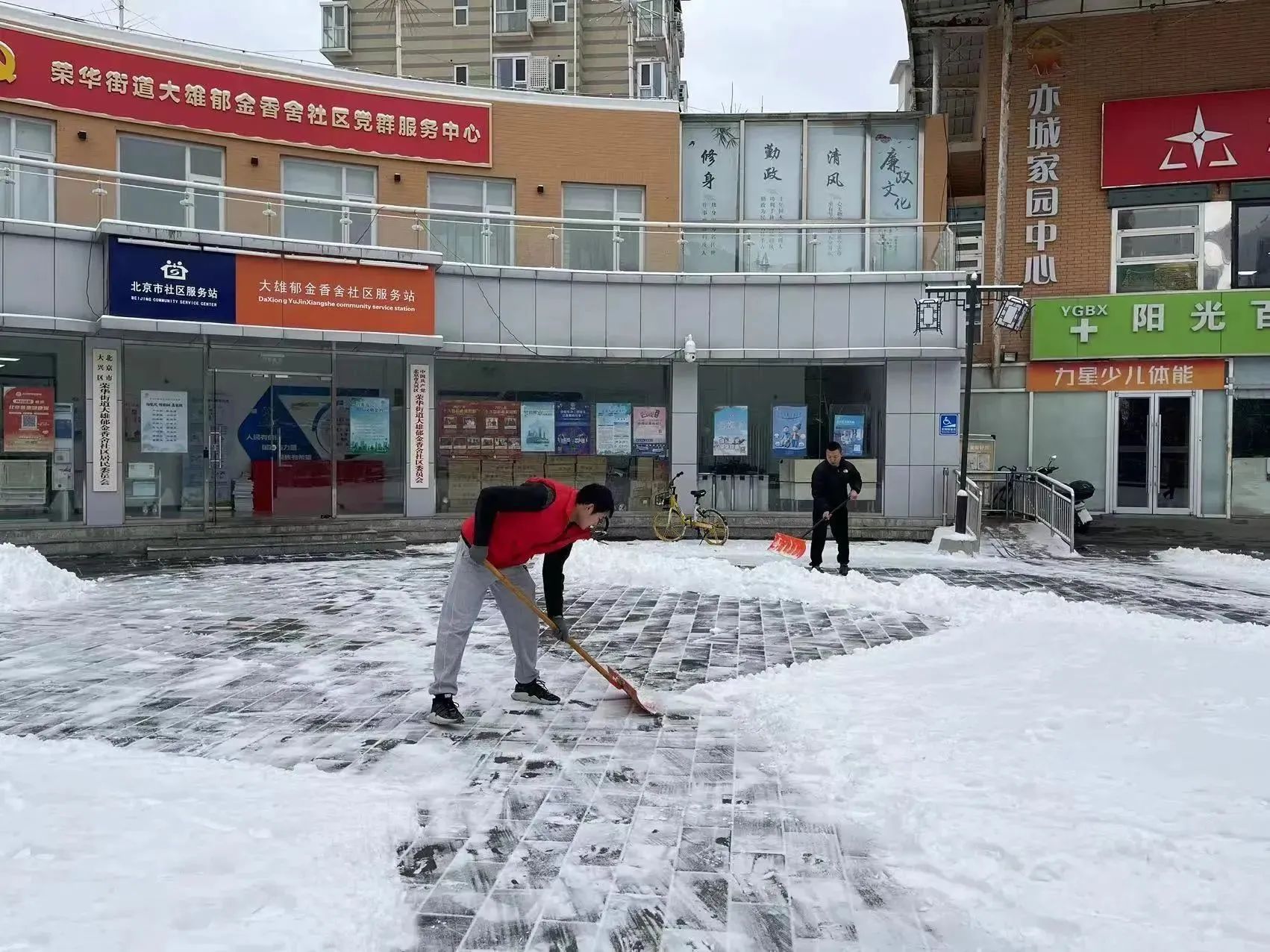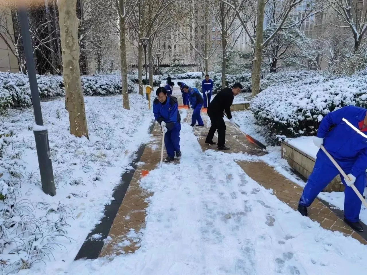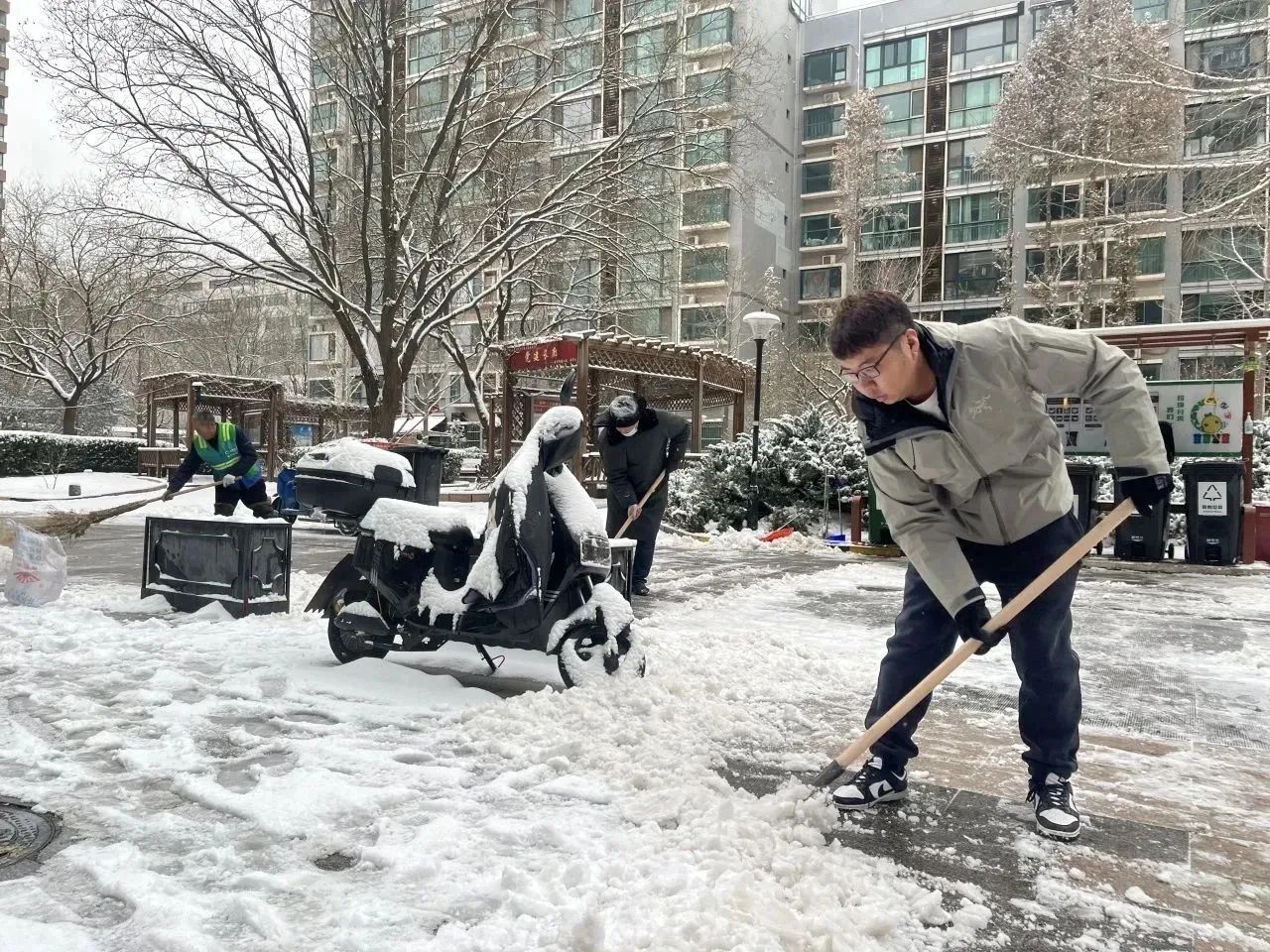 相同的场景也出现在永康公寓大门口,10多位工作人员身着棉服,用雪铲为职工们出行的必经之路扫除障碍,清除安全隐患。