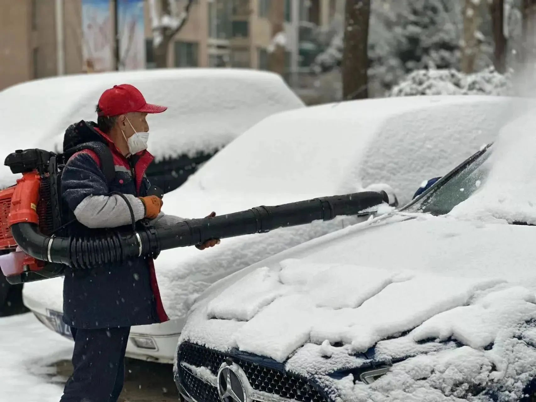 除了使用雪铲、铁锹、融雪剂等工具,浉城百丽小区还启用了一个“神器”吹风机,为当天早上急需出门的车主吹去车窗上的厚厚积雪,为居民节省清理时间。贴心服务在居民微信群得到刷屏点赞。业主菲姐晒图说:“这个服务非常好,给物业点个赞!”