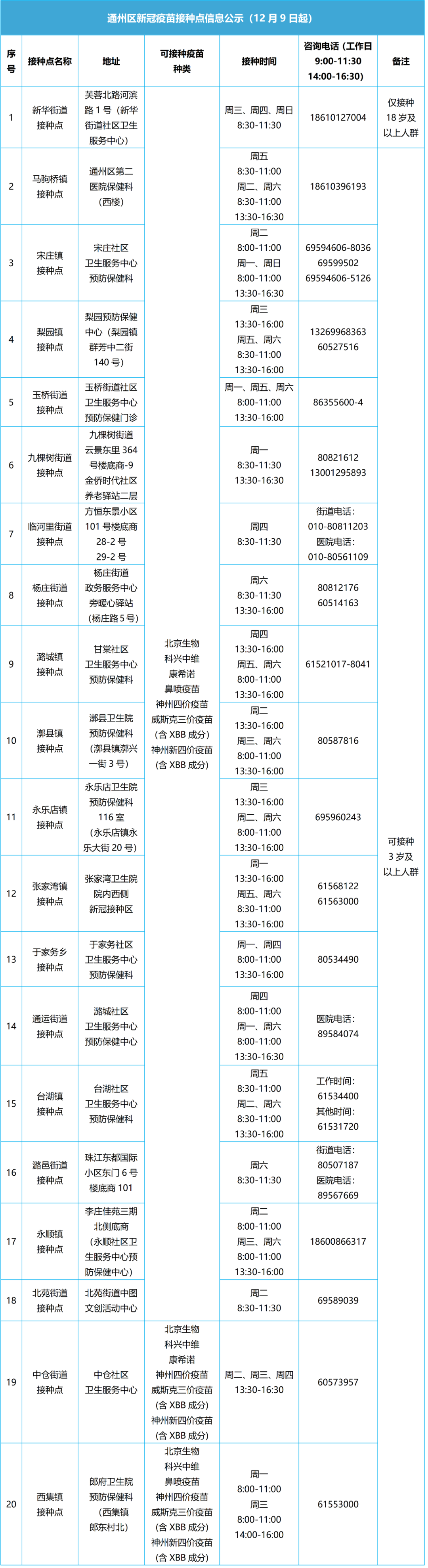 通州20个新冠疫苗接种点均可接种含XBB成分的新冠疫苗名单↓↓