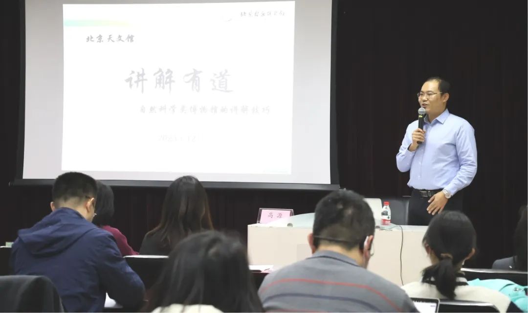 为进一步加强北京天文馆科普志愿讲解队伍建设,全面提升志愿讲解员的综合素质和业务员能力,着力打造一支素质过硬、业务精湛的科普志愿讲解团队,2023年12月9日,北京天文馆“大火星”科普志愿讲座成功举办。国家自然博物馆副研究馆员高源以《讲解有道——浅谈自然科学类场馆讲解技巧》为题作科普讲座,馆内科技辅导员、科普工作者和“大火星”志愿服务队优秀志愿讲解员近60人共同聆听了讲座。