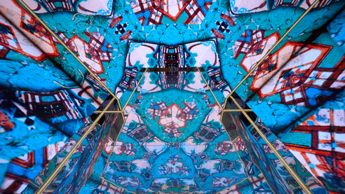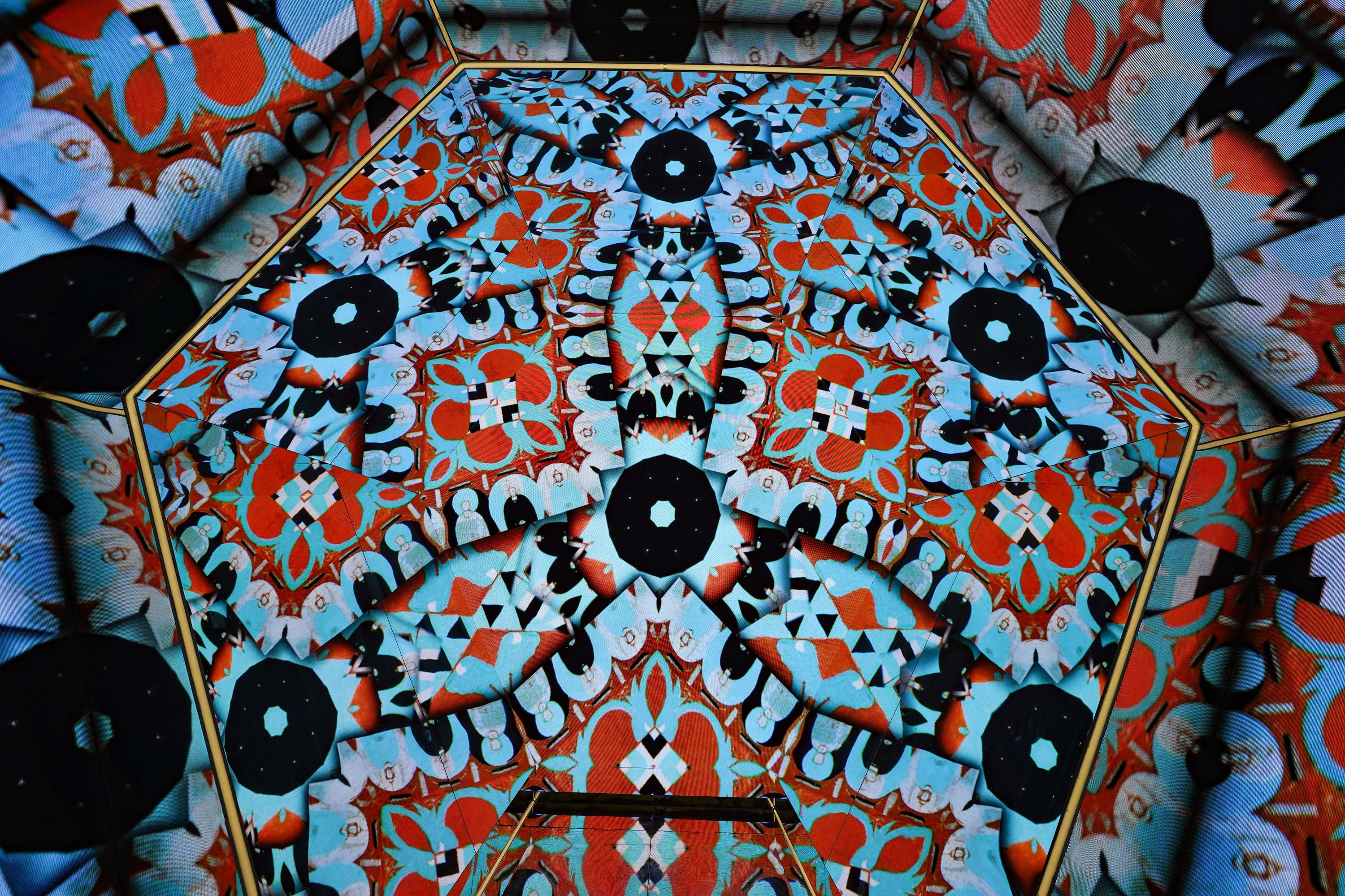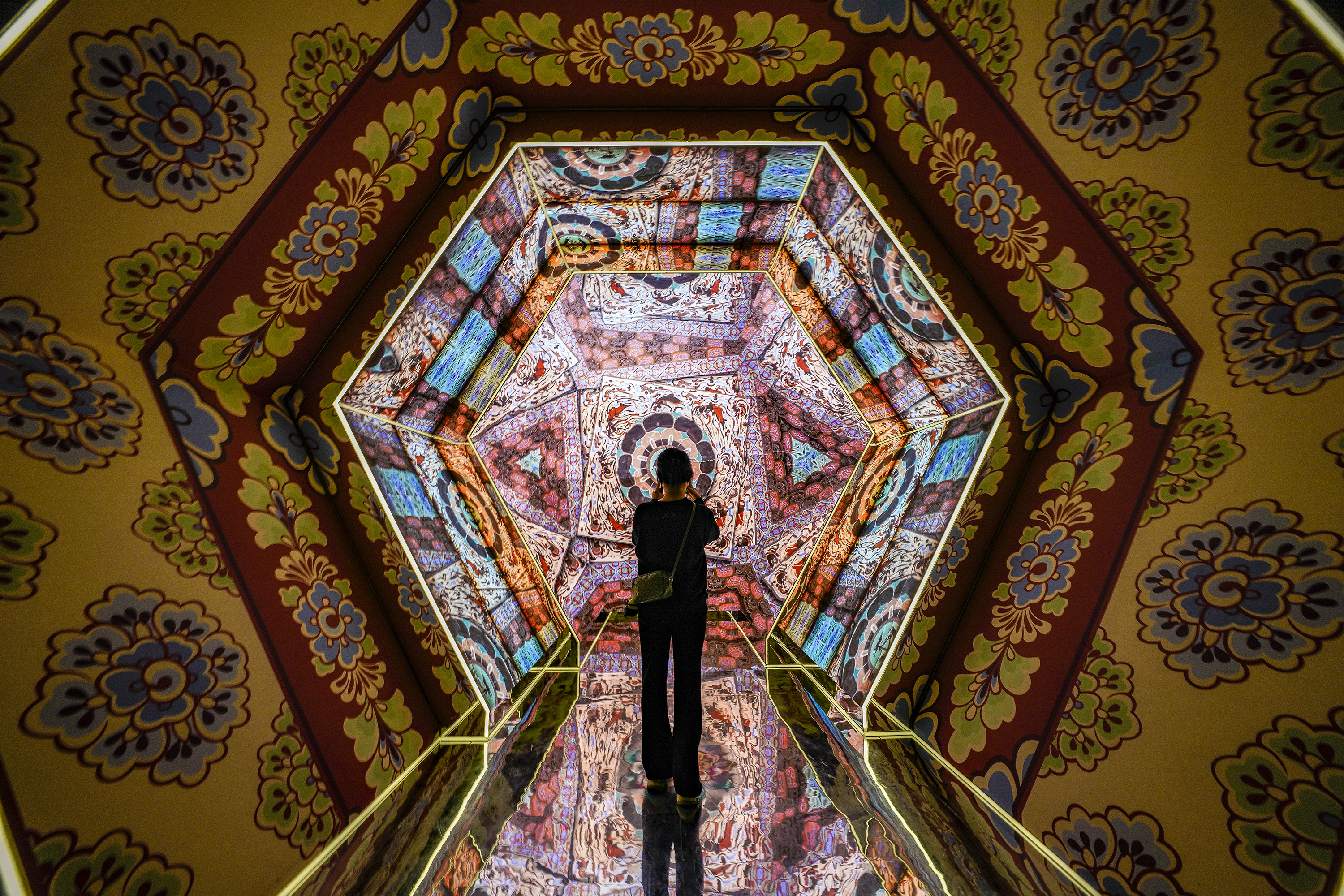 “万古遗珠”将莫高窟壁画中的植物纹、云气纹、火焰纹、飞天纹、几何纹、动物纹等纹样,借助算法影像加以渲染,呈现其辉煌灿烂的石窟艺术风格。