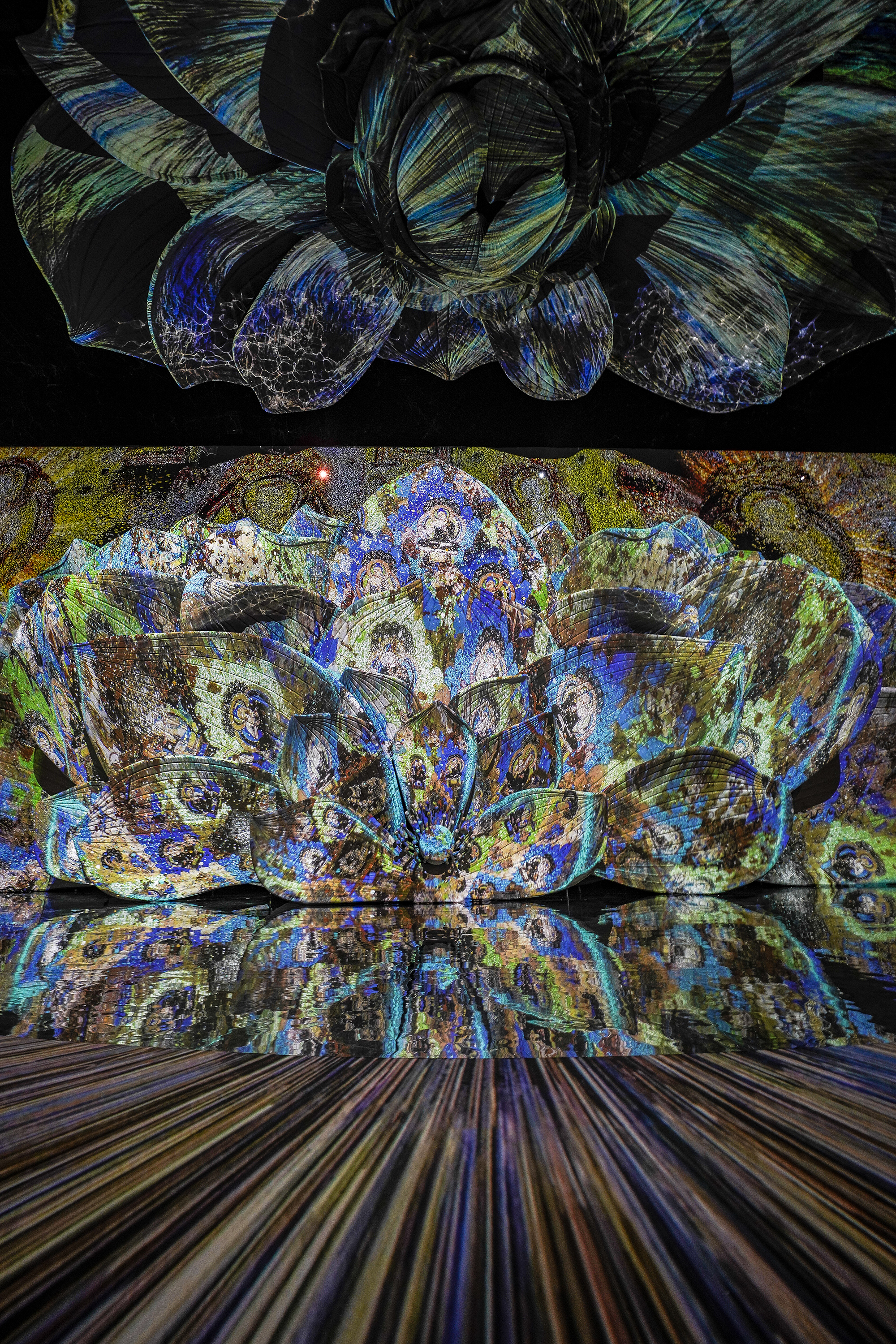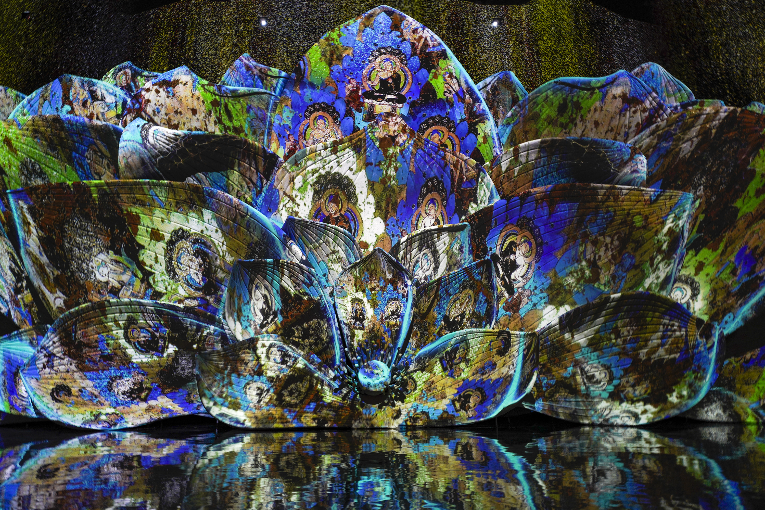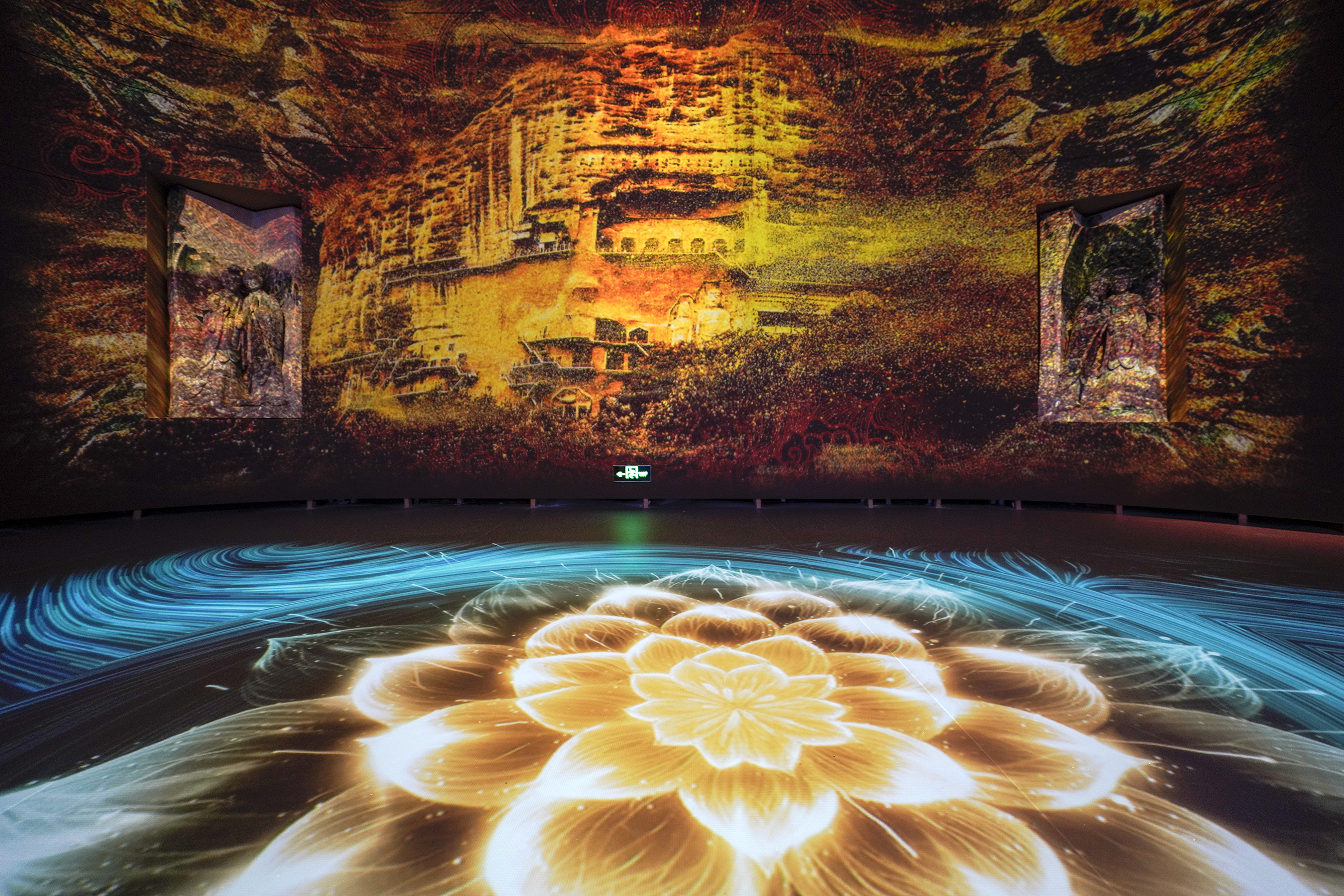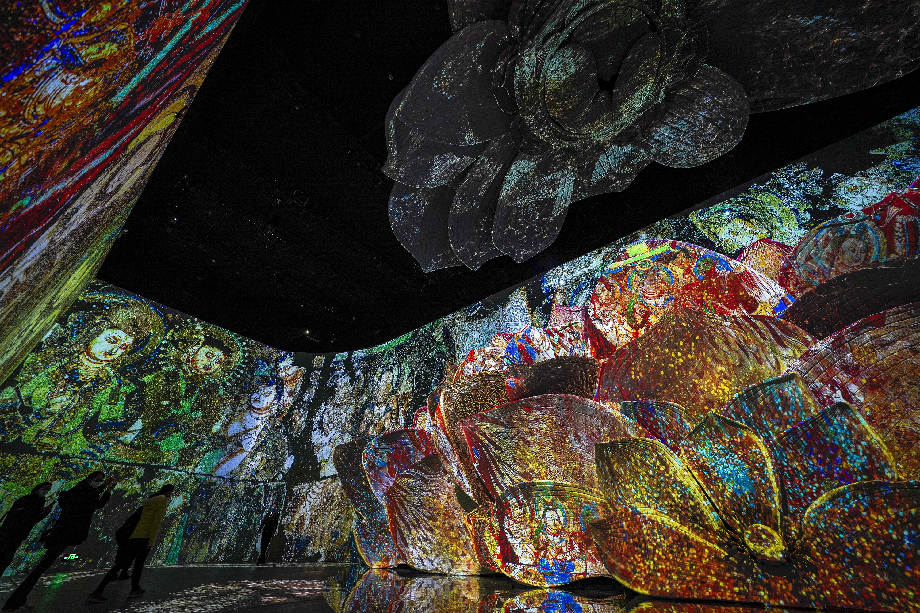 展览空间约1500平方米,主厅以盛开的莲花作为造型主体设计成巨型数字装置,艺术家结合数字绘制、数字影像和AI算法技术,以当代眼光和独特视角来表现、挖掘和阐释克孜尔石窟、敦煌莫高窟、麦积山石窟、云冈石窟和龙门石窟的艺术风格与丰富内涵。