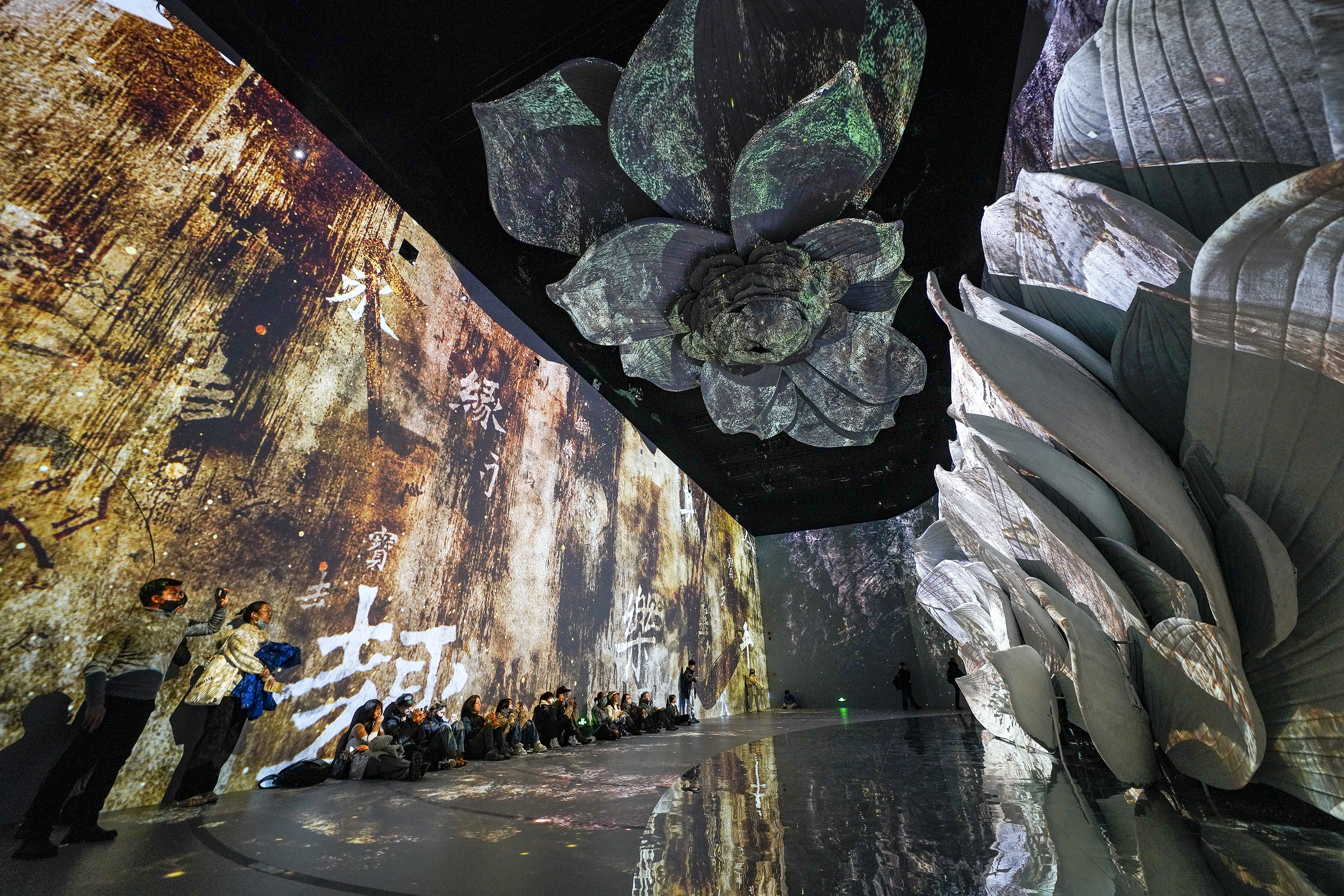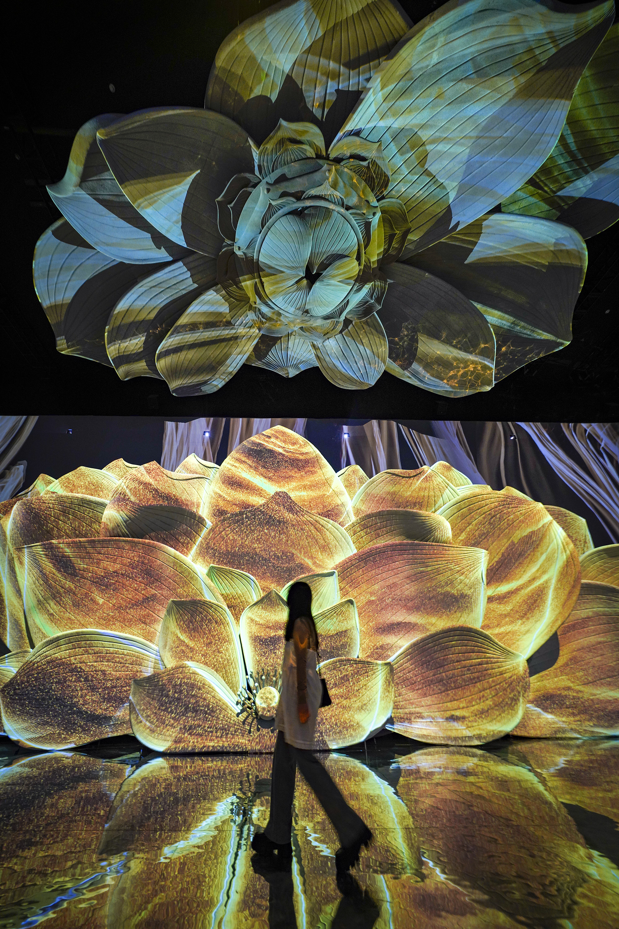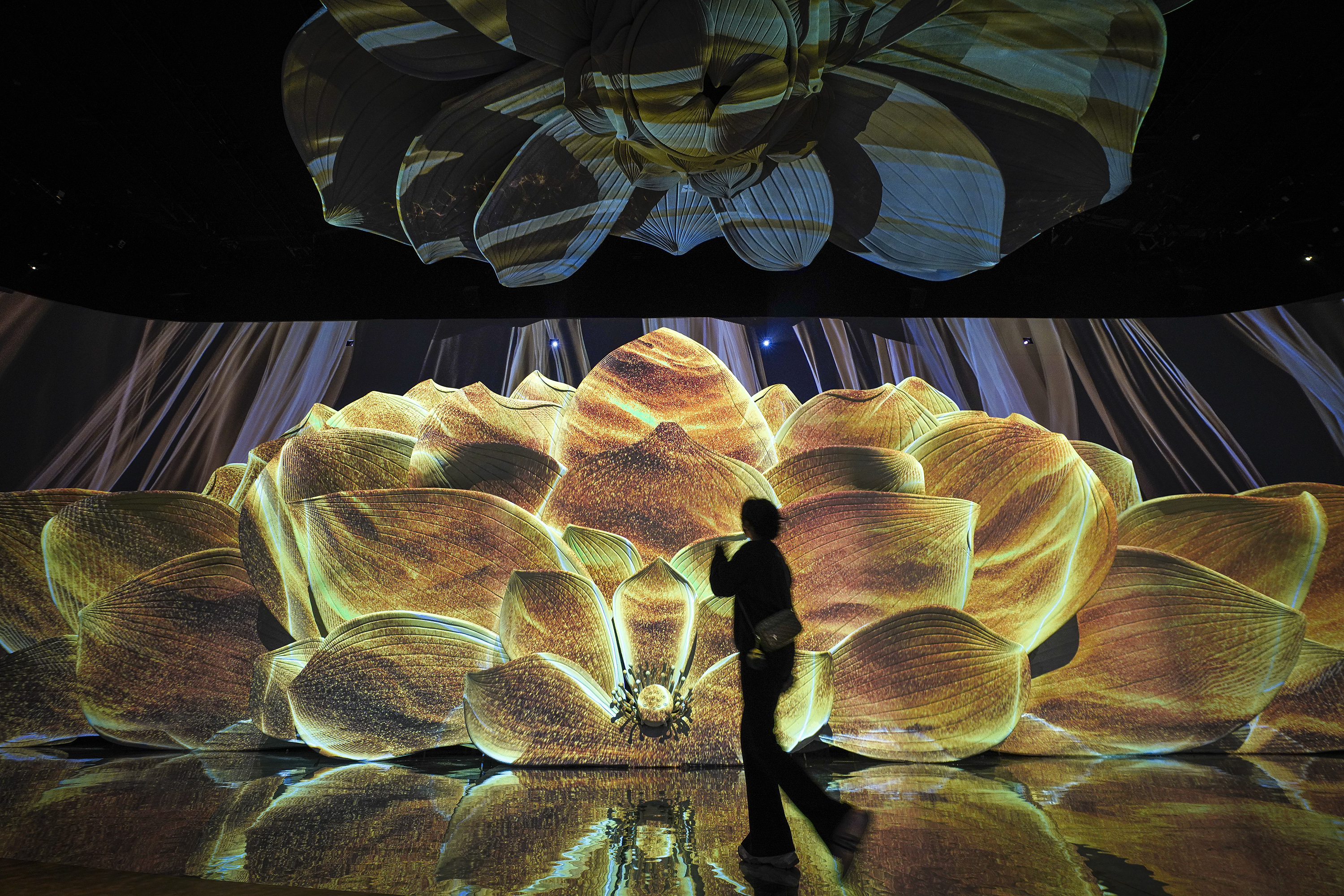 展览空间约1500平方米,主厅以盛开的莲花作为造型主体设计成巨型数字装置,艺术家结合数字绘制、数字影像和AI算法技术,以当代眼光和独特视角来表现、挖掘和阐释克孜尔石窟、敦煌莫高窟、麦积山石窟、云冈石窟和龙门石窟的艺术风格与丰富内涵。