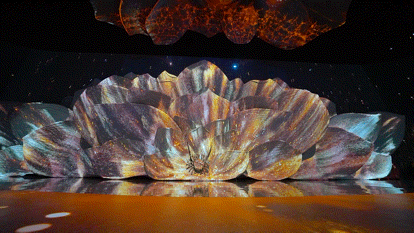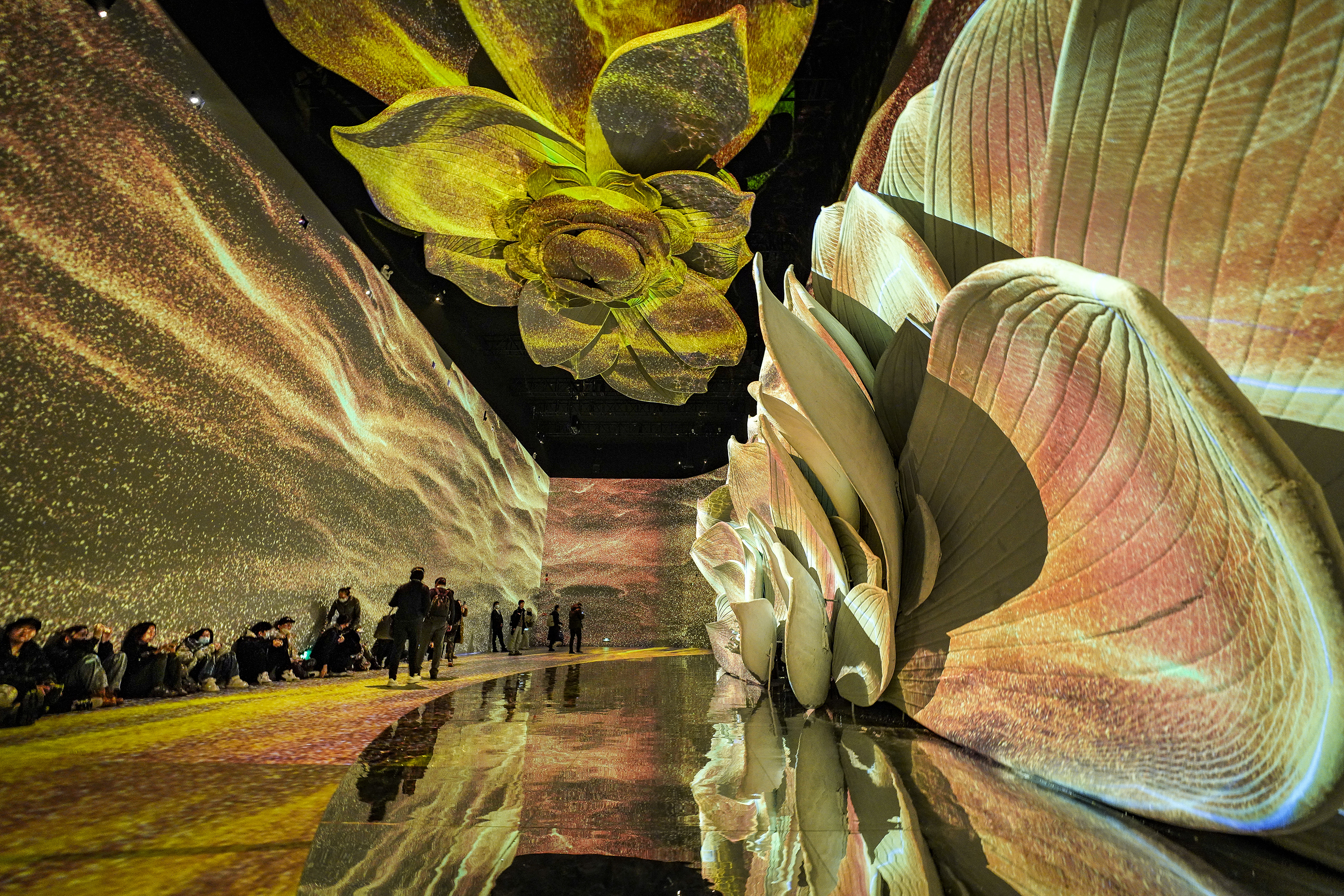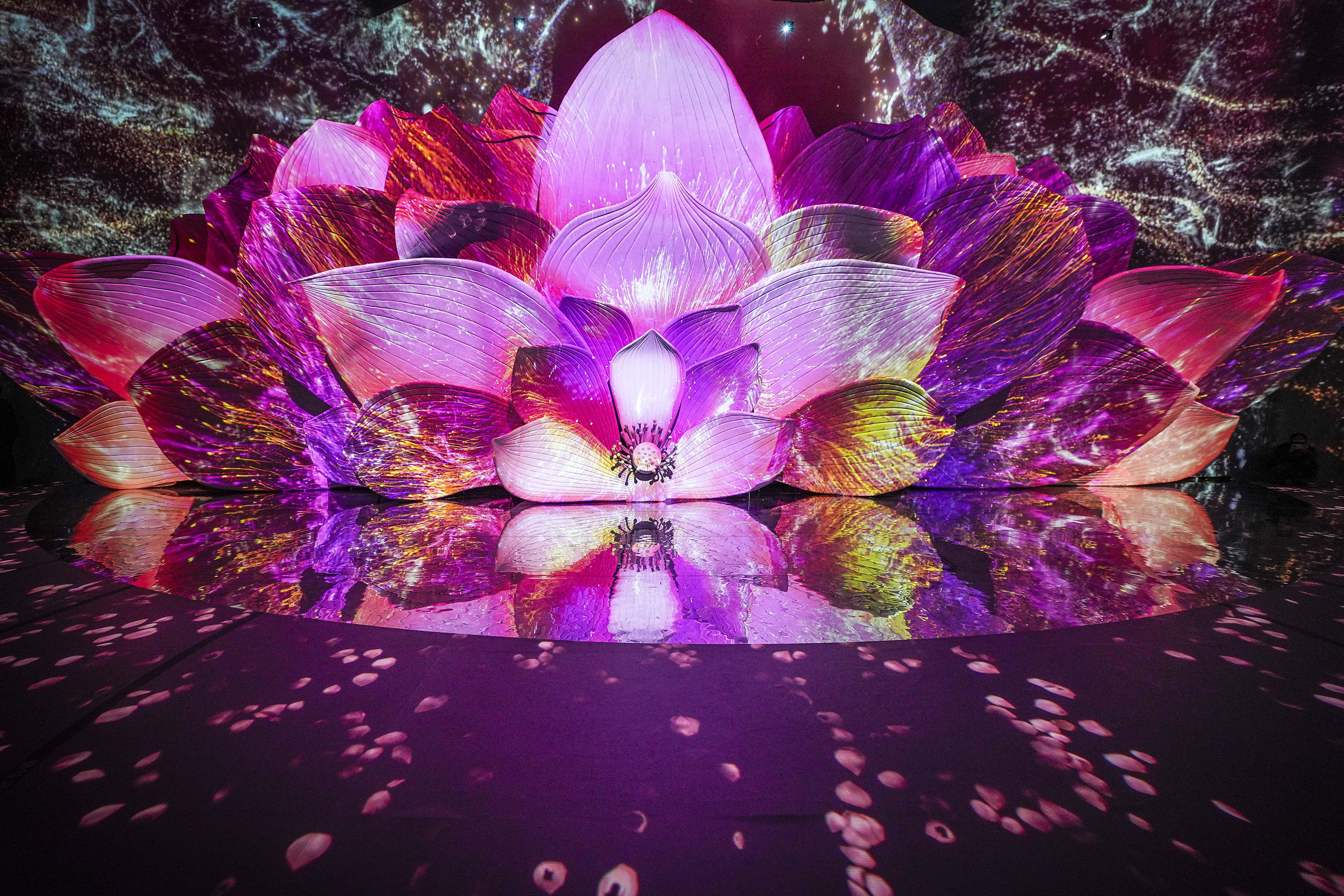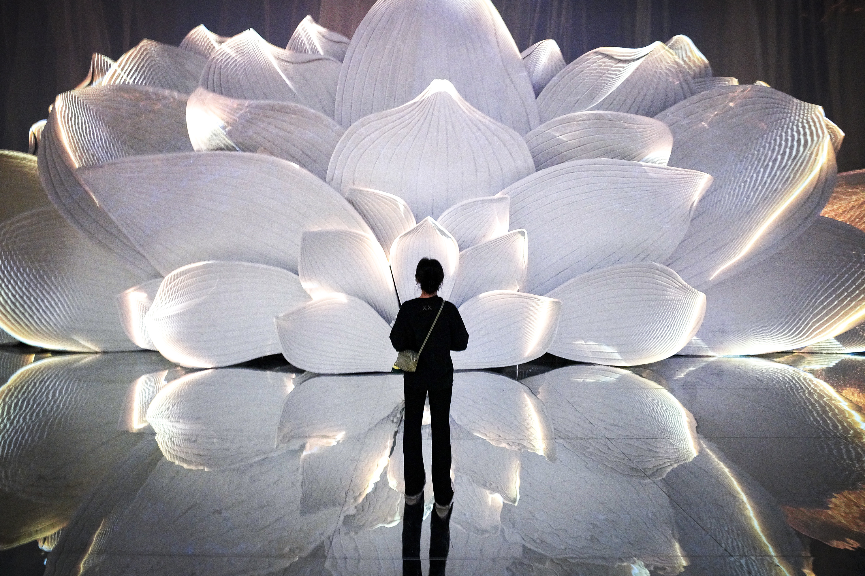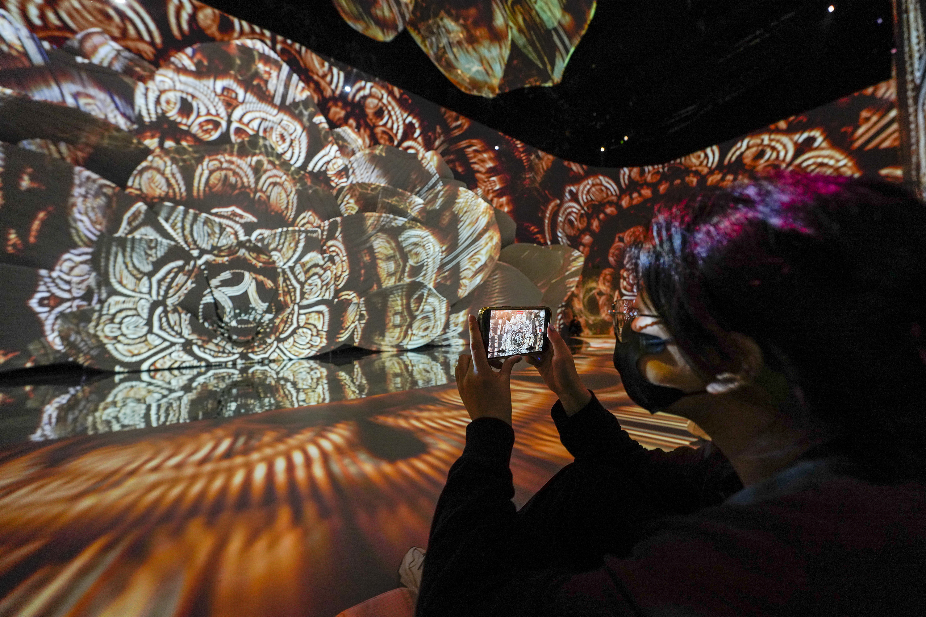 展览空间约1500平方米,主厅以盛开的莲花作为造型主体设计成巨型数字装置,艺术家结合数字绘制、数字影像和AI算法技术,以当代眼光和独特视角来表现、挖掘和阐释克孜尔石窟、敦煌莫高窟、麦积山石窟、云冈石窟和龙门石窟的艺术风格与丰富内涵。