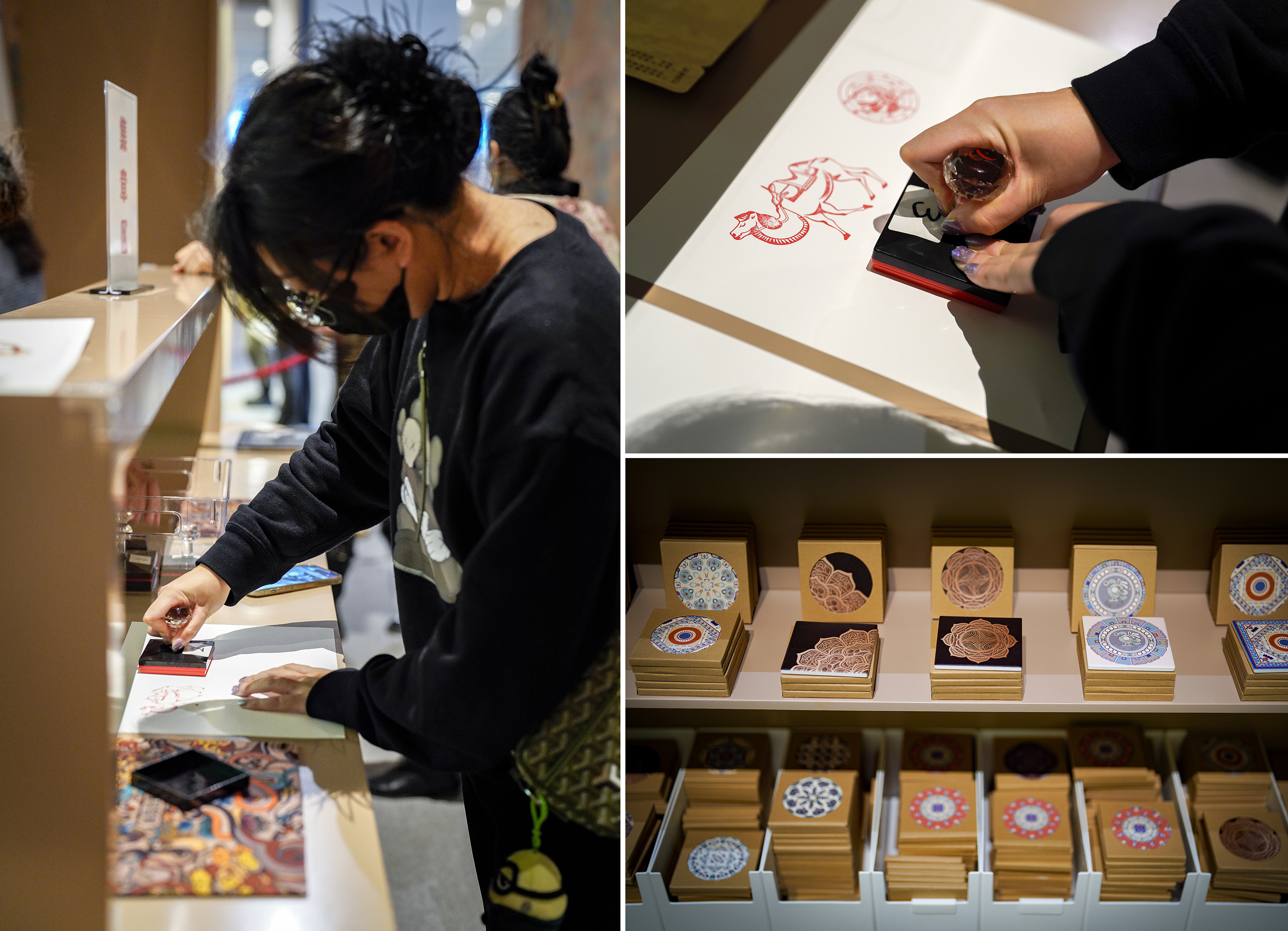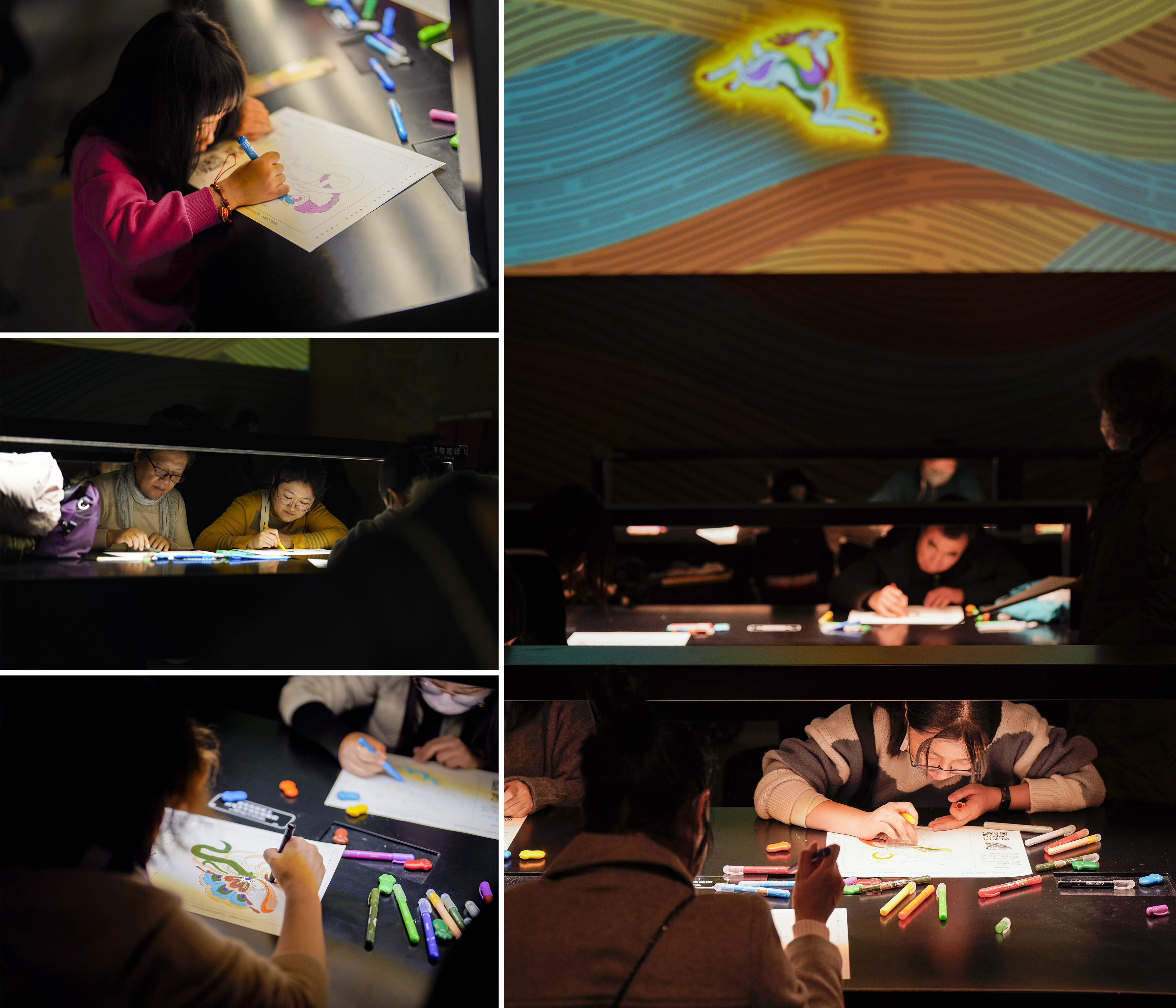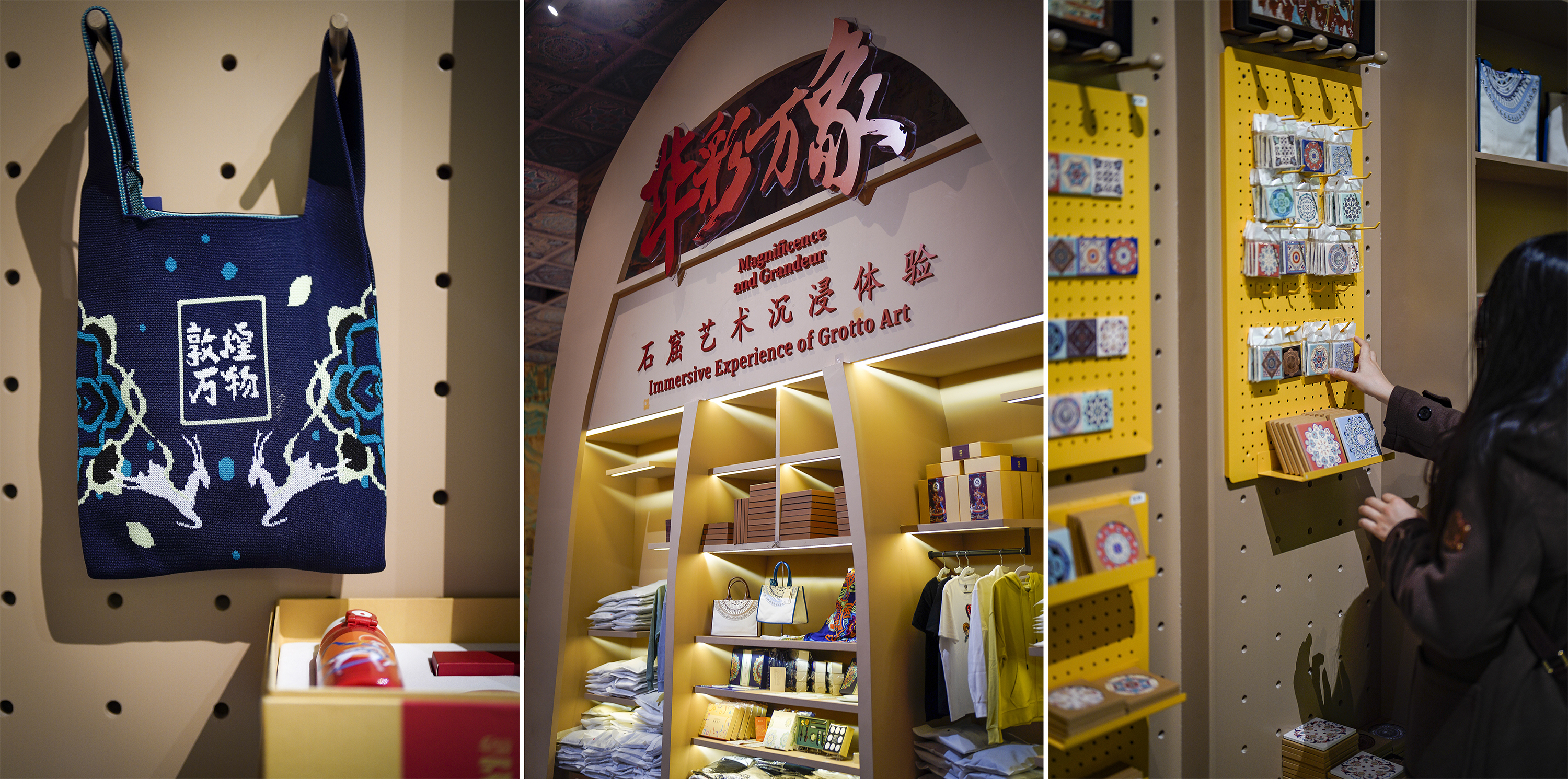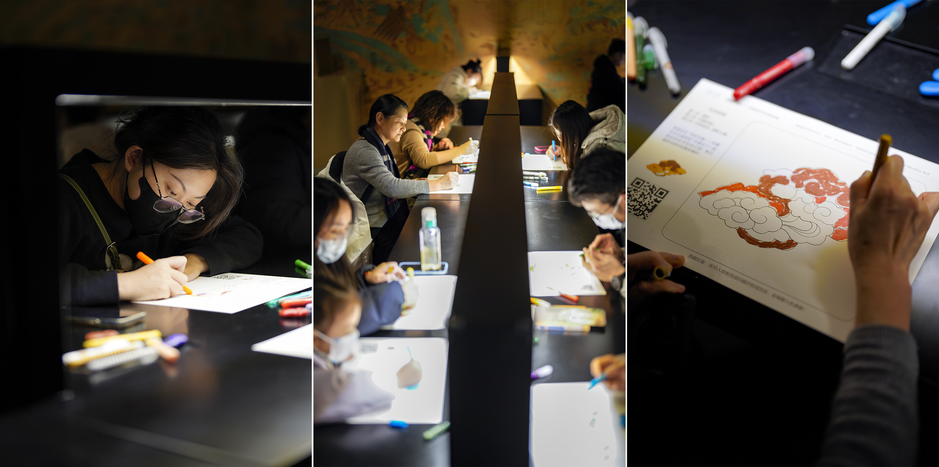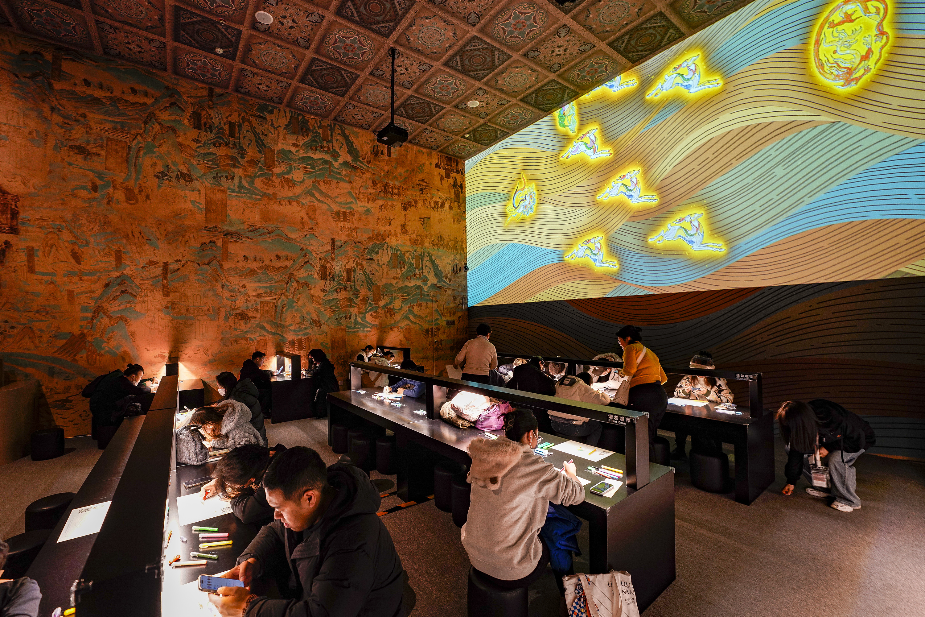 此外,在“教学互动体验区”除了可以集章打卡,还可以亲手绘制一幅自己的专属壁画,通过互动设备让壁画“飞”上屏幕;在“衍生艺术品区”可以挑选心仪的文创好物,把石窟艺术带回家。