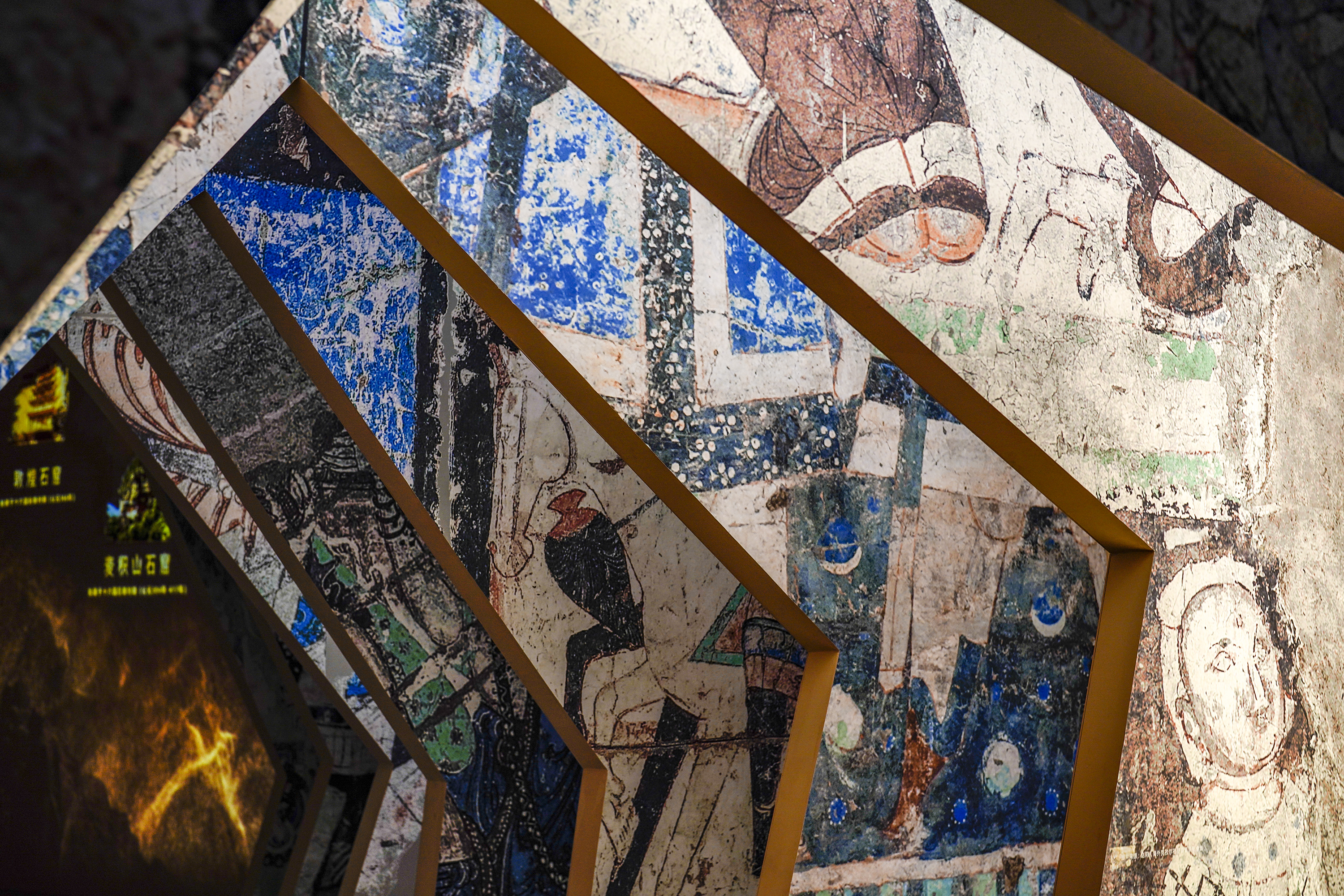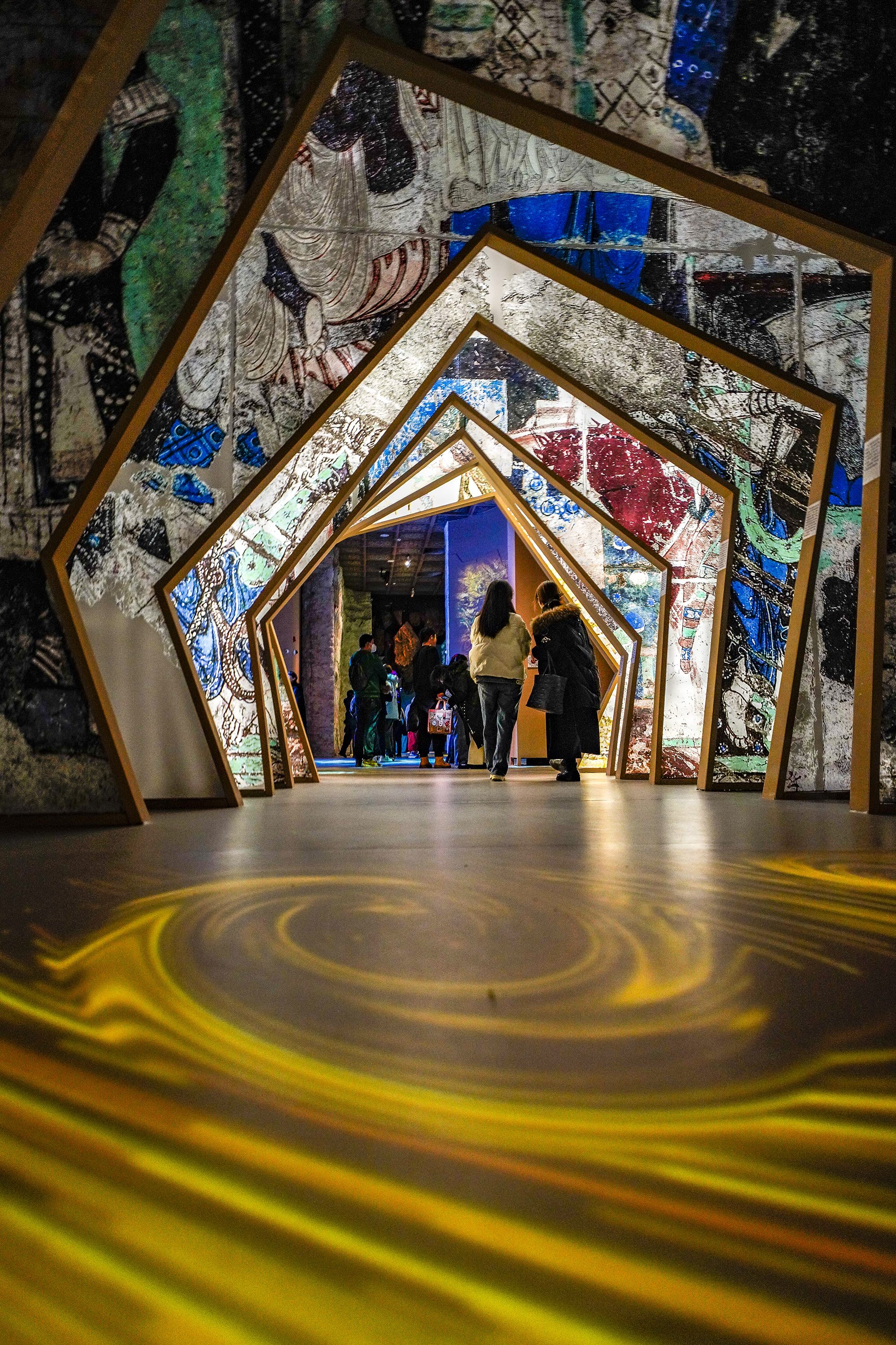 “艺术时空体验区”分为五个板块,表达五个石窟的各自特点,按照由西向东的石窟地理位置排序。“菱格世界”选取克孜尔石窟发展期至繁盛期的代表性壁画情节,以空间延展旋转进入时间的隧道,展现石窟艺术东渐的发展脉络。