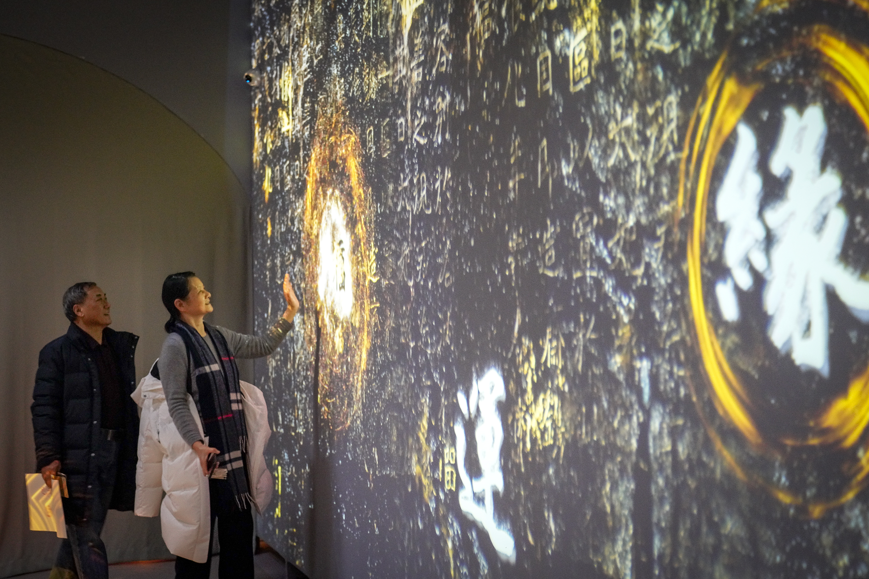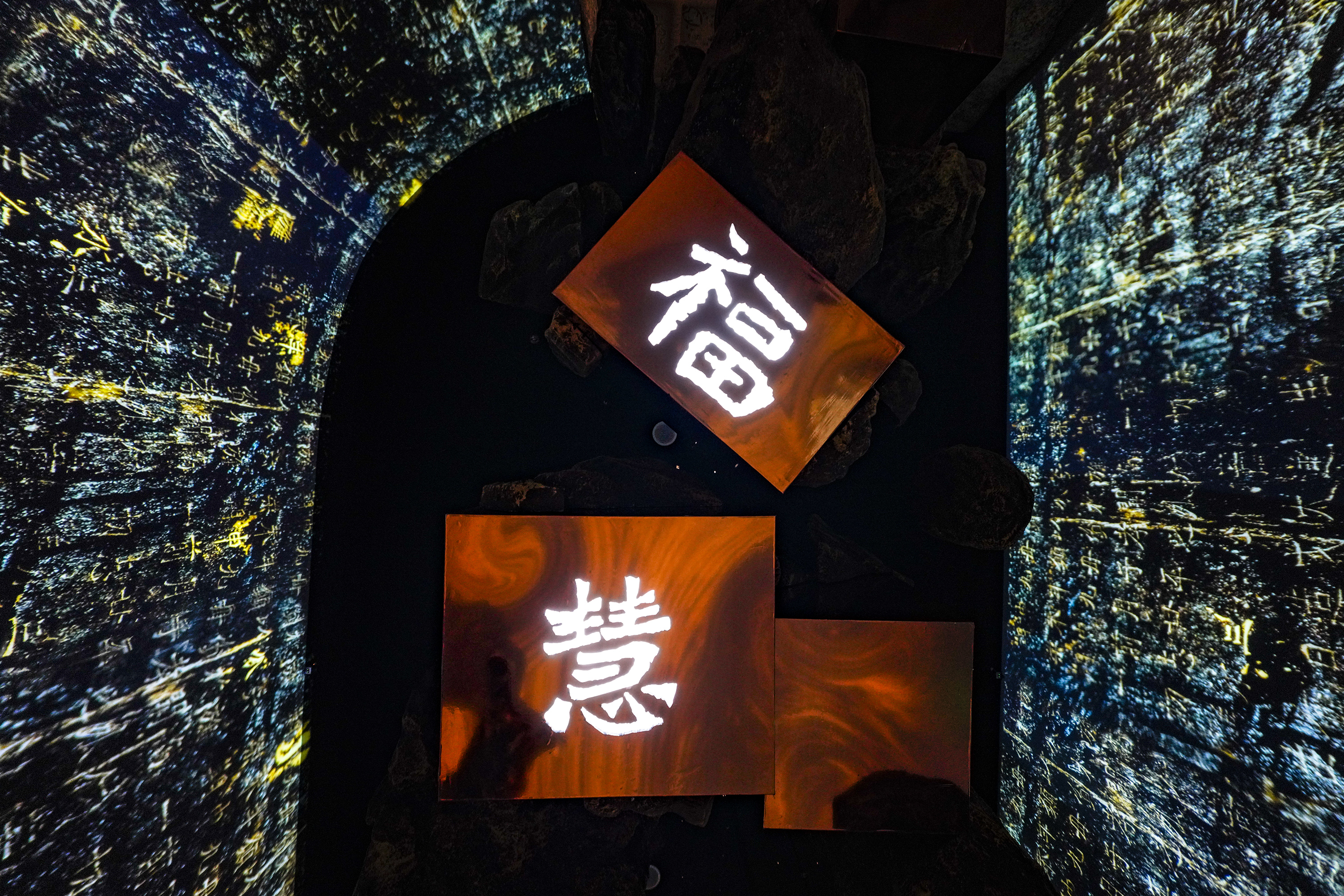 “奇崛妙境”选取龙门石窟“龙门二十品”为代表的碑刻题记进行再创造,以魏碑原石造型为载体,通过悬挂阵列的形式重组碑体书法的空中矩阵。