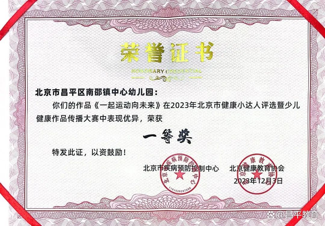 近日,北京市疾病预防控制中心、北京健康教育协会举办“2023年北京市健康小达人评选暨少儿健康作品传播大赛”展演及评选活动。昌平区南邵镇中心幼儿园师生参赛作品《一起运动向未来》荣获“2023年北京市健康小达人暨少儿健康传播大赛一等奖”。