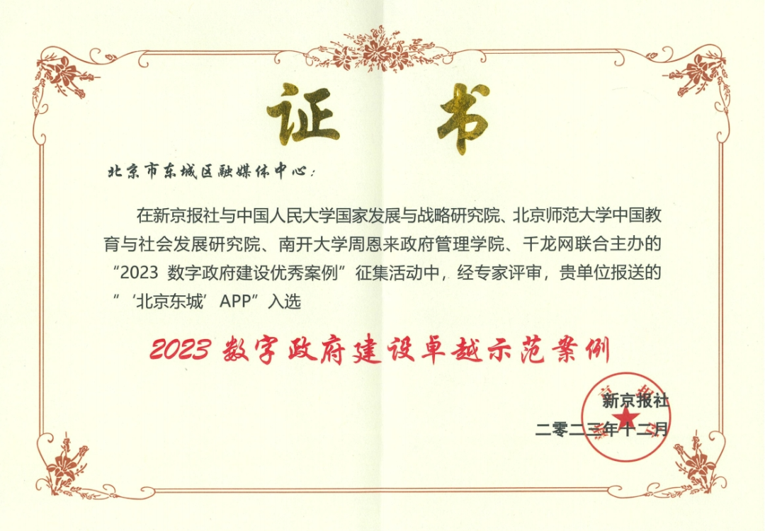 近日,“2023数字政府建设优秀案例”答辩及发布活动在京举行,该活动由新京报社与中国人民大学国家发展与战略研究院、北京师范大学中国教育与社会发展研究院、南开大学周恩来政府管理学院和千龙网联合主办。东城区融媒体中心开发运营的