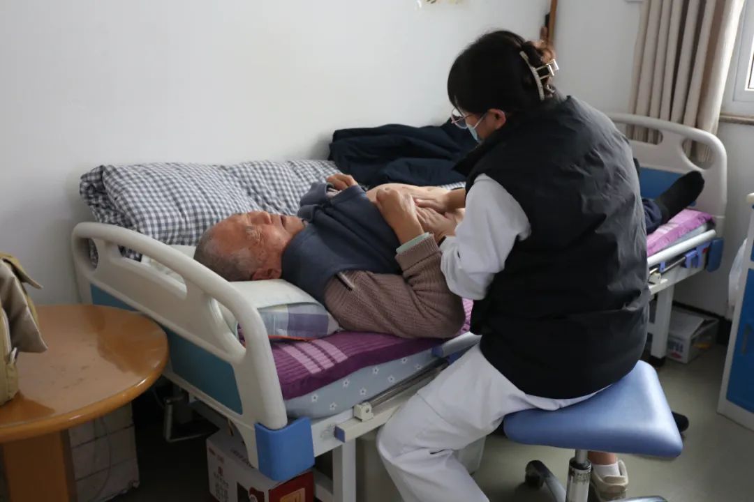在敬老院二层的一个房间,全科病房康复技师徐邵华正在为另一位老人进行按摩治疗。按摩结束后,中医康复科医生刘超为老人号脉,并给予老人健康提示。“我们负责中医按摩治疗的康复技师基本上每天都过来,每天有将近两个小时为敬老院的老年人服务。”刘超医生告诉记者。