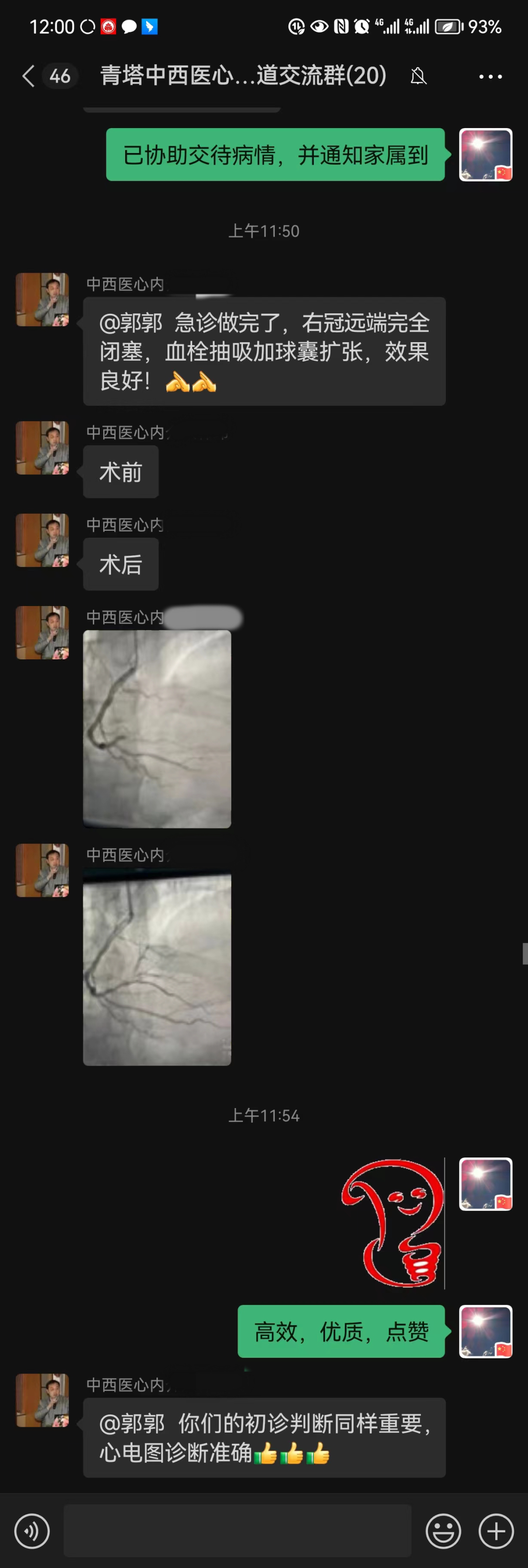 结果出来了,青塔中心家医团队的医生们诊断精准、转诊及时,贾先生的右冠远端出现了完全闭塞的情况。通过急诊血栓抽吸和球囊扩张手术,贾先生完全闭塞的血管再通了。心肌梗死的危险解除了!从就诊到转诊再到手术成功,仅仅不到3个小时。