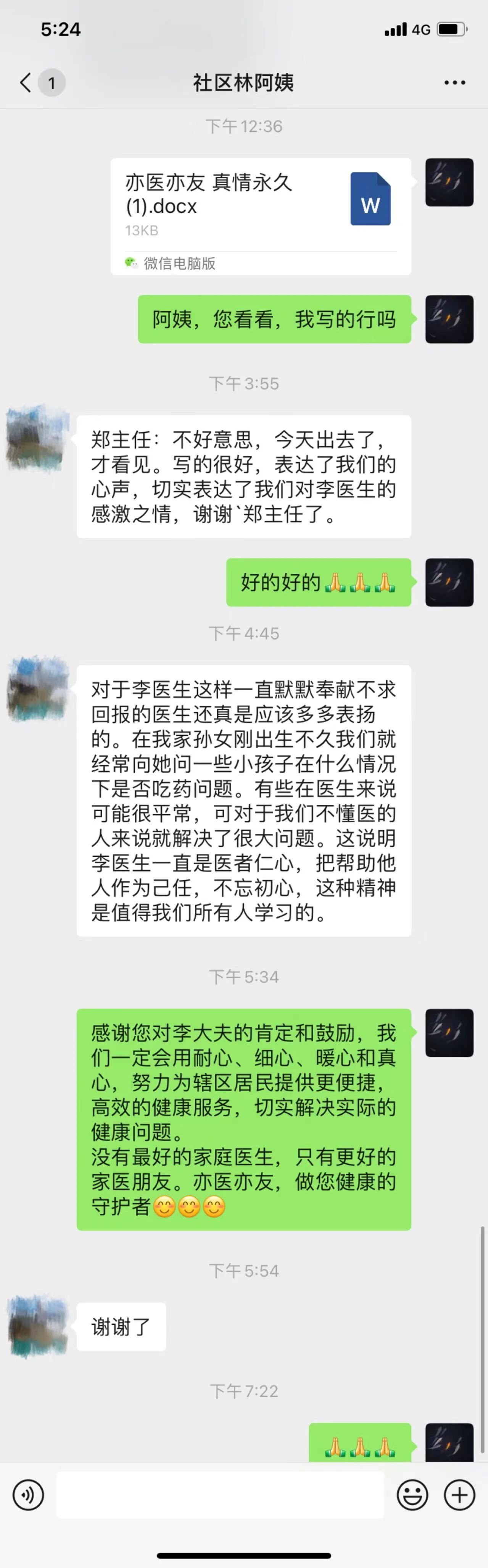 今天,她们特意代表全体队员,到中心表达对李医生的感激之情。张阿姨说:“李医生我们认识20多年了,是我们小区出了名的热心肠儿家庭医生,经常给邻居们讲解健康知识,解答健康问题,尤其是对我们这些老年人,那是不厌其烦,有问必答,有求必应,时常给我们送药上门呢。”林阿姨掏出手机读了起来“李医生为人朴实,诚实可靠,孝老敬老,待人和善,脚踏实地,默默付出,不求回报,甘于奉献。在我们心中不仅是好医生、好邻居,更是好朋友。”说着,两位阿姨纷纷向李医生竖起了大拇指。