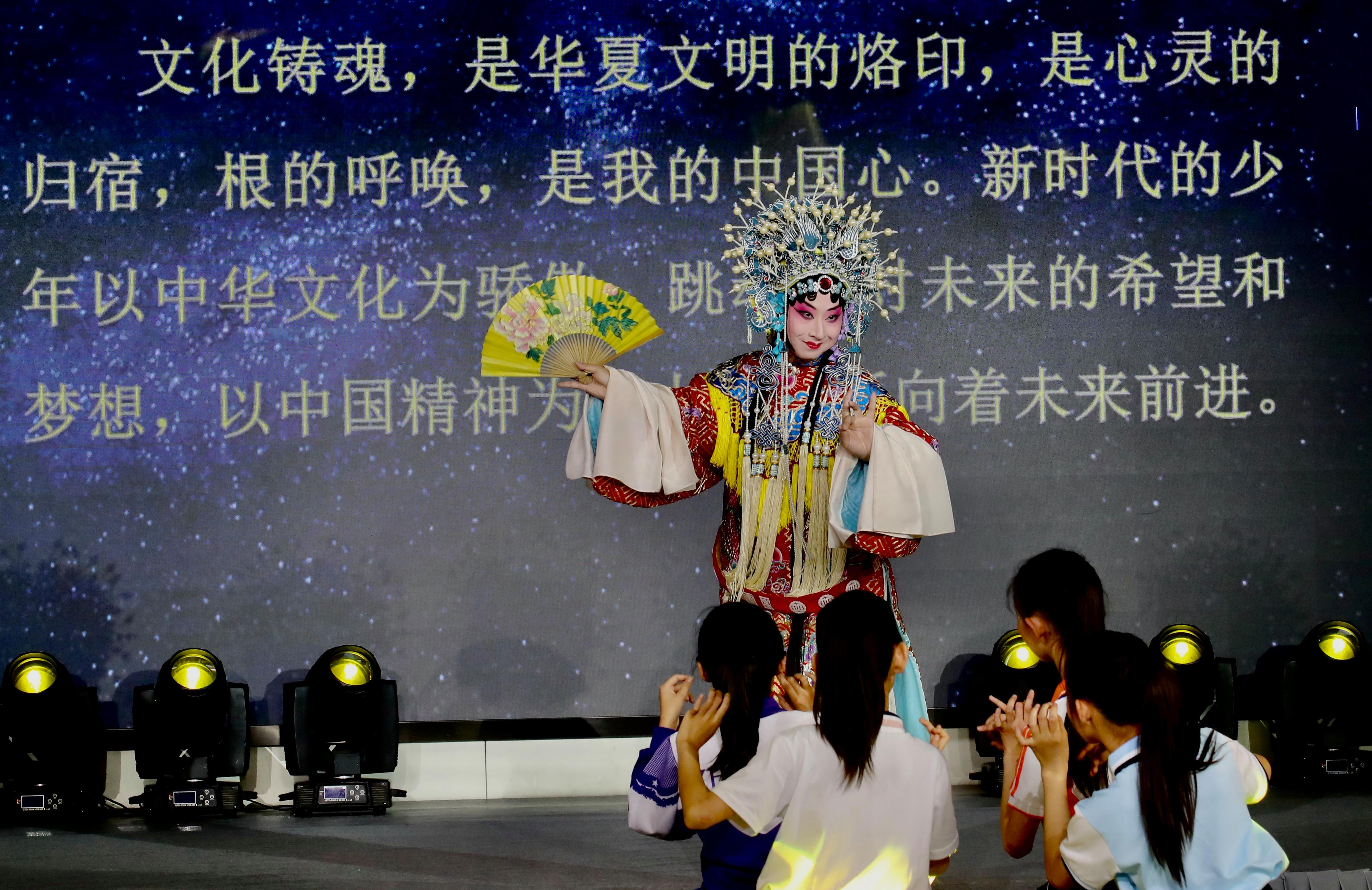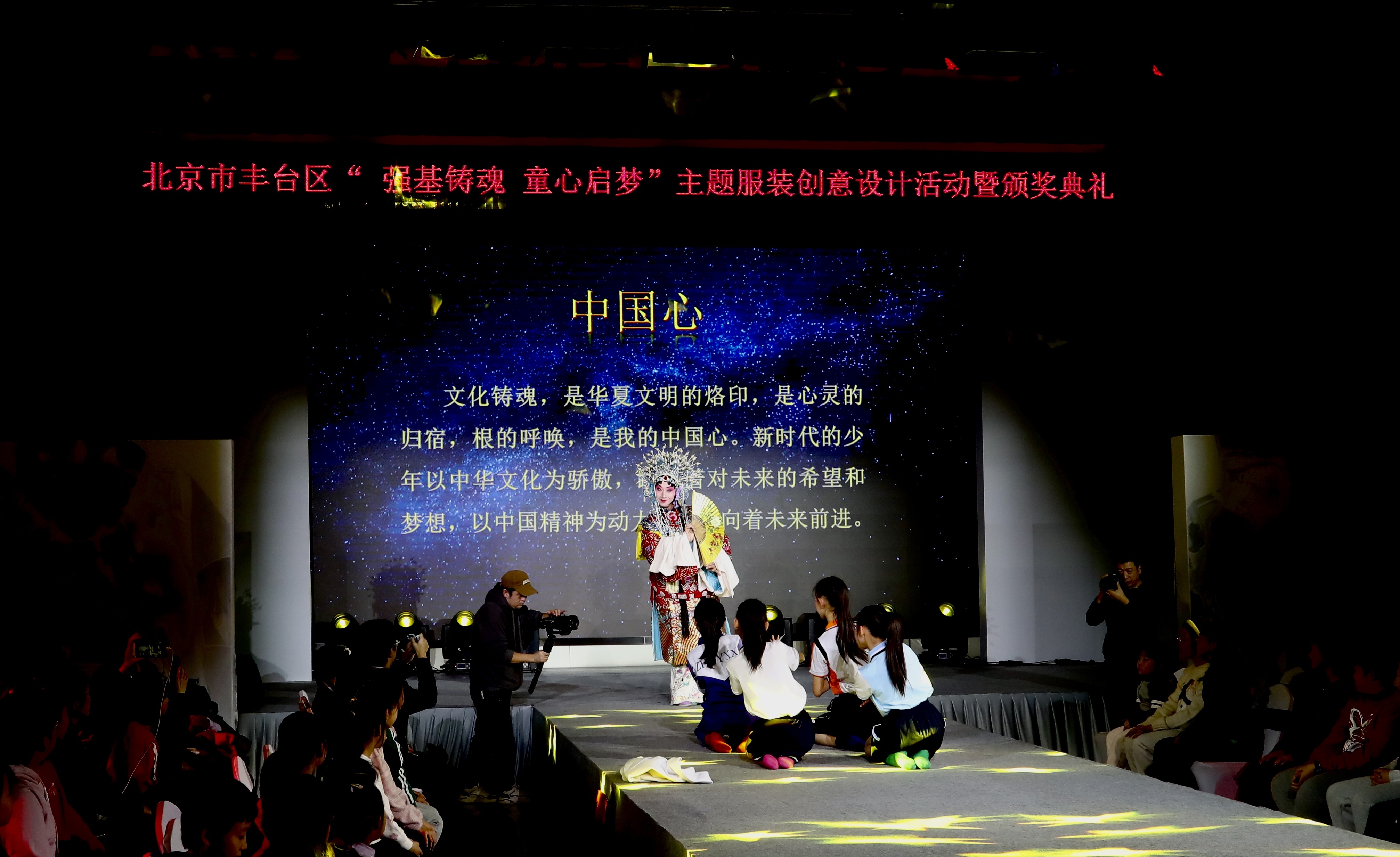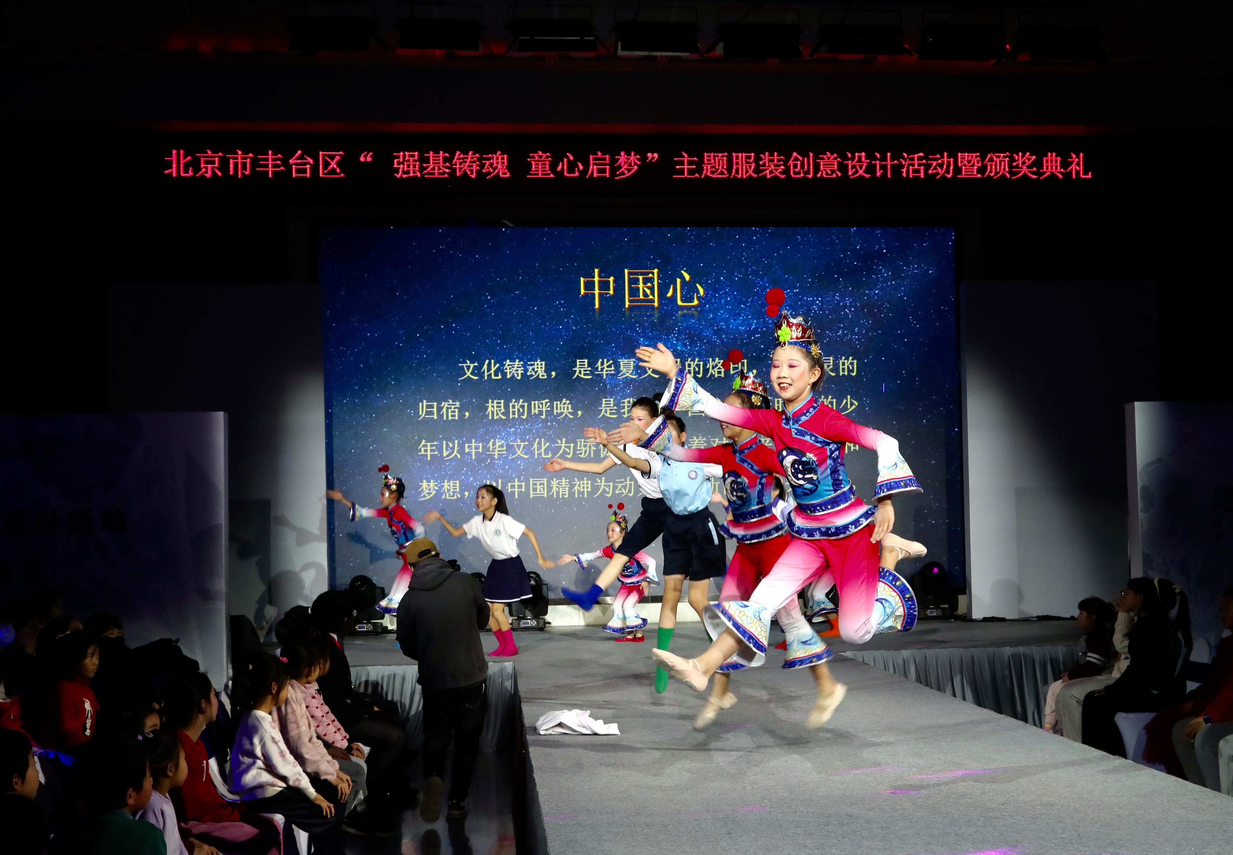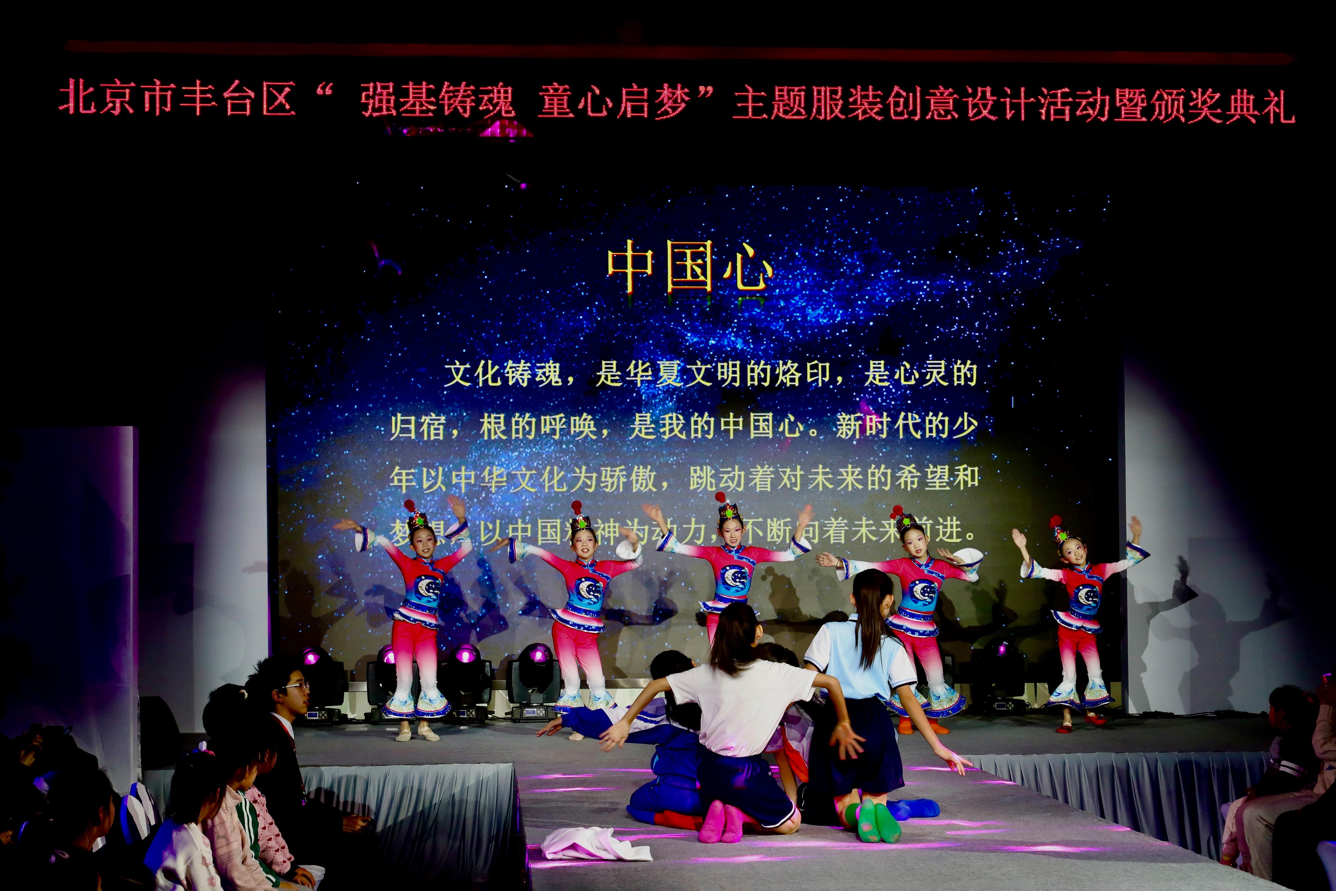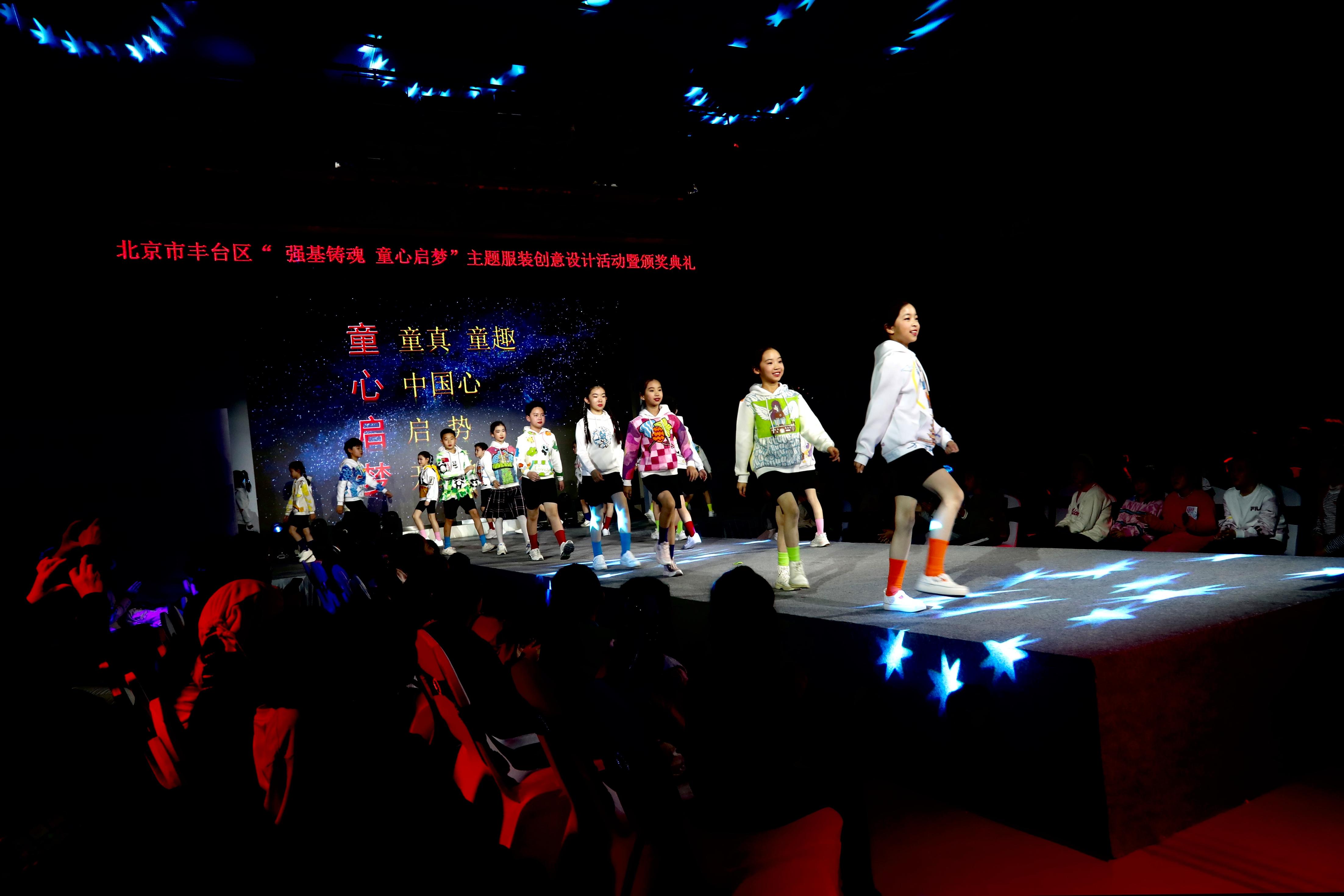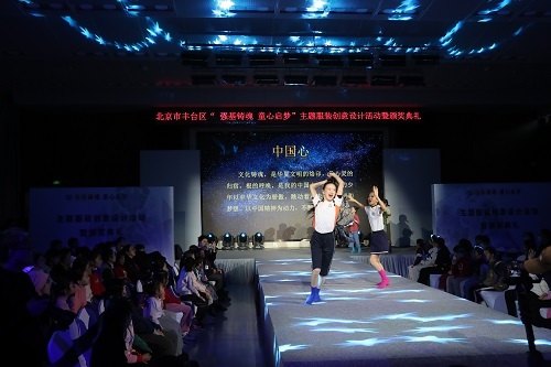清朗校园的读书声拉开了表演序幕,来自丰台区劳技中心、丰台区璞瑅学校、丰台区第一小学、北京教育科学研究院丰台实验小学的100余名小模特们在T台上自信亮相,以“童真童趣”、“中国心”、“启势”、“梦开始的地方”四个板块展示了丰台少年的活力与风采。同学们用自己设计的服装作品在舞台上绽放自己、尽情表达心中的美好和对未来的期望。古琴、京剧、皮影、扎染等中华传统文化元素的展示与学生们的设计作品相得益彰,感染了全场的师生观众。