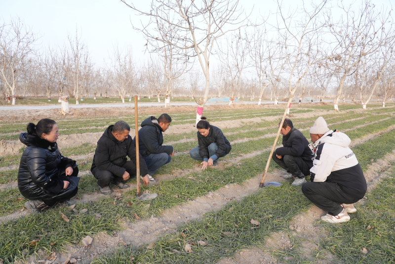 在和田市玉龙喀什镇水管站工作人员(右三)正在查看冬小麦长势情况。阿卜力克木·依卜拉依木摄