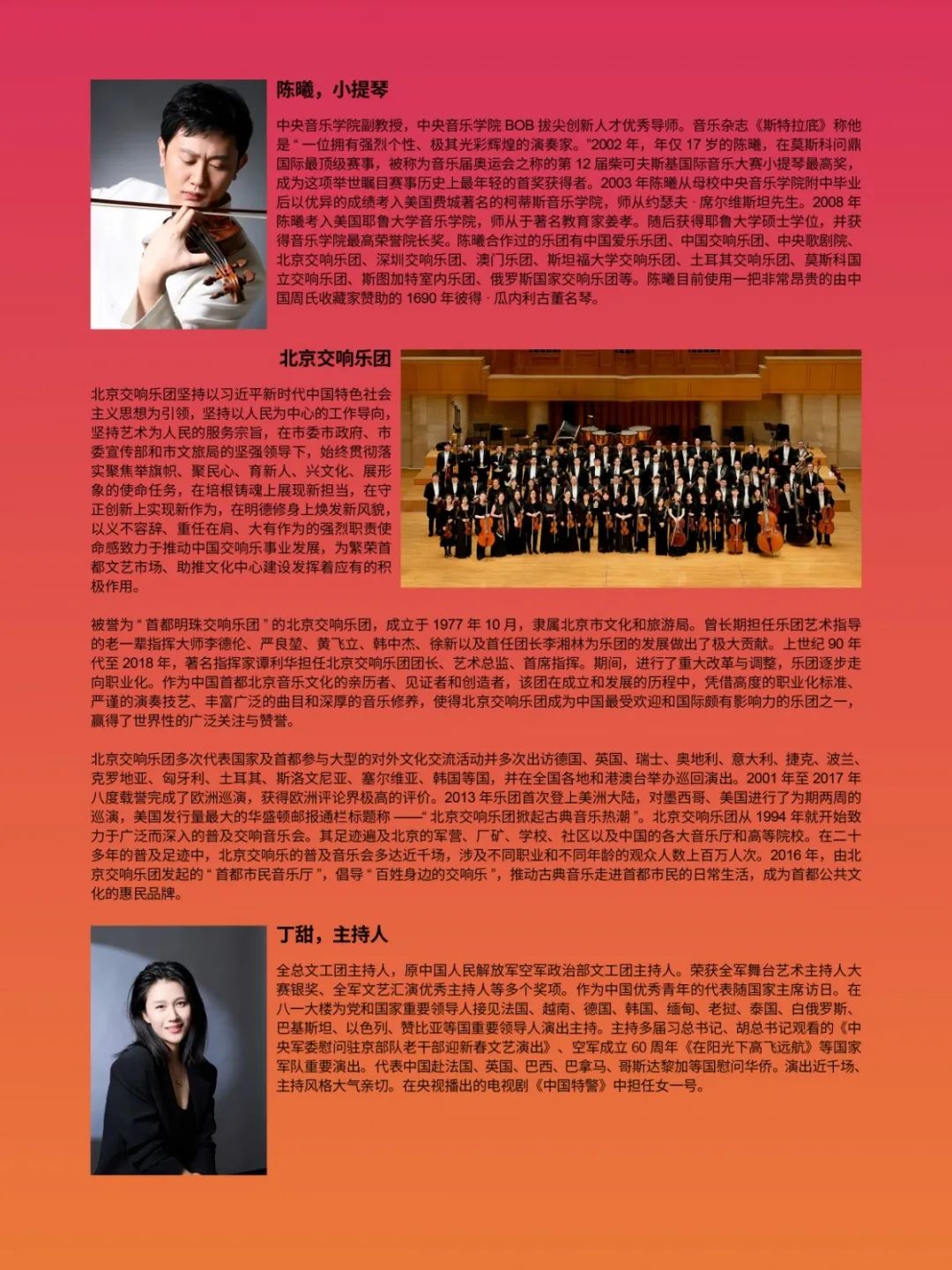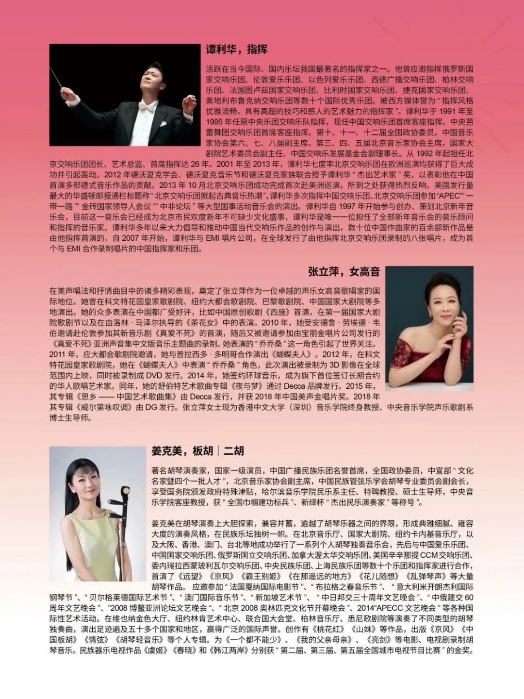 著名指挥家谭利华携著名女高音歌唱家张立萍、著名胡琴演奏家姜克美、小提琴演奏家陈曦和被誉为“首都明珠交响乐团”的北京交响乐团将与我们共赴此次音乐之旅。