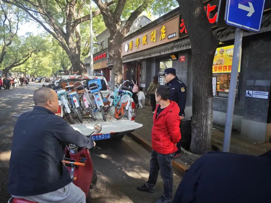 “筒子河边”调解庭现场处置违规“亲子单车”,维护故宫周边旅游秩序。