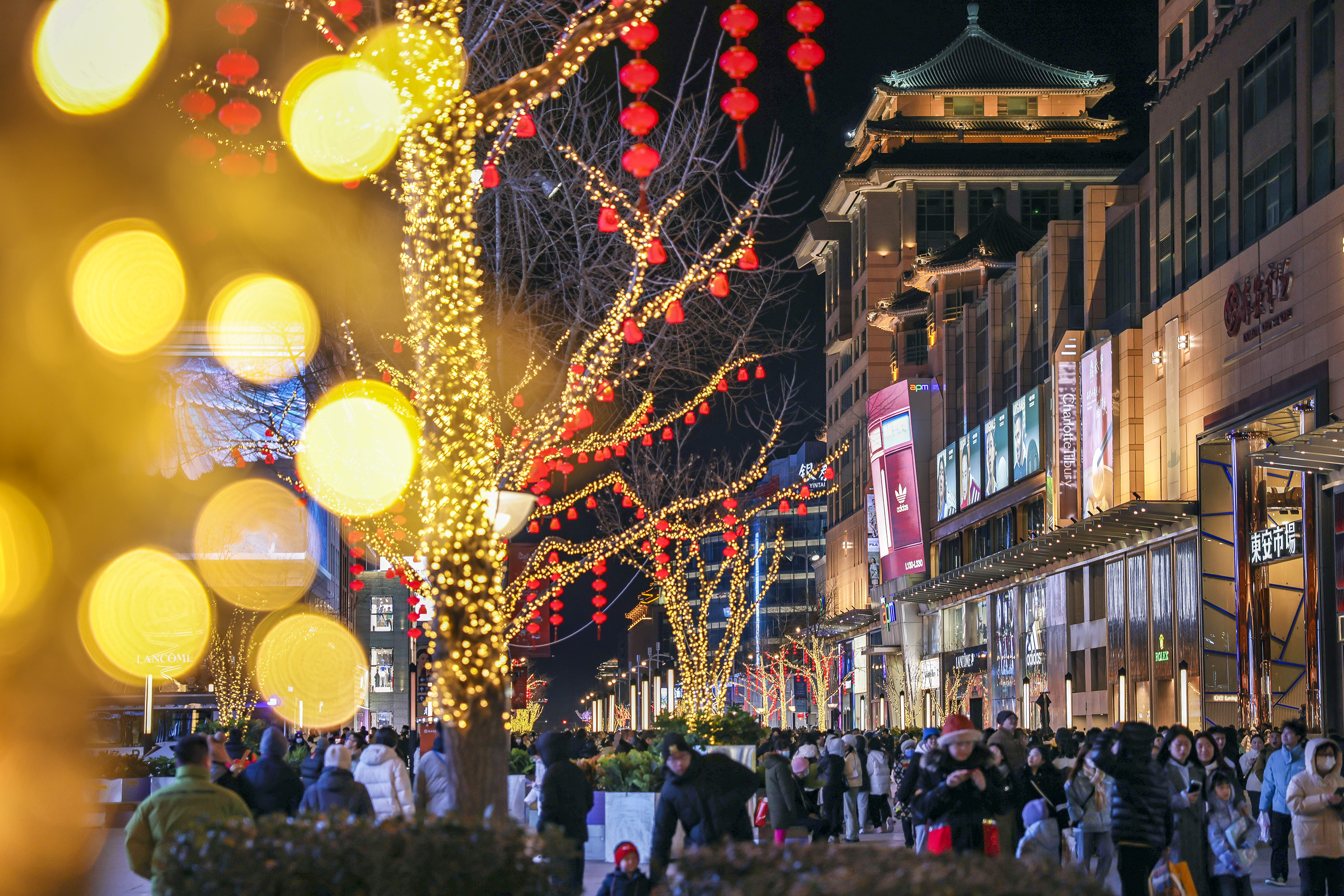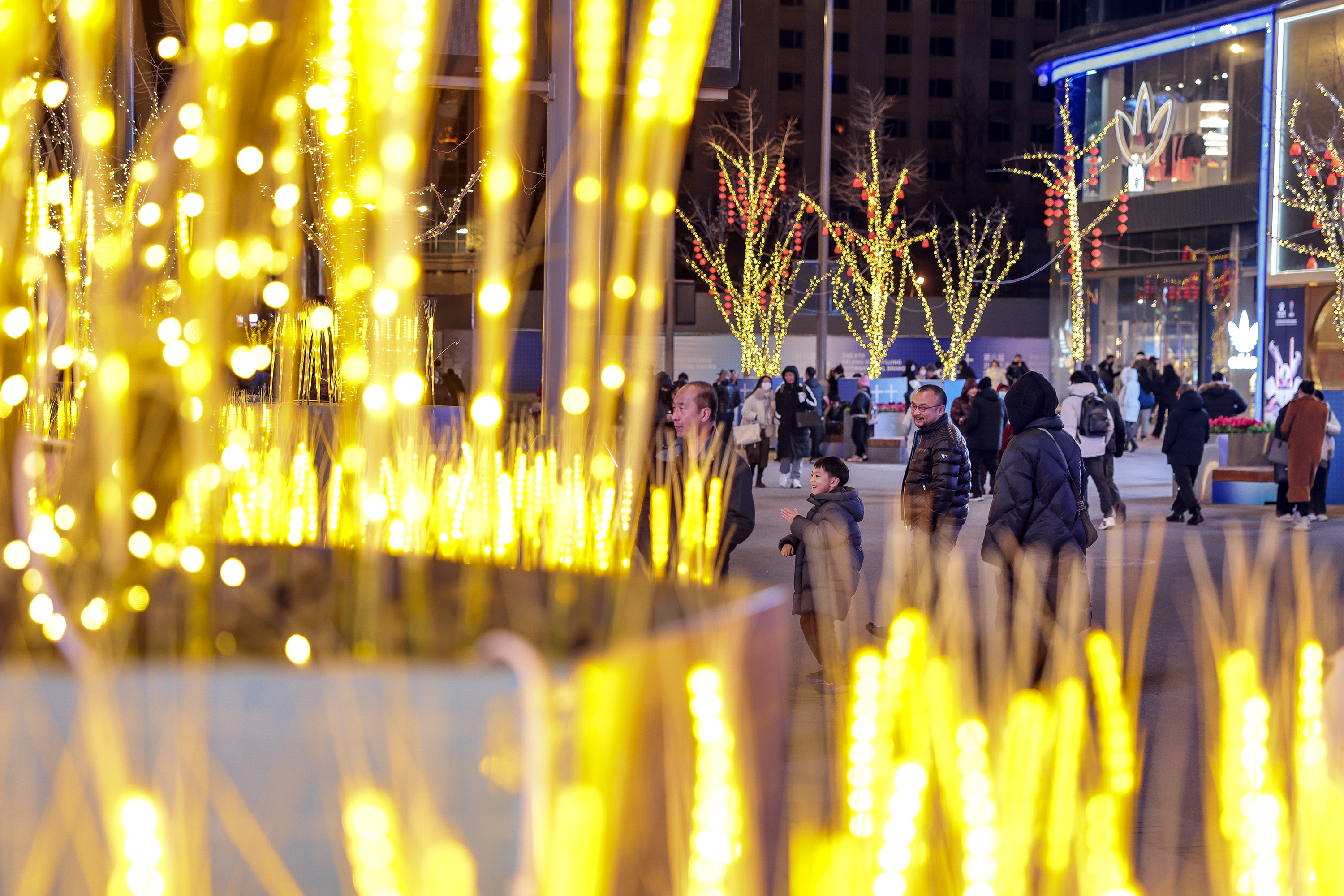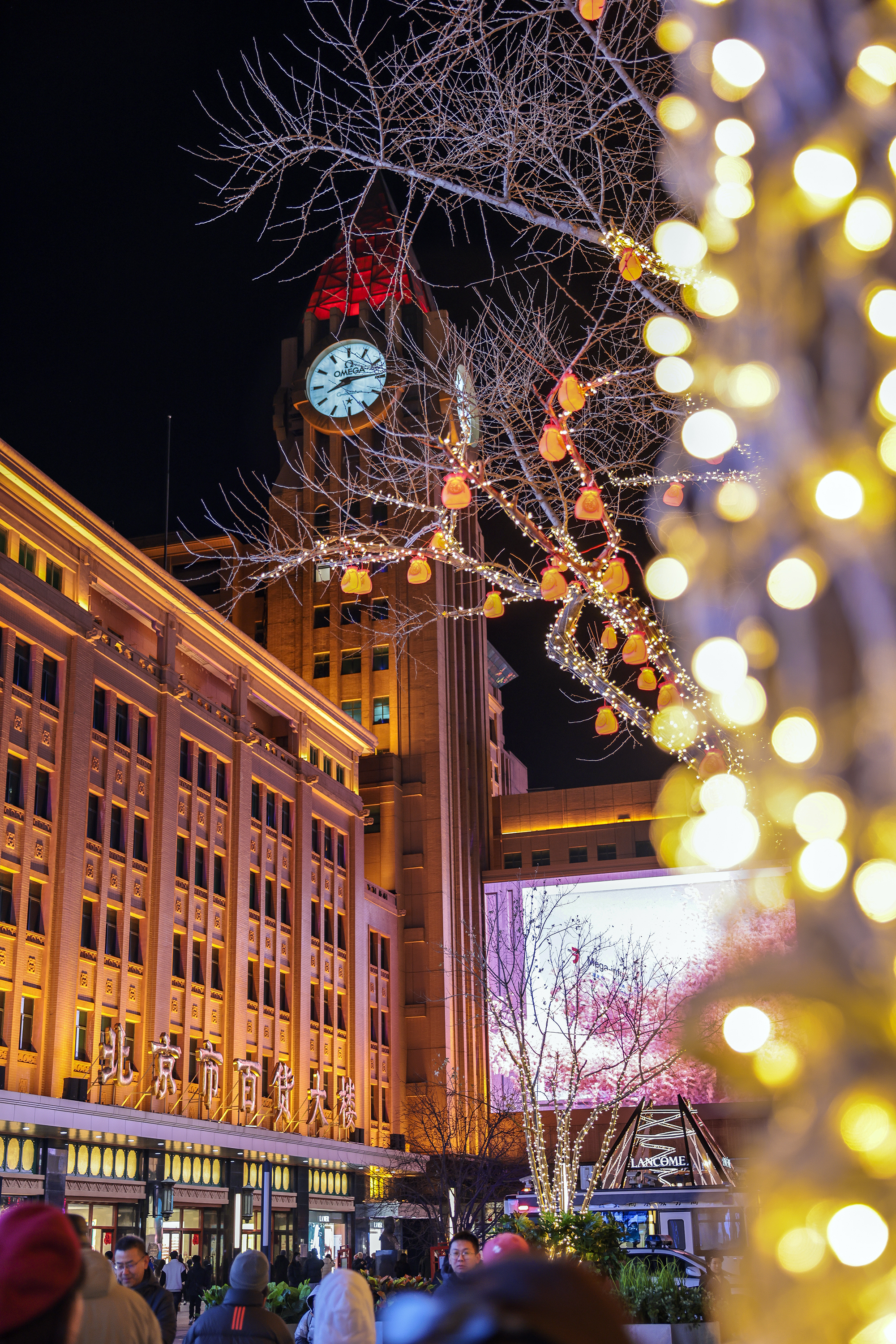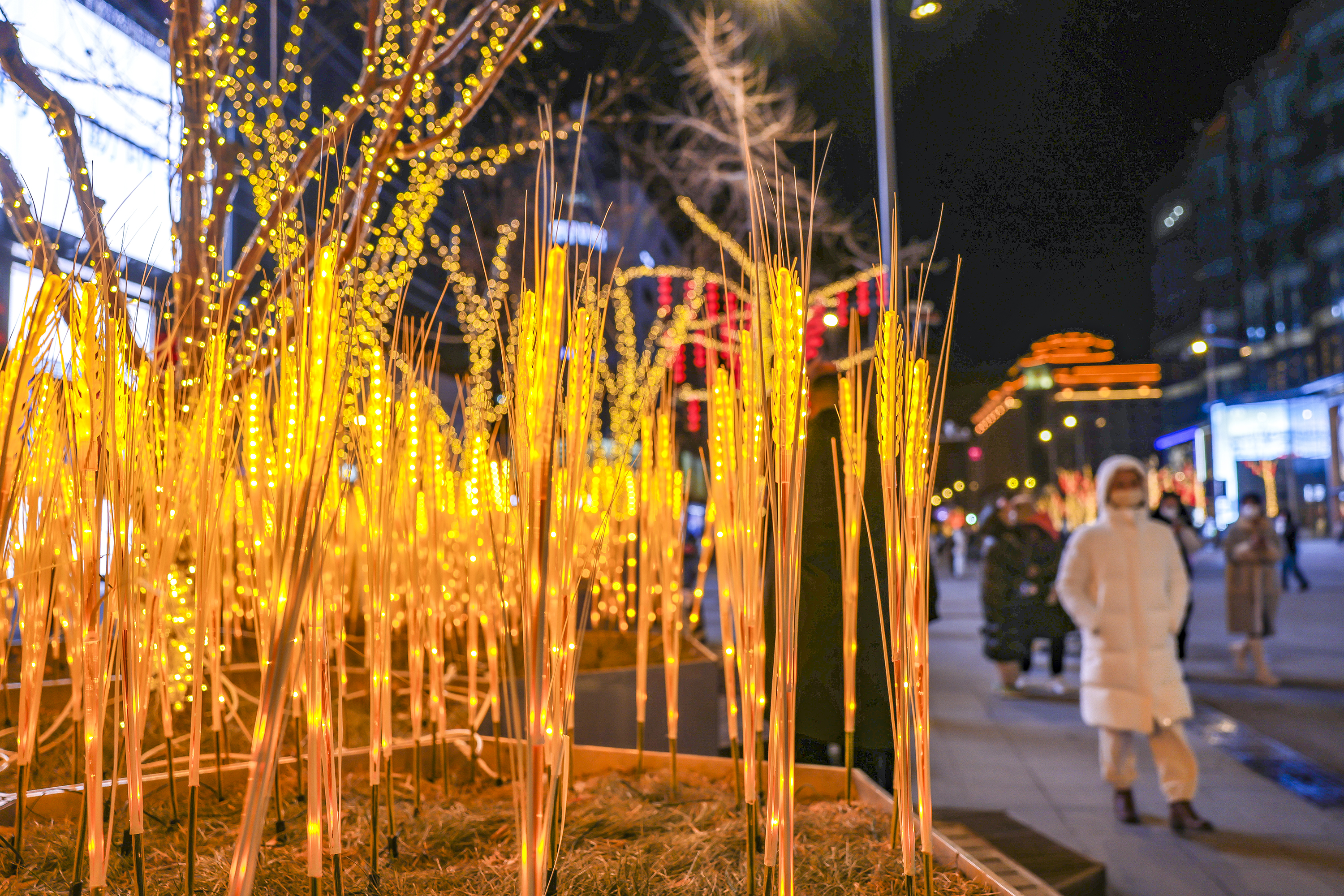 夜幕降临,王府井步行街被各色彩灯妆点得分外璀璨。灯笼、福袋和麦穗造型灯在夜色中熠熠生辉,寓意着对新年的美好期盼。市民游客漫步其间,感受着浓浓的节日氛围。