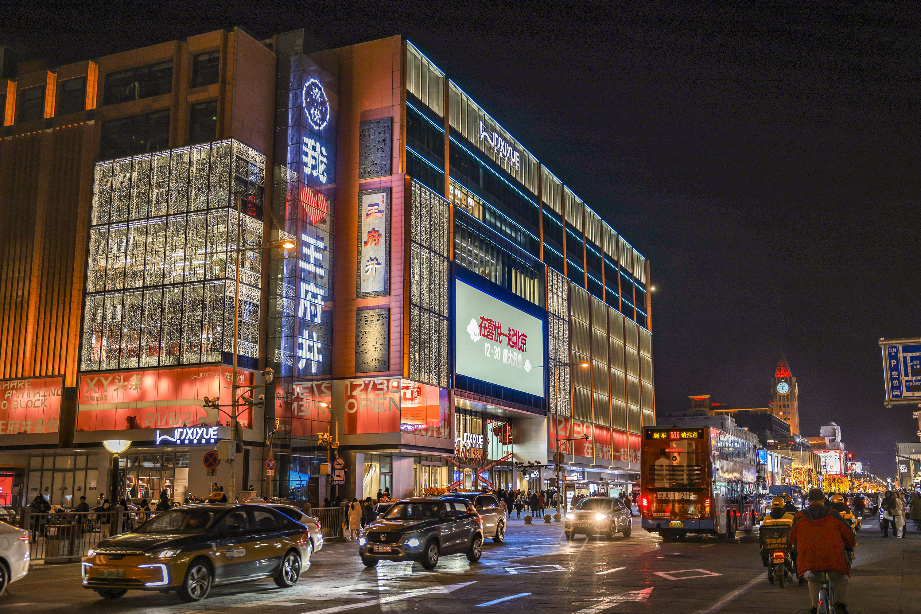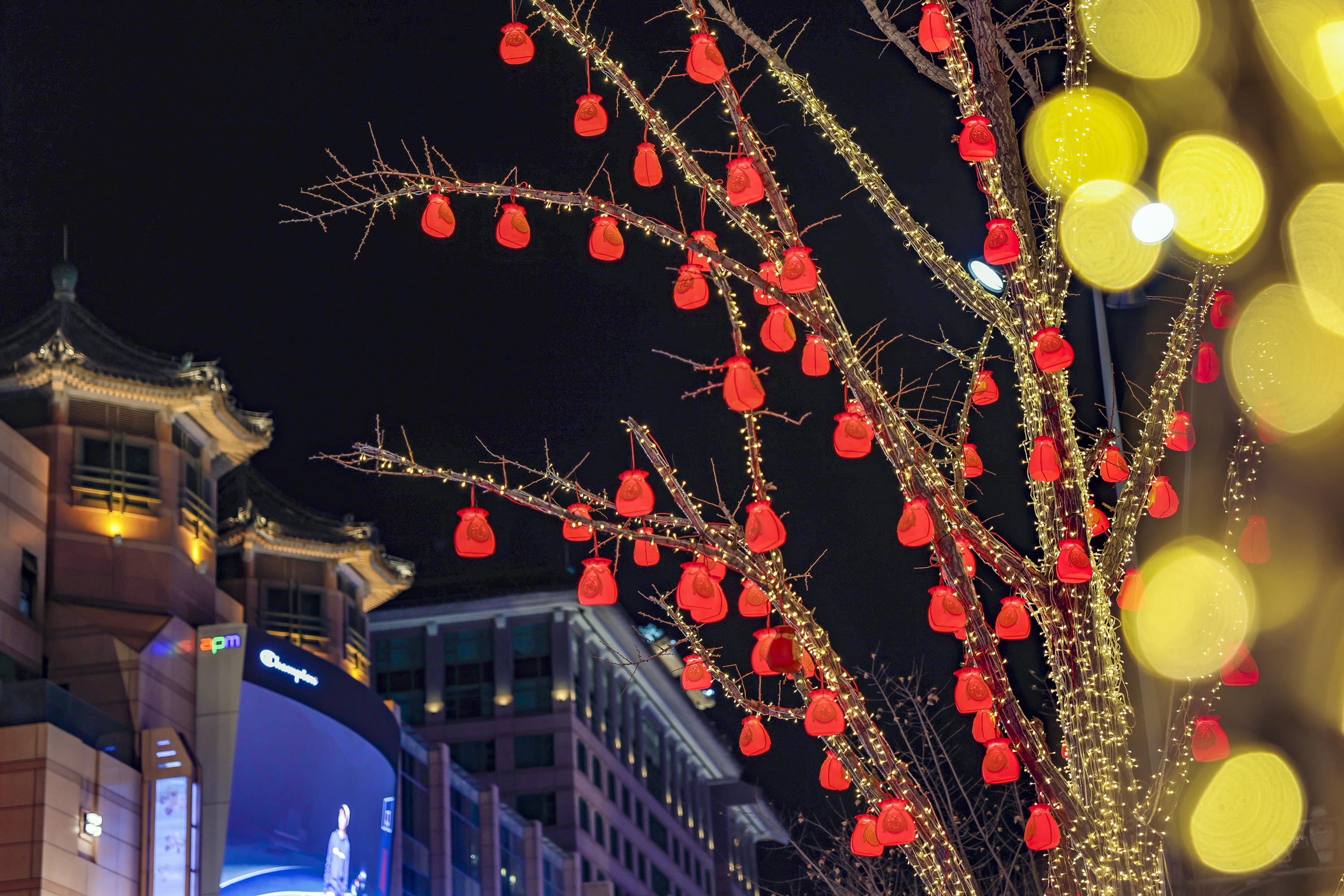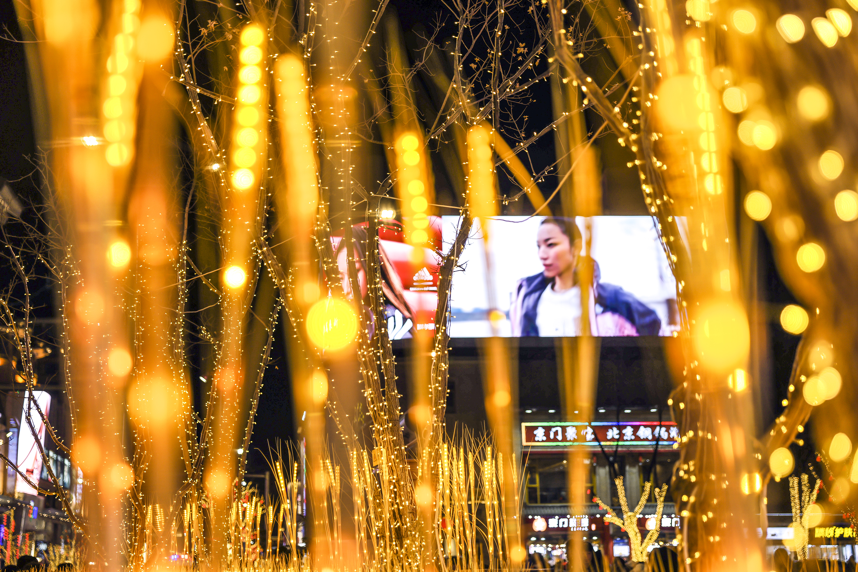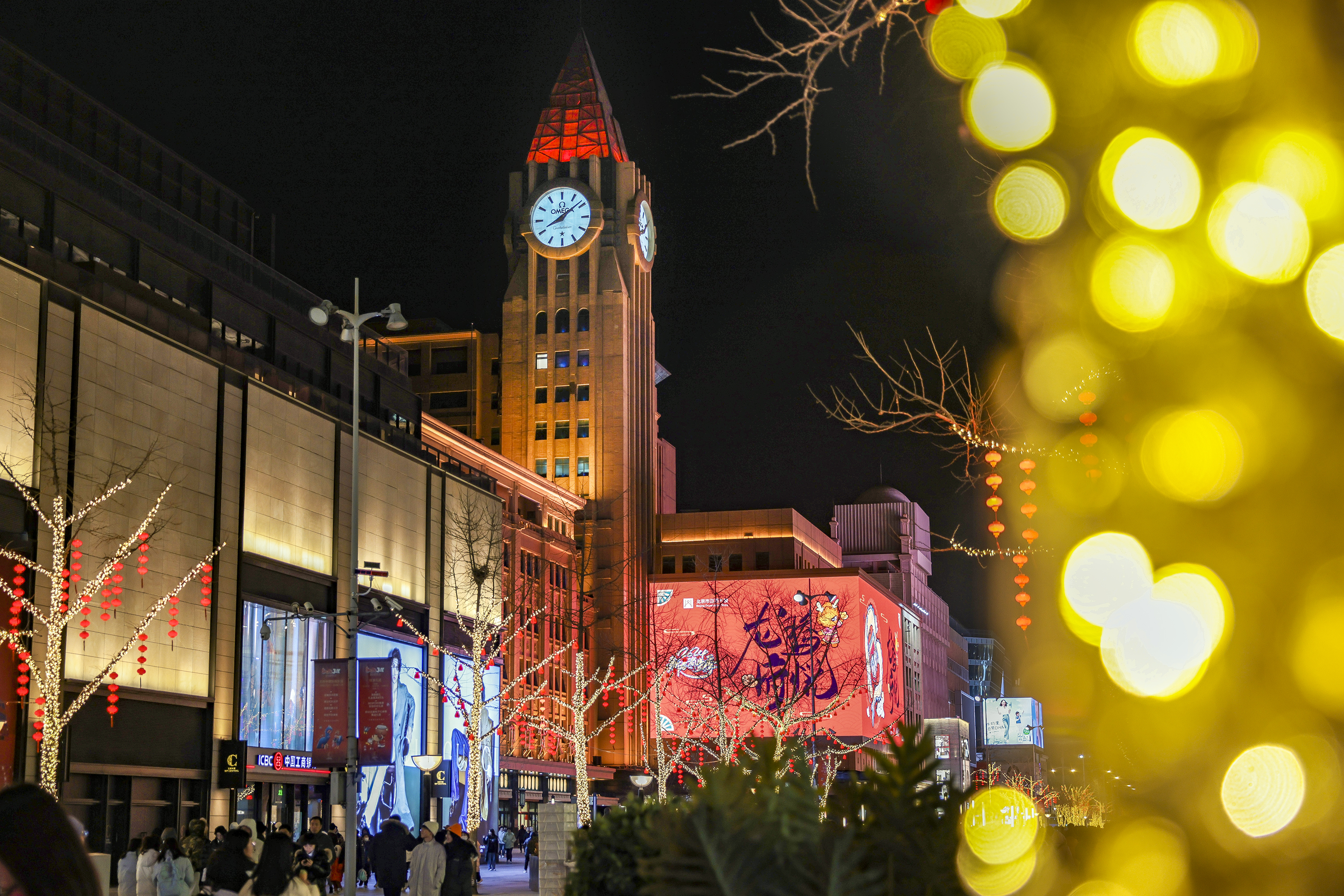 夜幕降临,王府井步行街被各色彩灯妆点得分外璀璨。灯笼、福袋和麦穗造型灯在夜色中熠熠生辉,寓意着对新年的美好期盼。市民游客漫步其间,感受着浓浓的节日氛围。