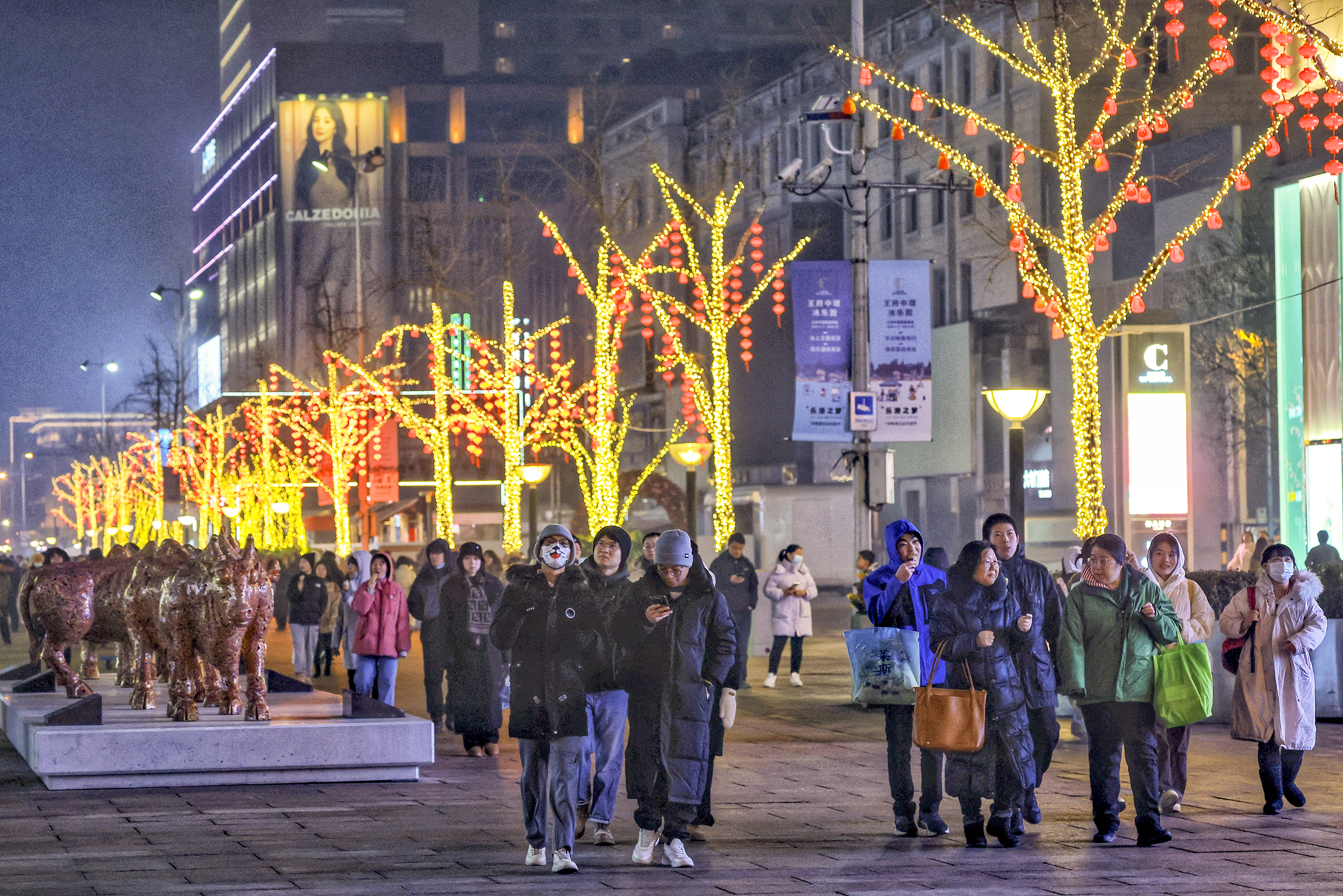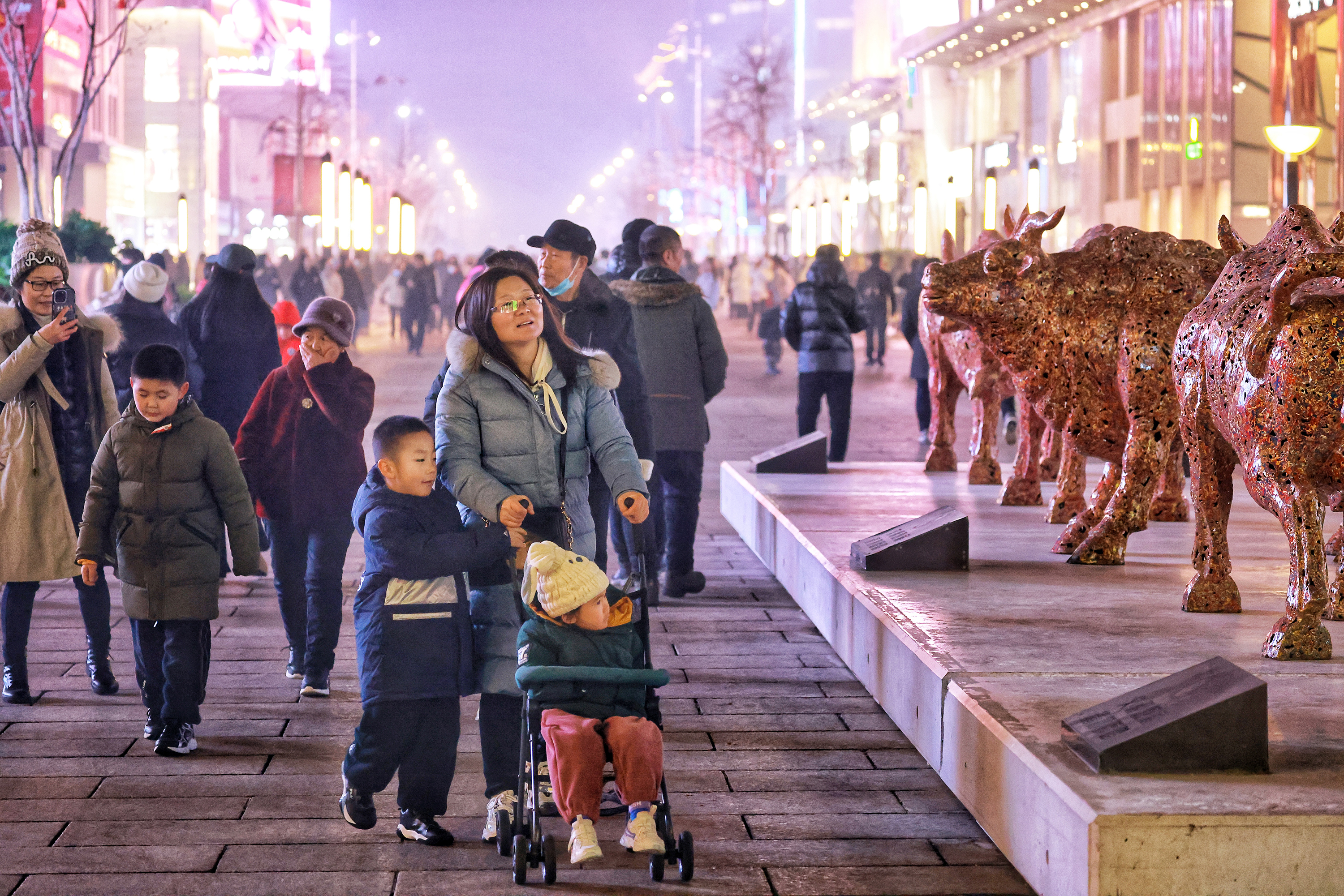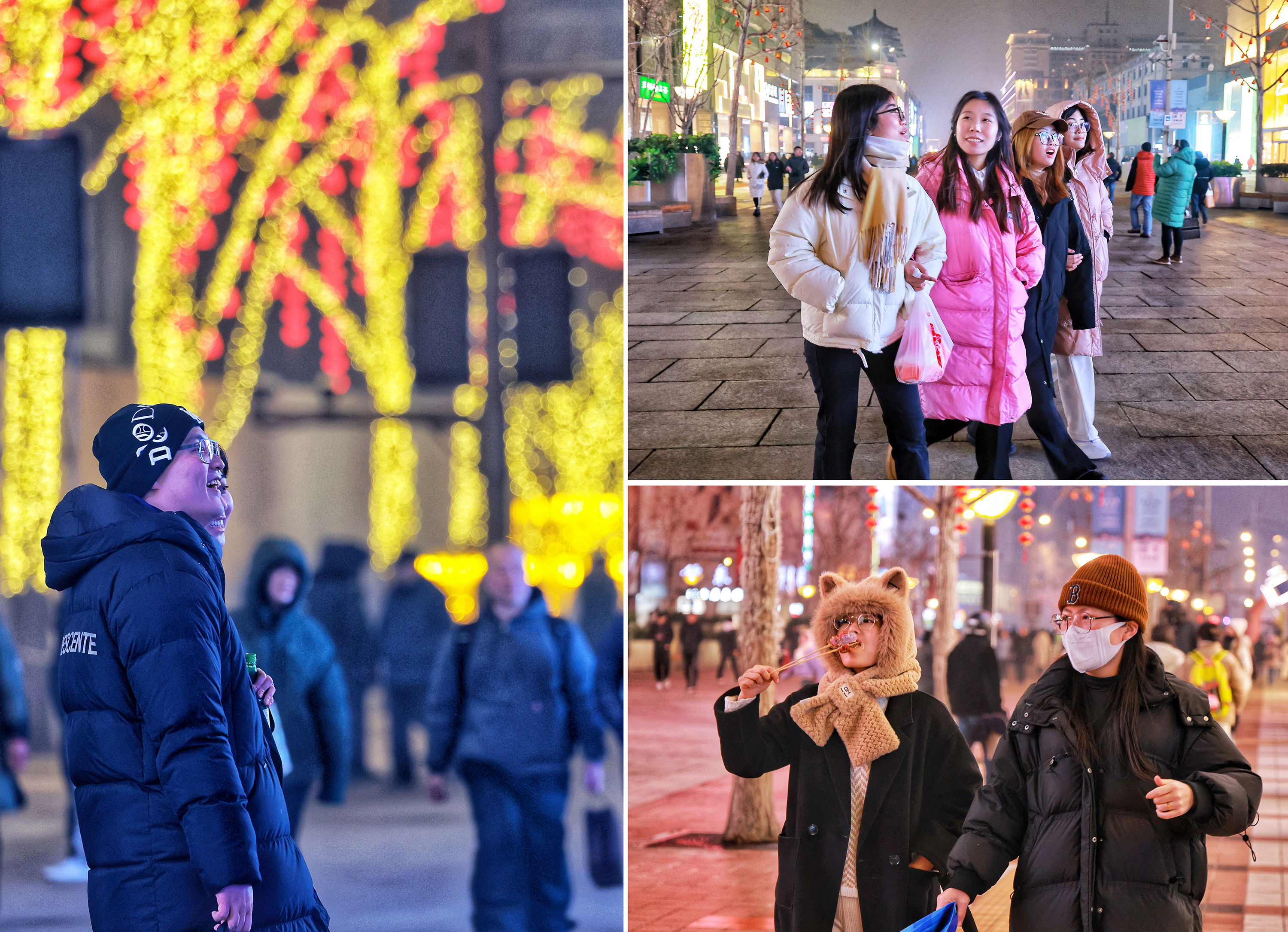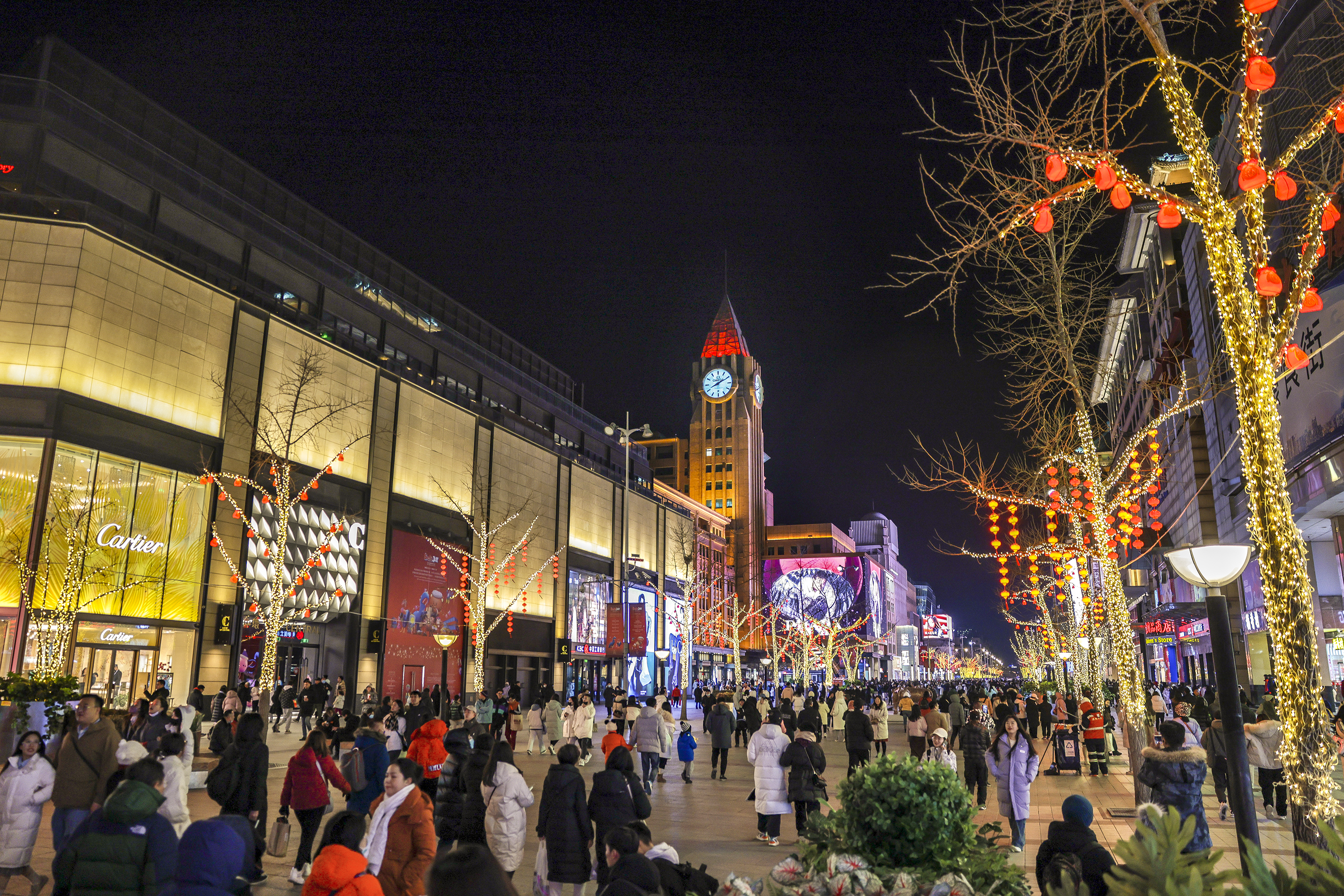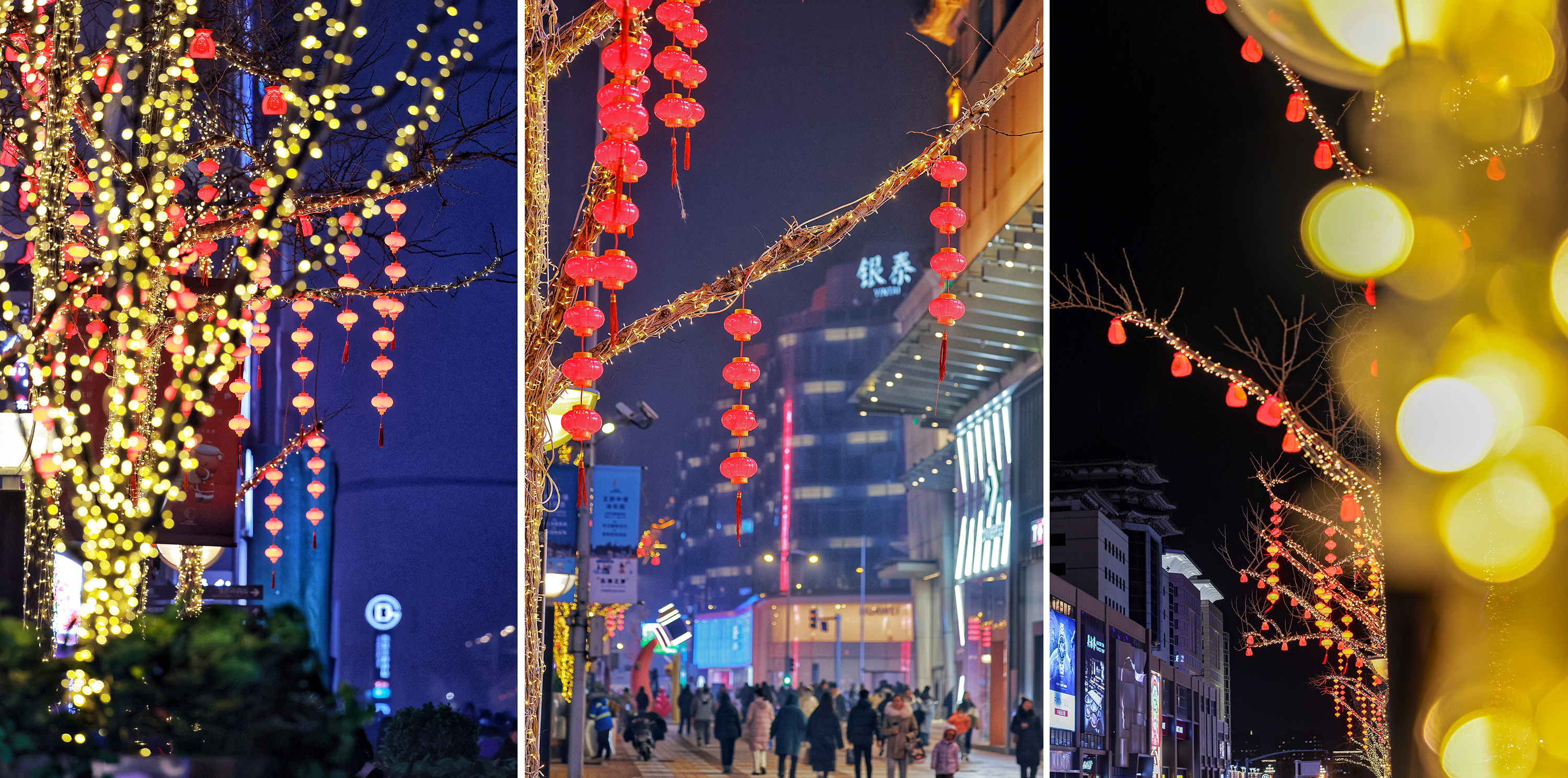 夜幕降临,王府井步行街被各色彩灯妆点得分外璀璨。灯笼、福袋和麦穗造型灯在夜色中熠熠生辉,寓意着对新年的美好期盼。市民游客漫步其间,感受着浓浓的节日氛围。