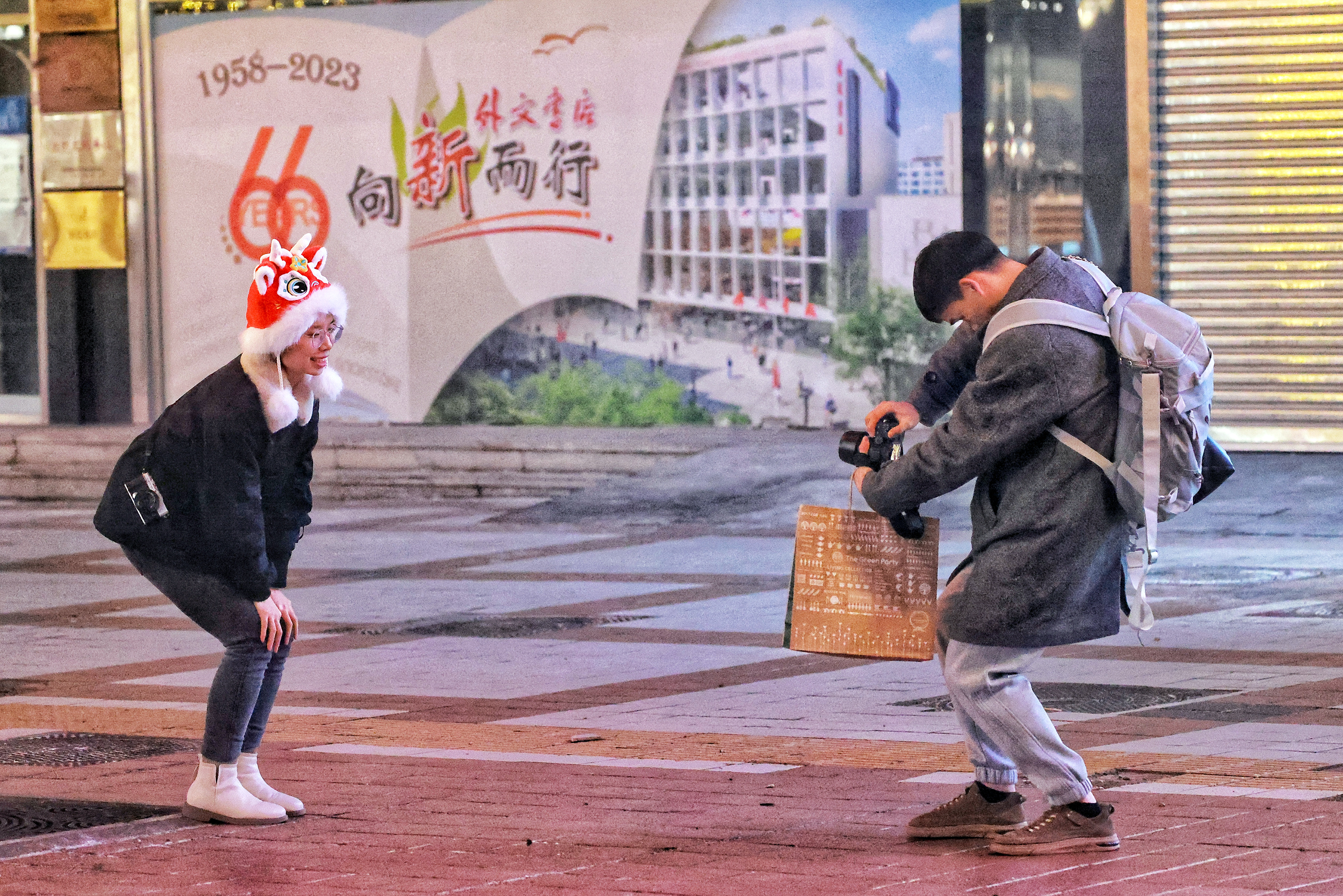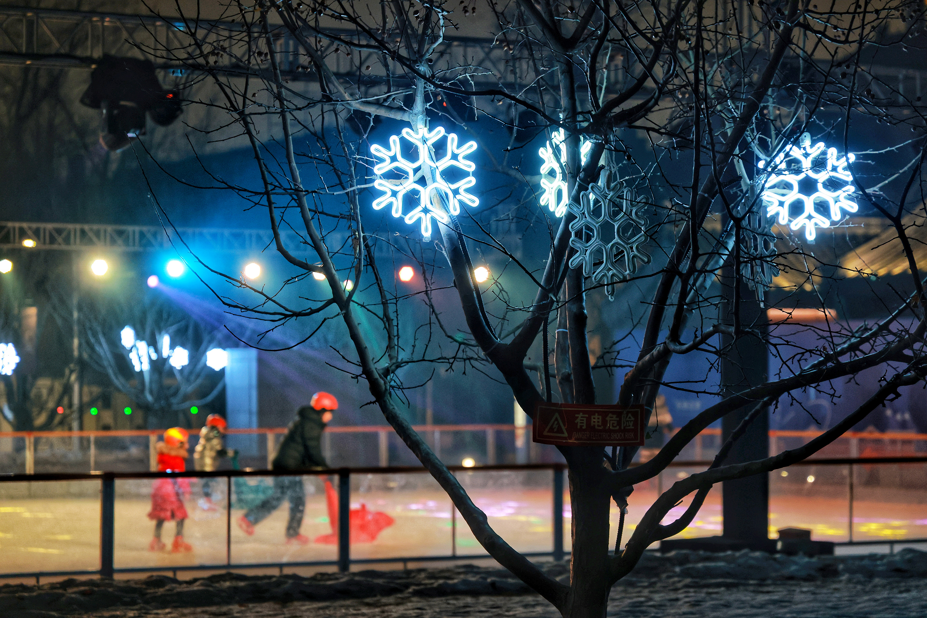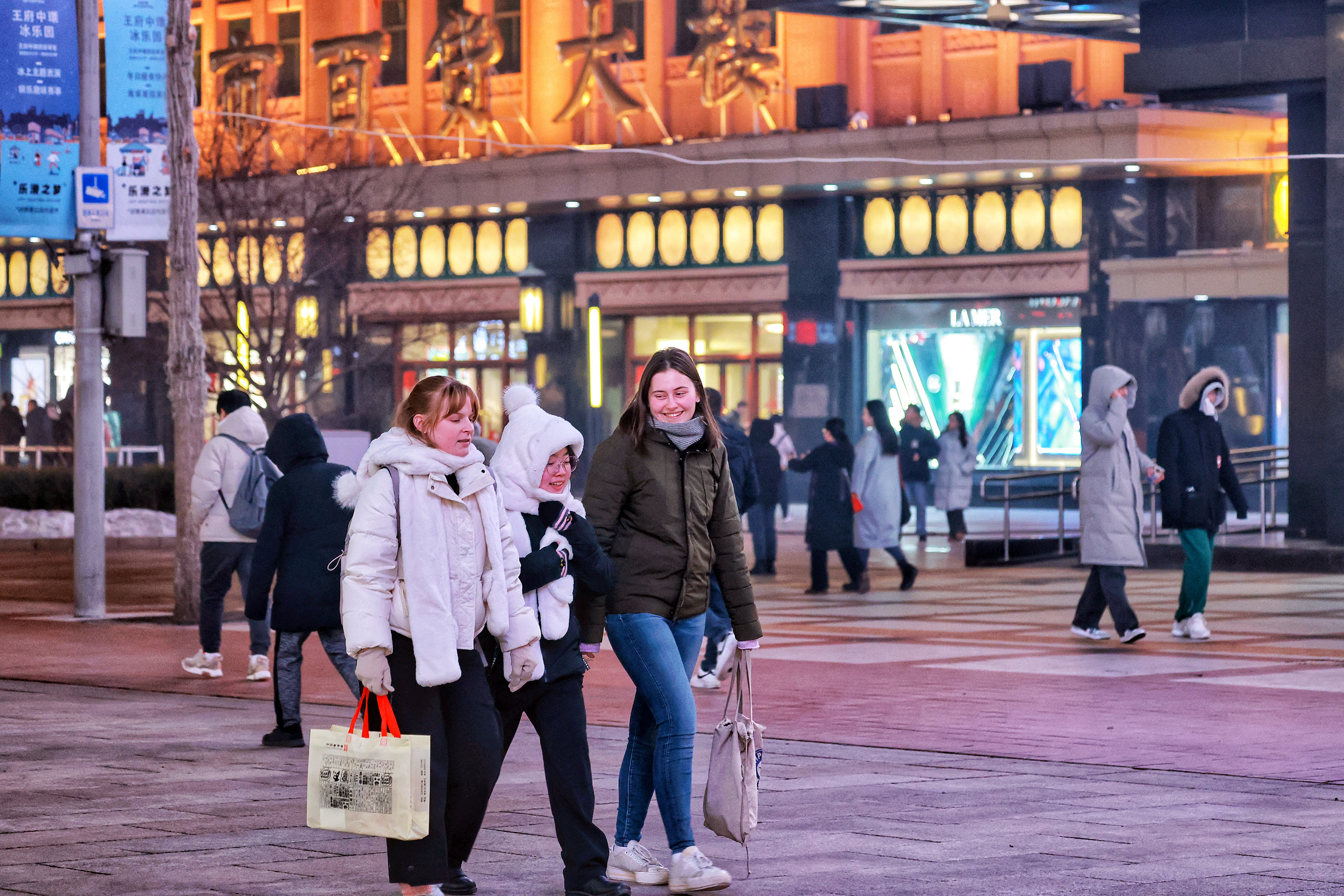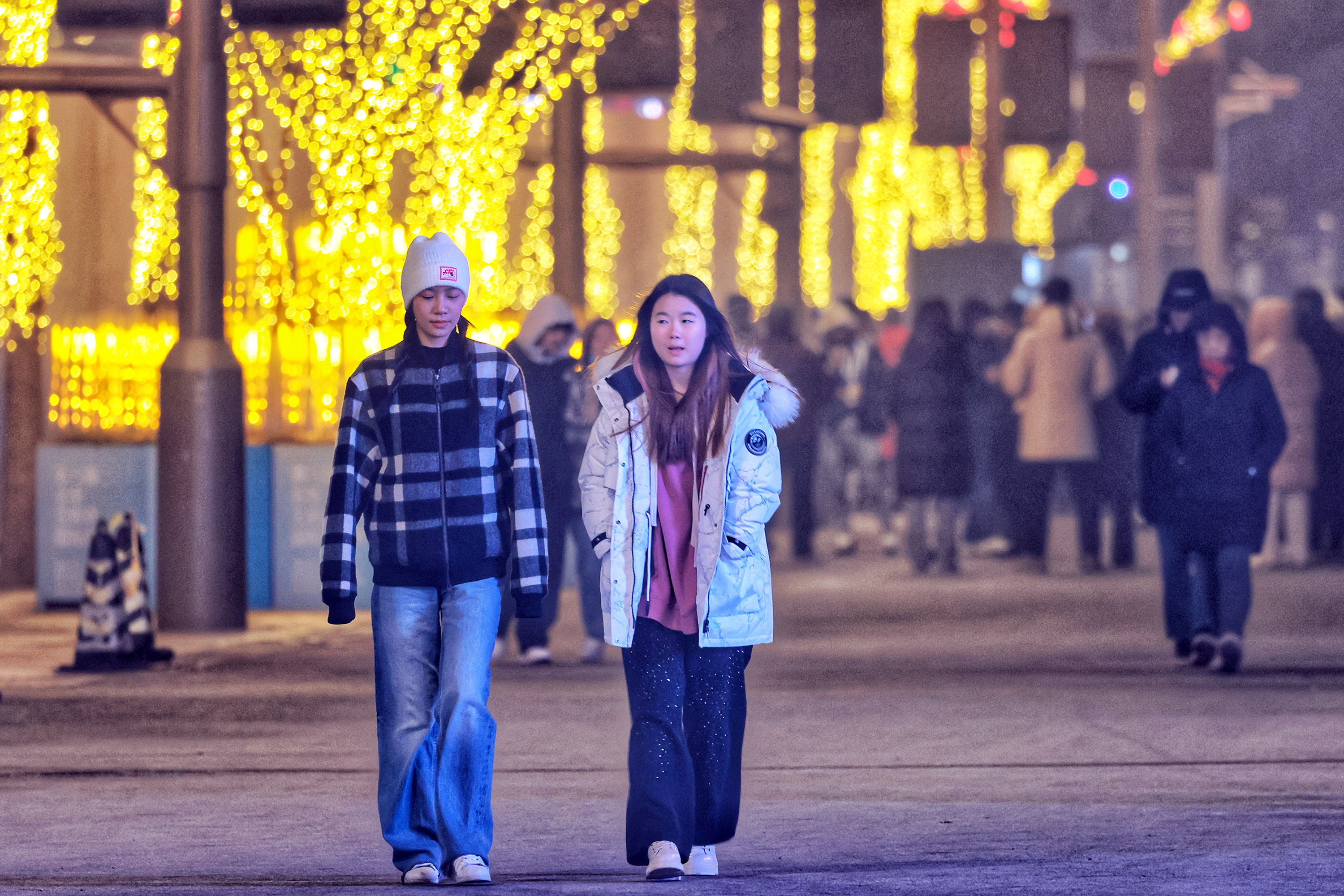 夜幕降临,王府井步行街被各色彩灯妆点得分外璀璨。灯笼、福袋和麦穗造型灯在夜色中熠熠生辉,寓意着对新年的美好期盼。市民游客漫步其间,感受着浓浓的节日氛围。