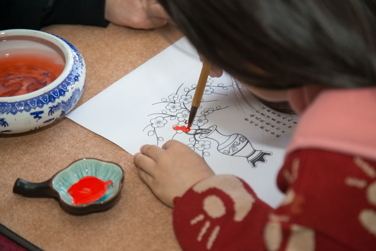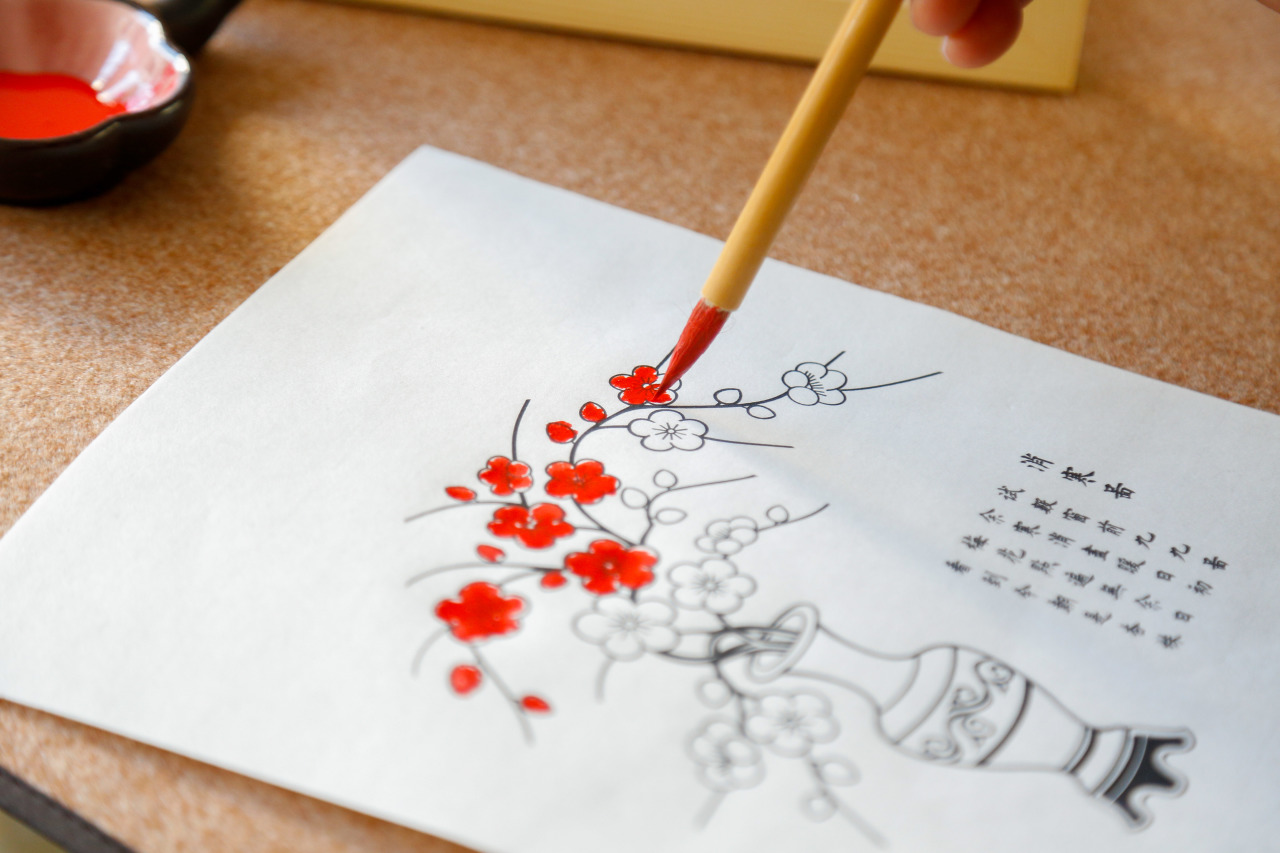 《帝京景物略》载:“冬至日,画素梅一枝,为瓣八十有一,日染一瓣,瓣尽而九九出,则春深矣,曰‘九九消寒图’”。手绘寒梅九九消寒图,以冬盼春,细数九九八十一天,静待春回。笔画描摹,点朱着墨,感受古人园居雅韵。