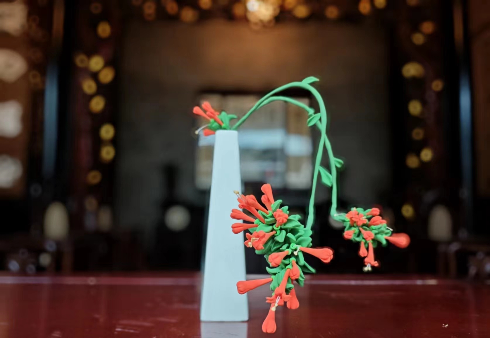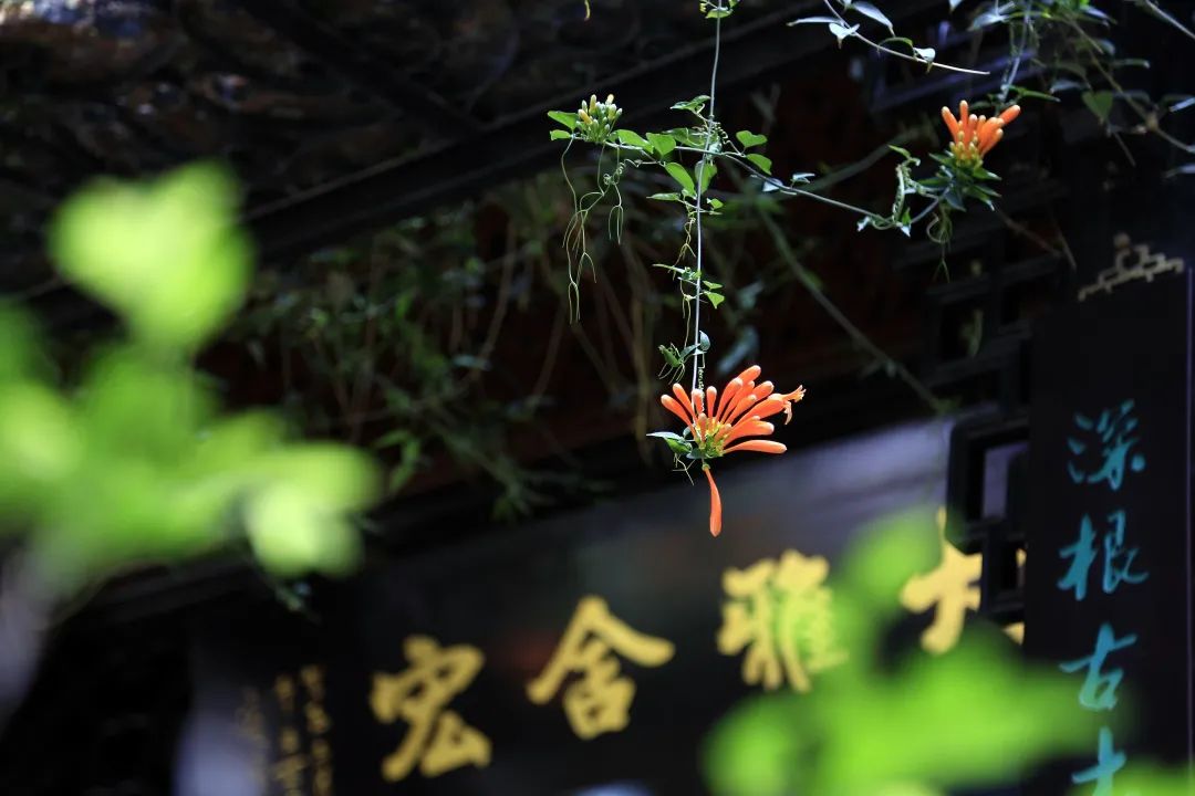 园博馆室内展园余荫山房,深柳堂前种有炮仗花古藤,炮仗花形似炮竹,与我国传统文化也十分契合。炮仗花盛开于新年,满墙的炮仗花如同怒放的焰火,给花园、庭院带来浓郁的节日气氛,因此在华南地区,家家户户门口爱种植它,以轻黏土制作一朵炮仗花,遥寄南国的春色。