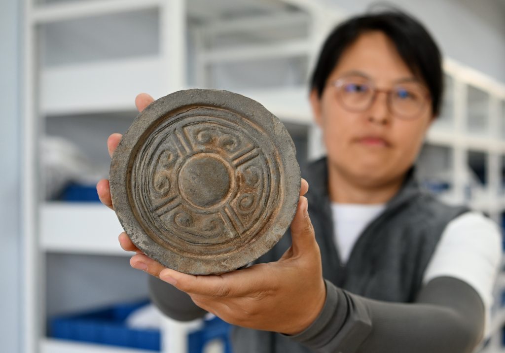 2023年10月8日,考古队员展示柏人城遗址出土的瓦当。新华社记者 牟宇 摄
